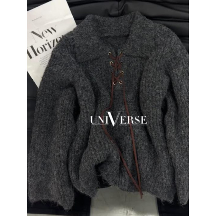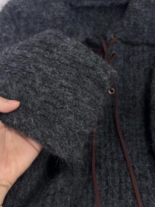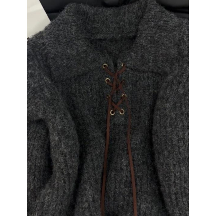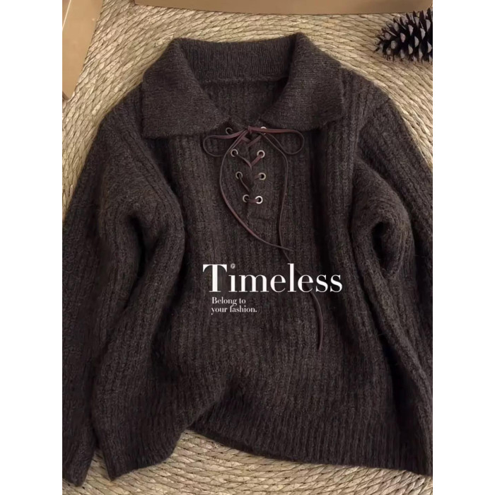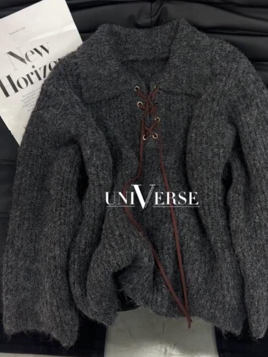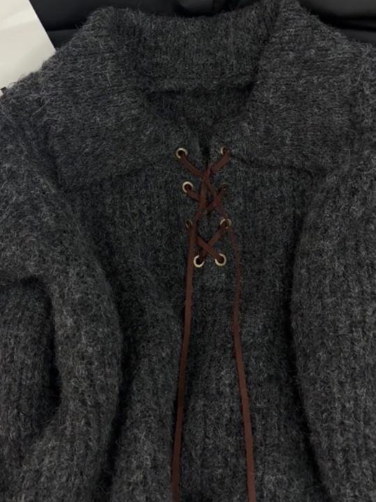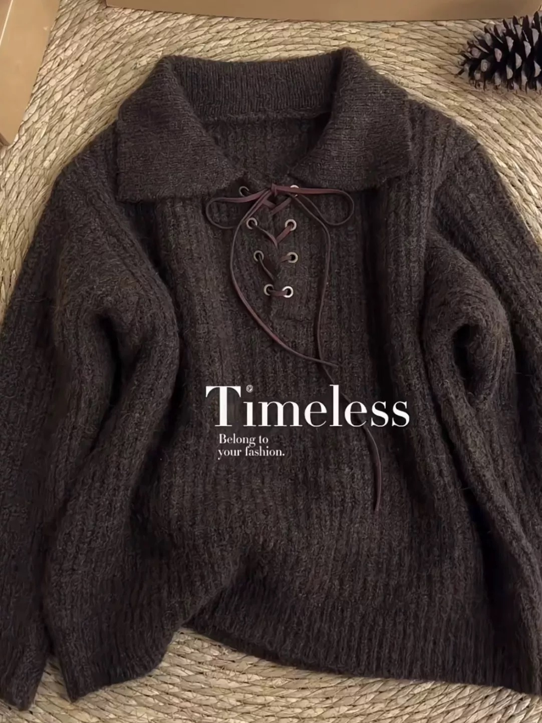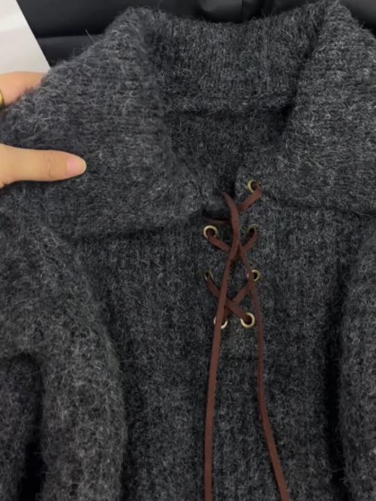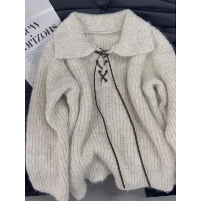 復古韓系高級感綁帶polo領厚毛衣女秋冬季慵懶寬松加厚針織衫上衣