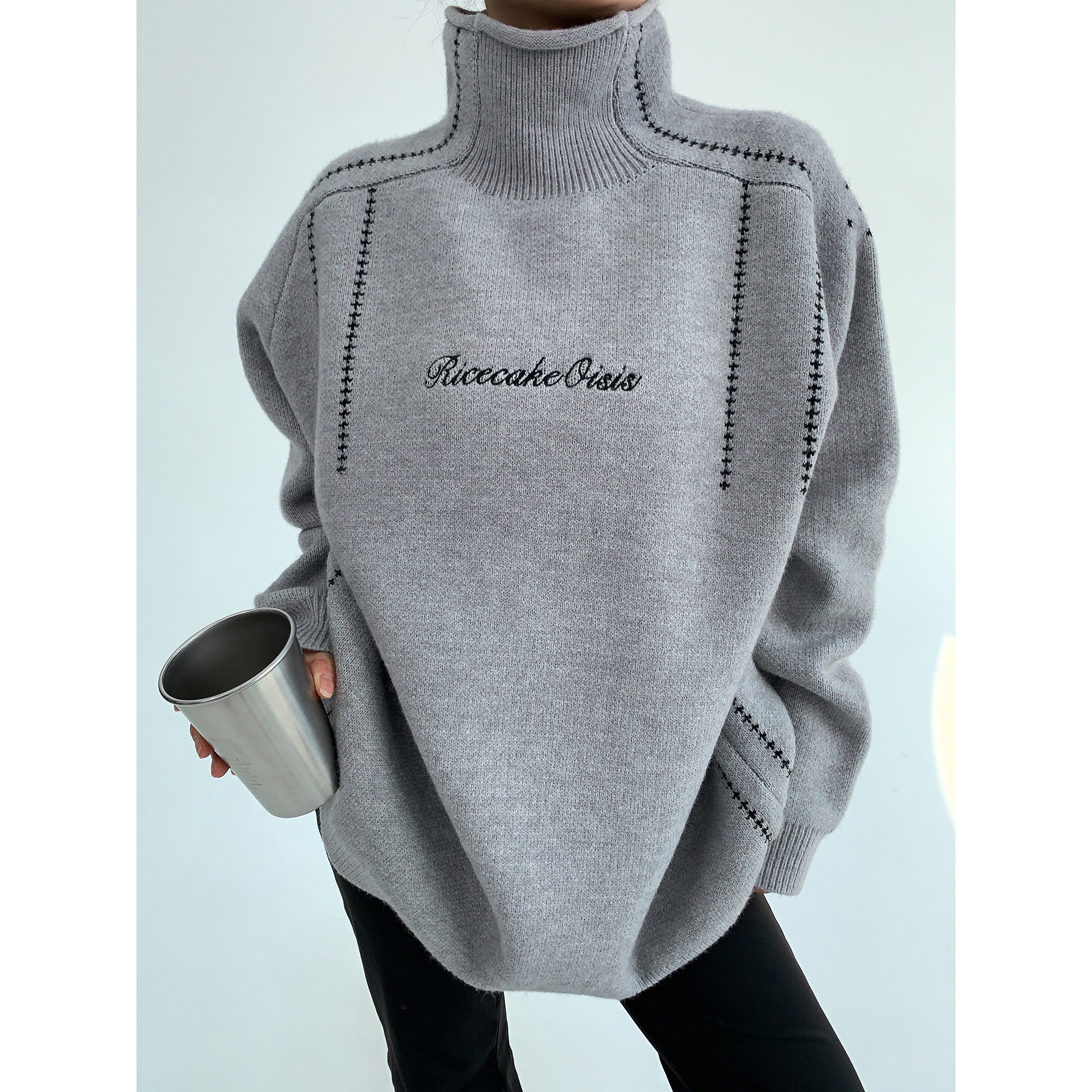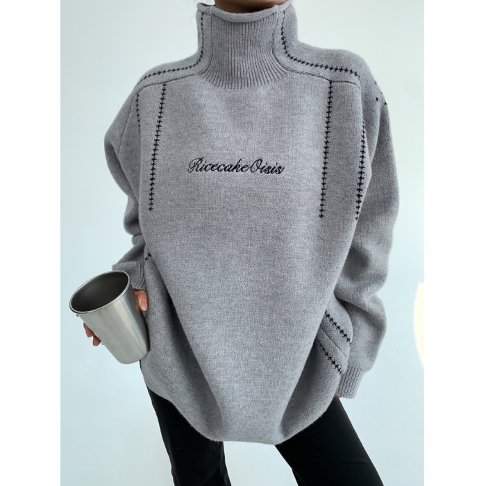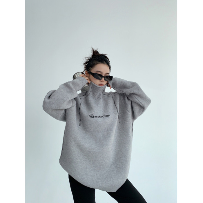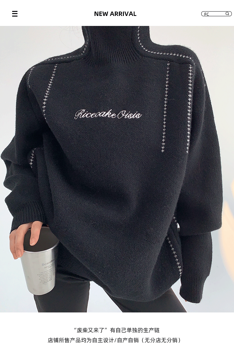 廢柴冬季韓系高級感加厚針織外套寬鬆復古慵嬾刺綉高領套頭毛衣女