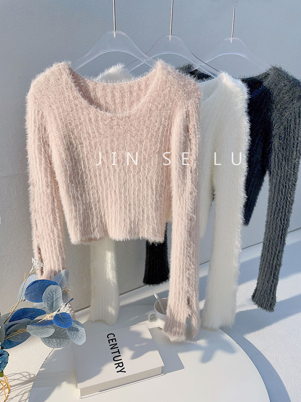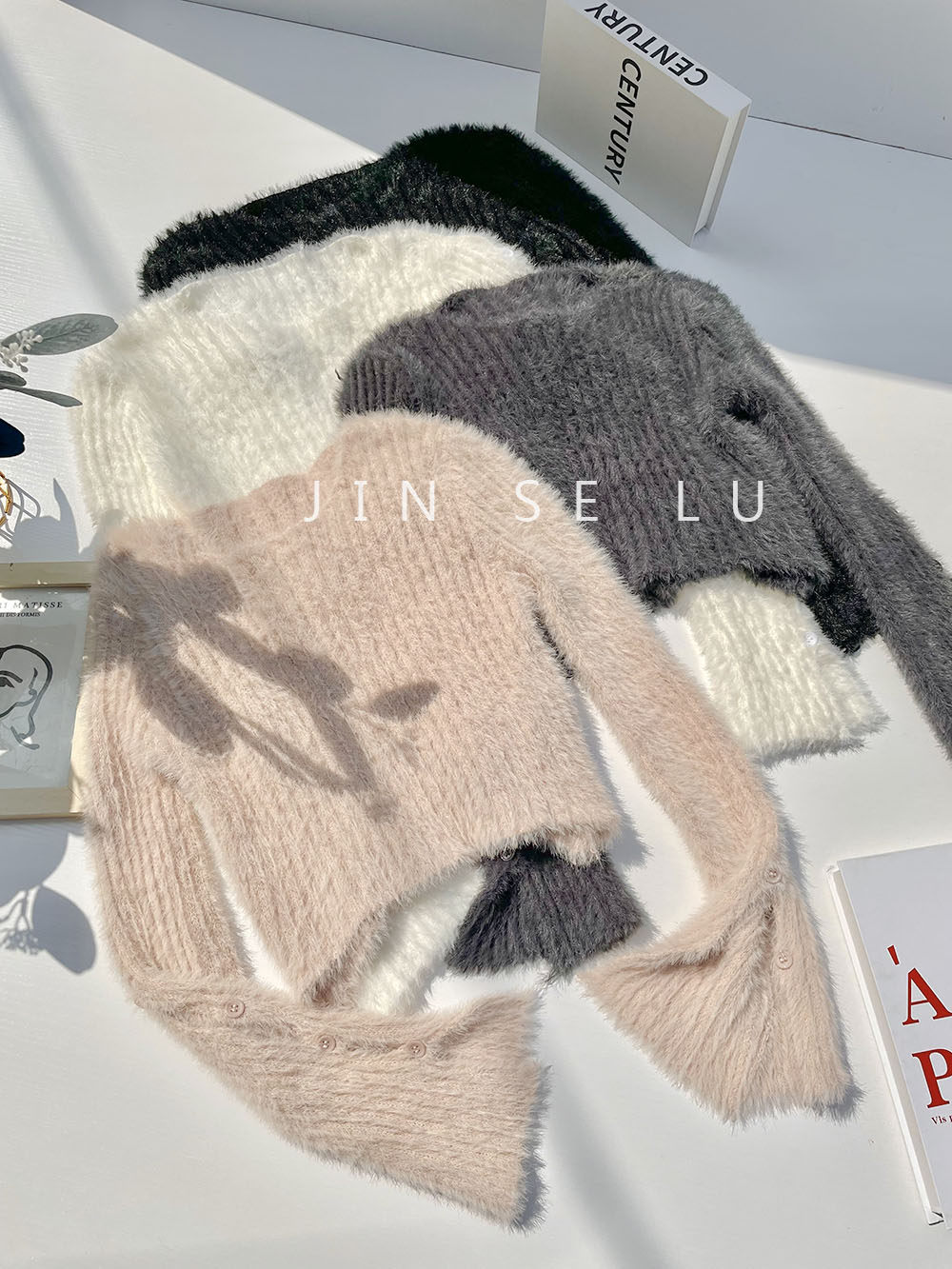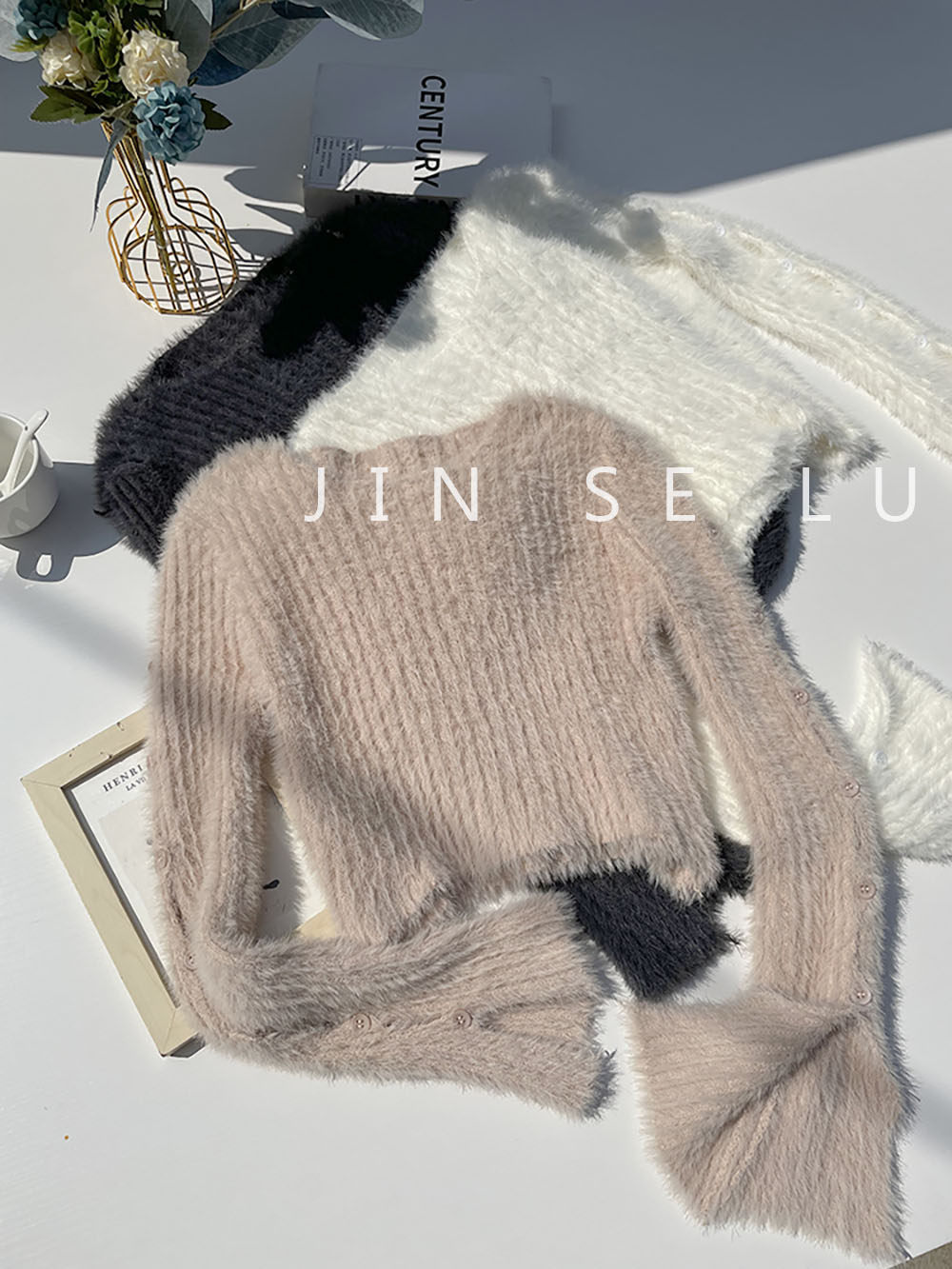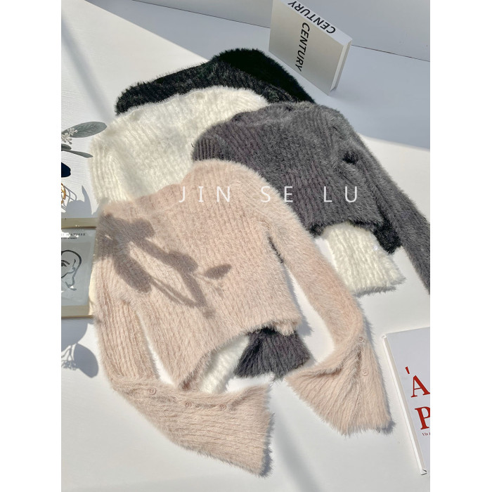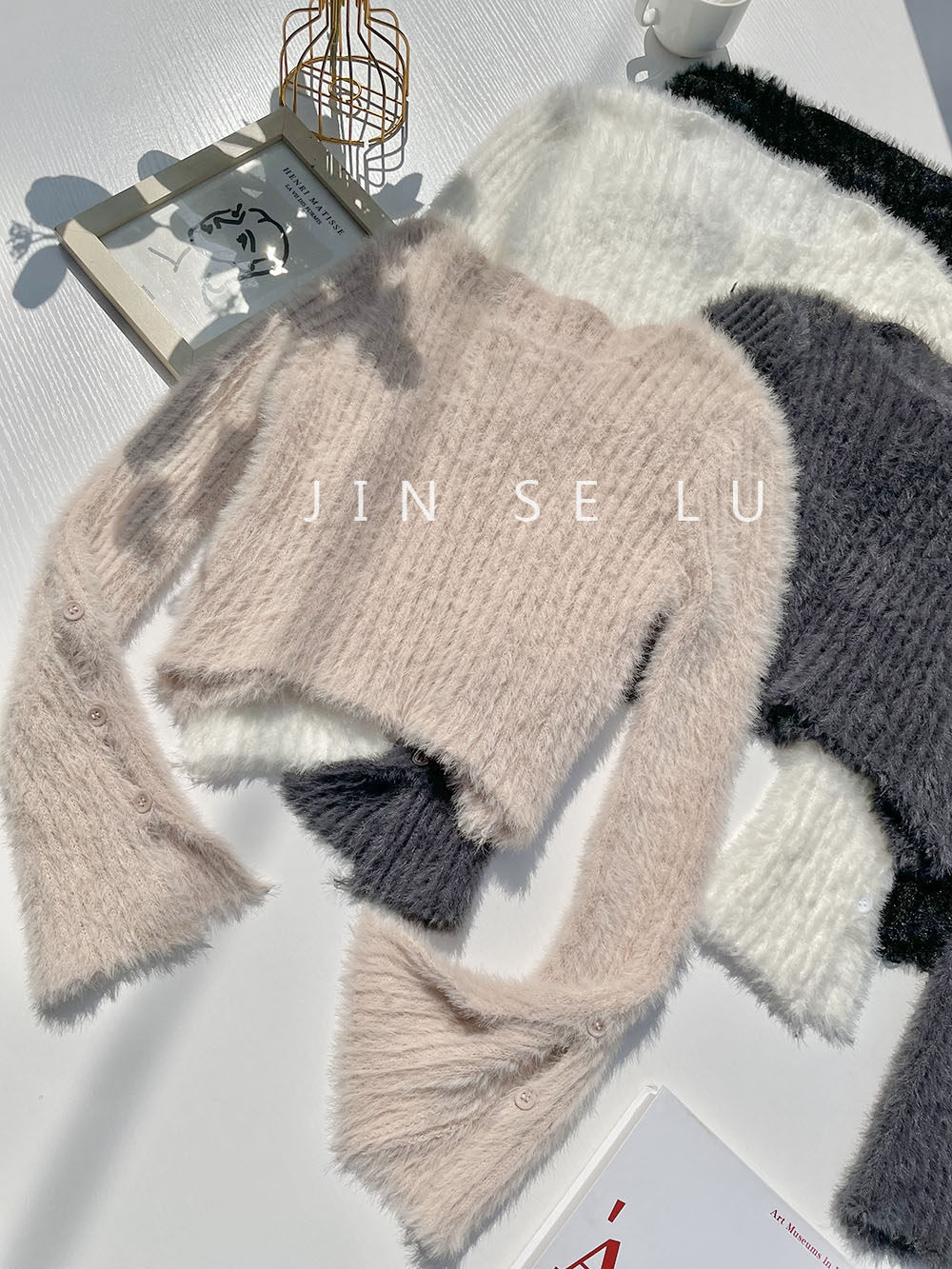 ins潮慵懶風短款水貂絨毛衣女設計感小衆紐釦喇叭袖修身針織衫冬