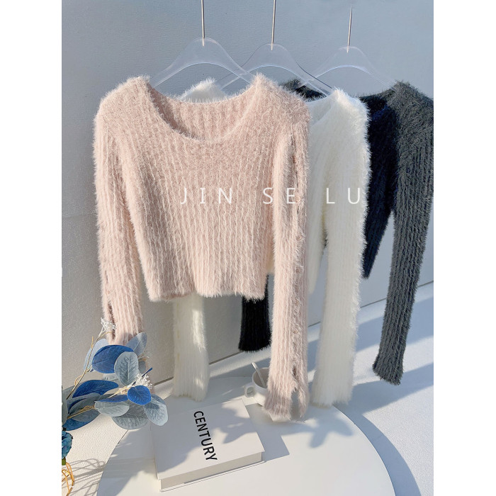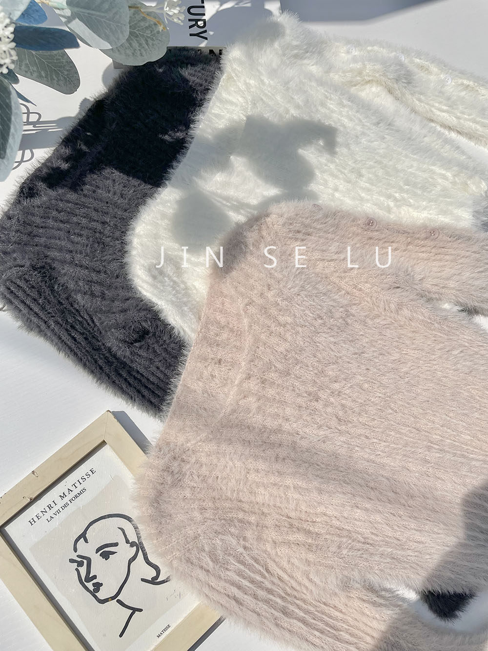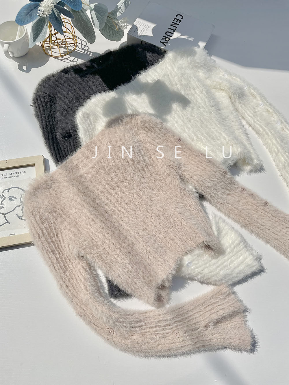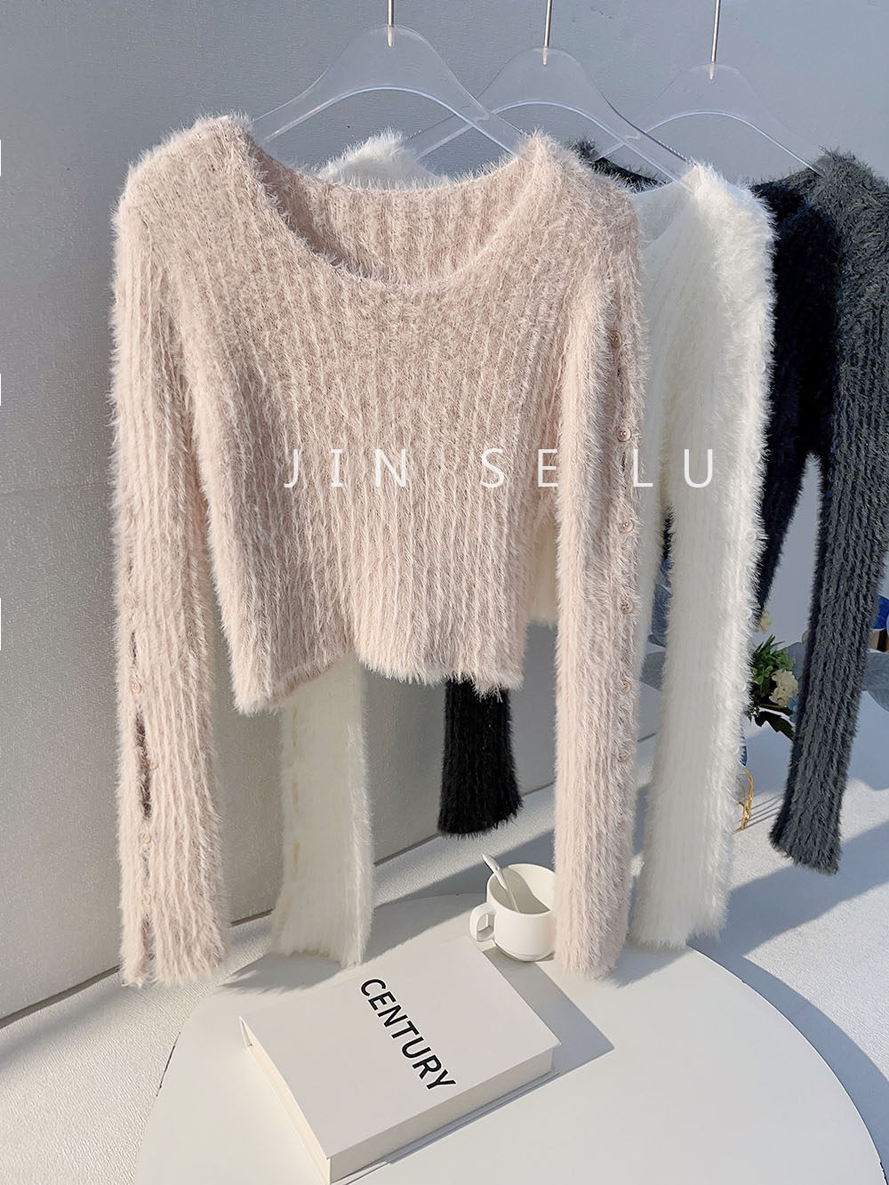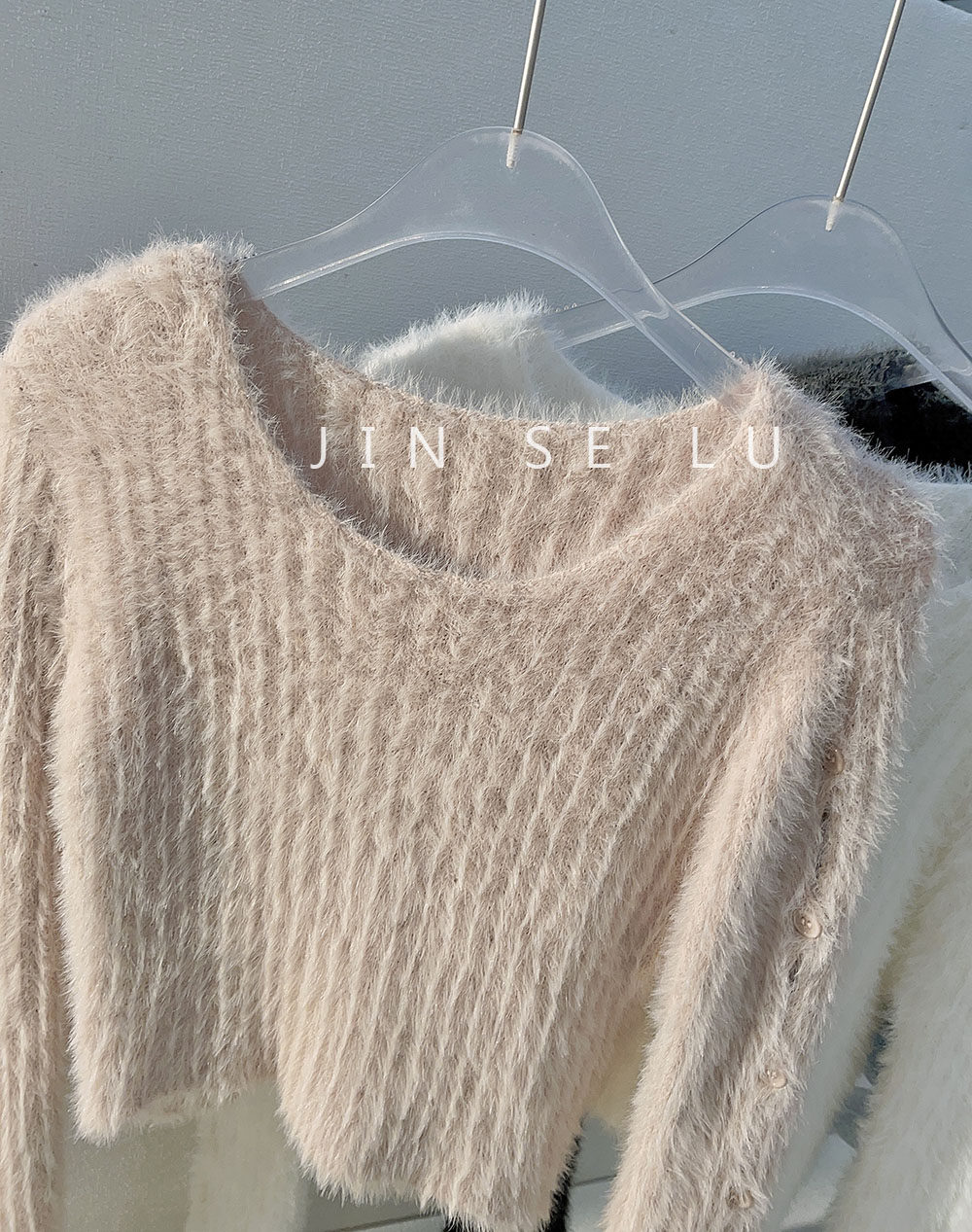 ins潮慵懶風短款水貂絨毛衣女設計感小衆紐釦喇叭袖修身針織衫冬