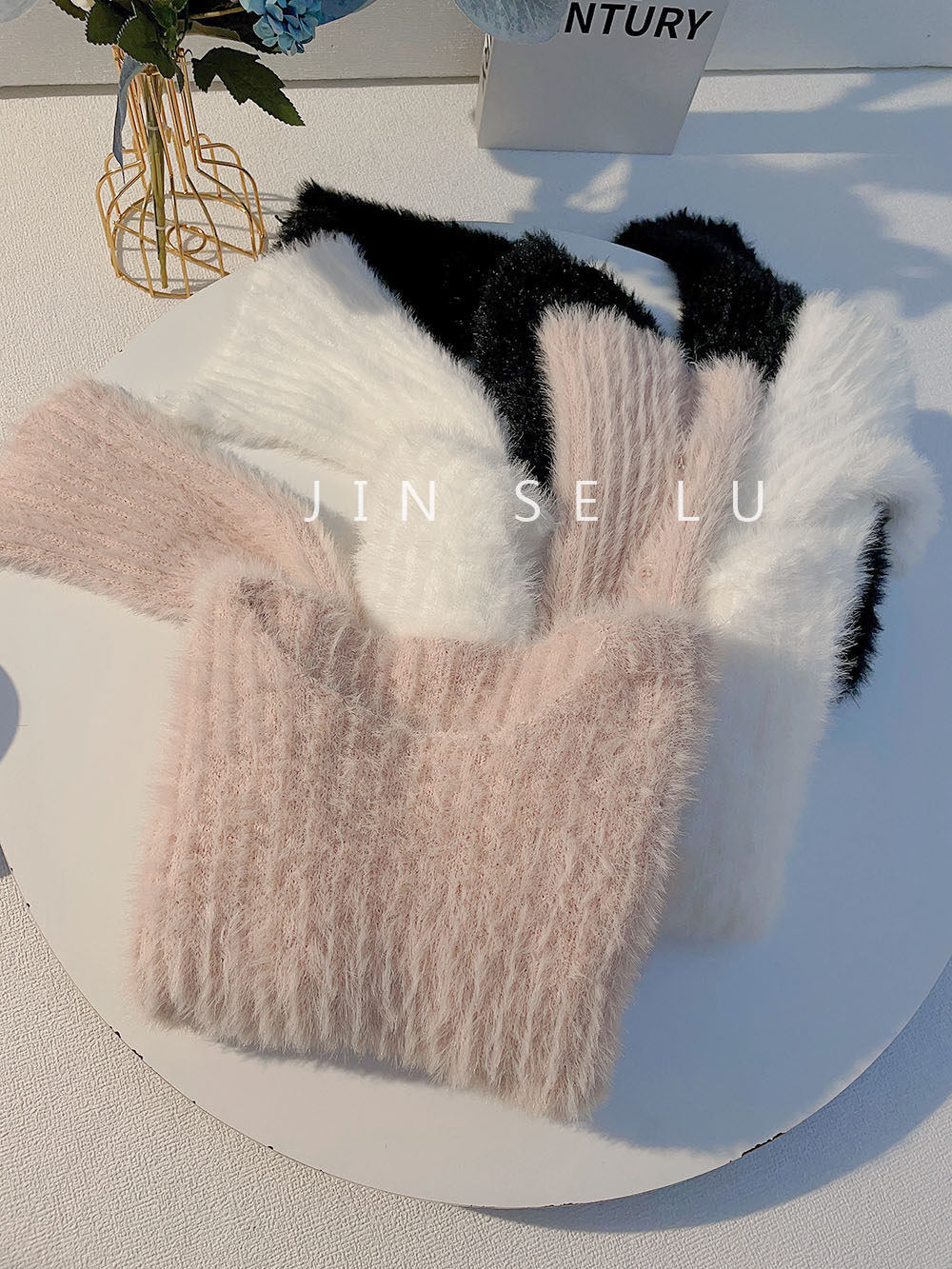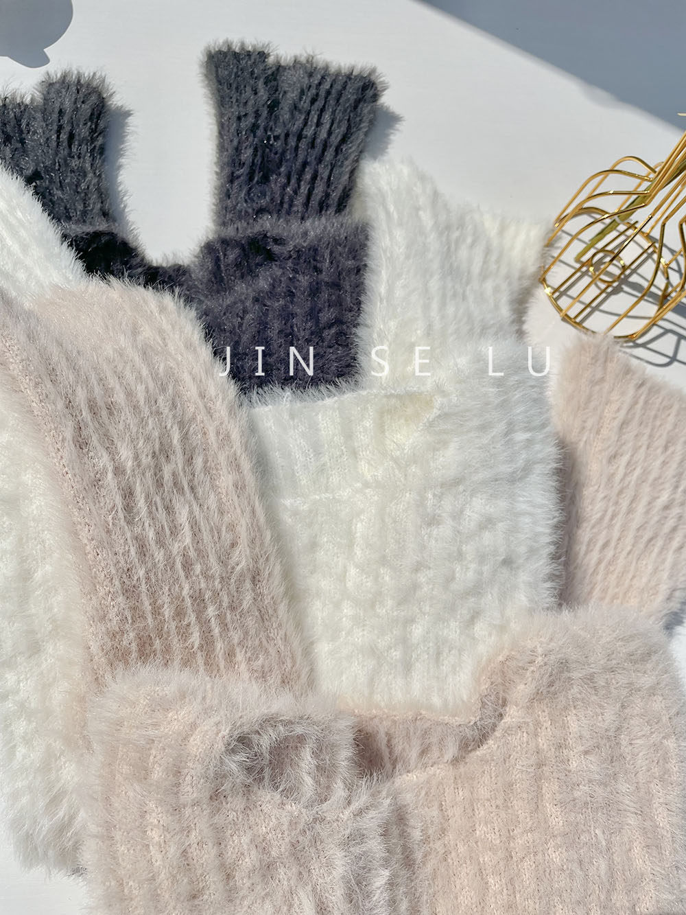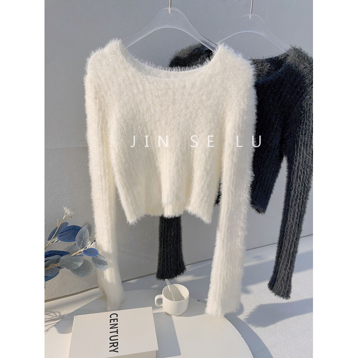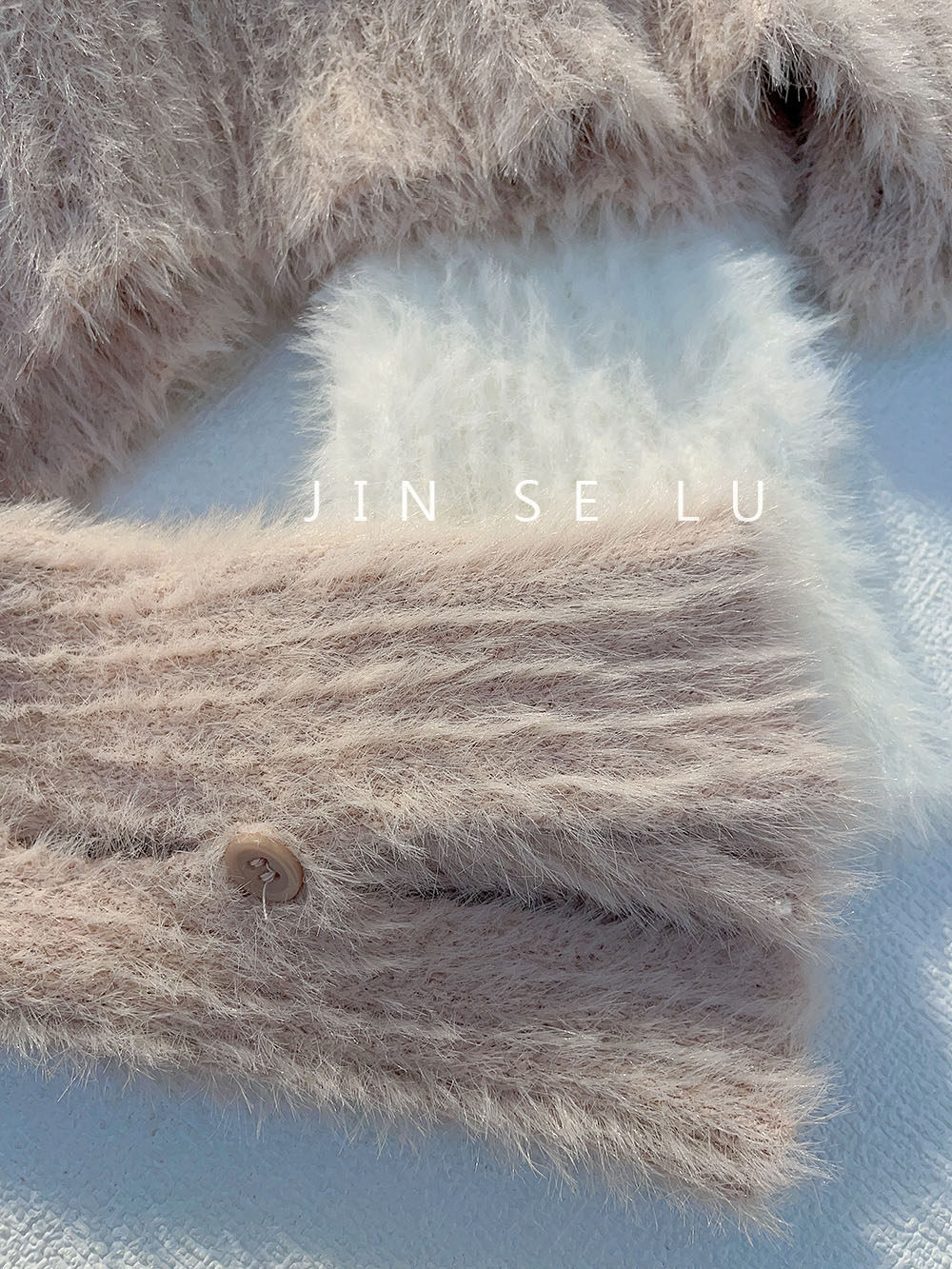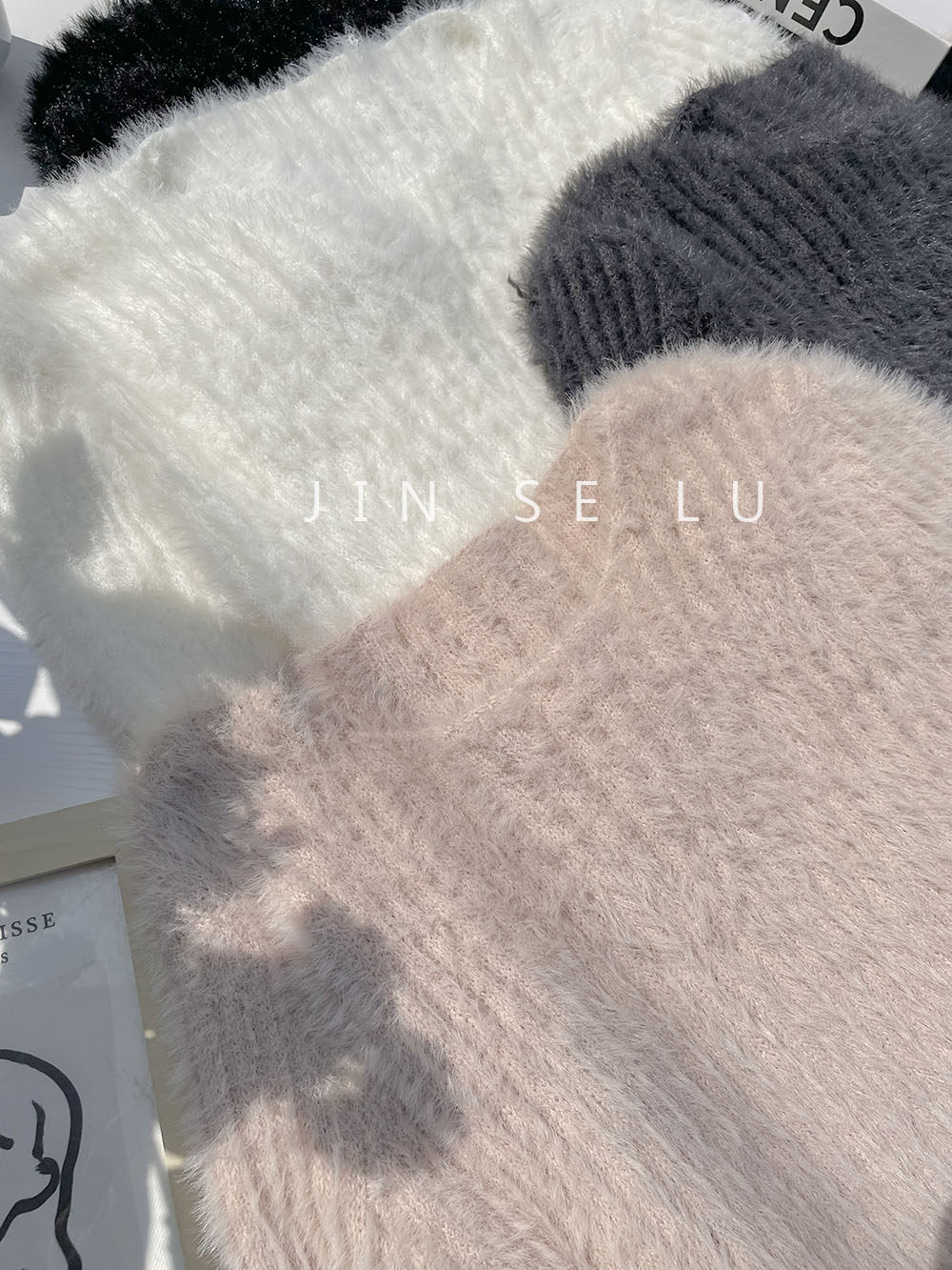 ins潮慵懶風短款水貂絨毛衣女設計感小衆紐釦喇叭袖修身針織衫冬