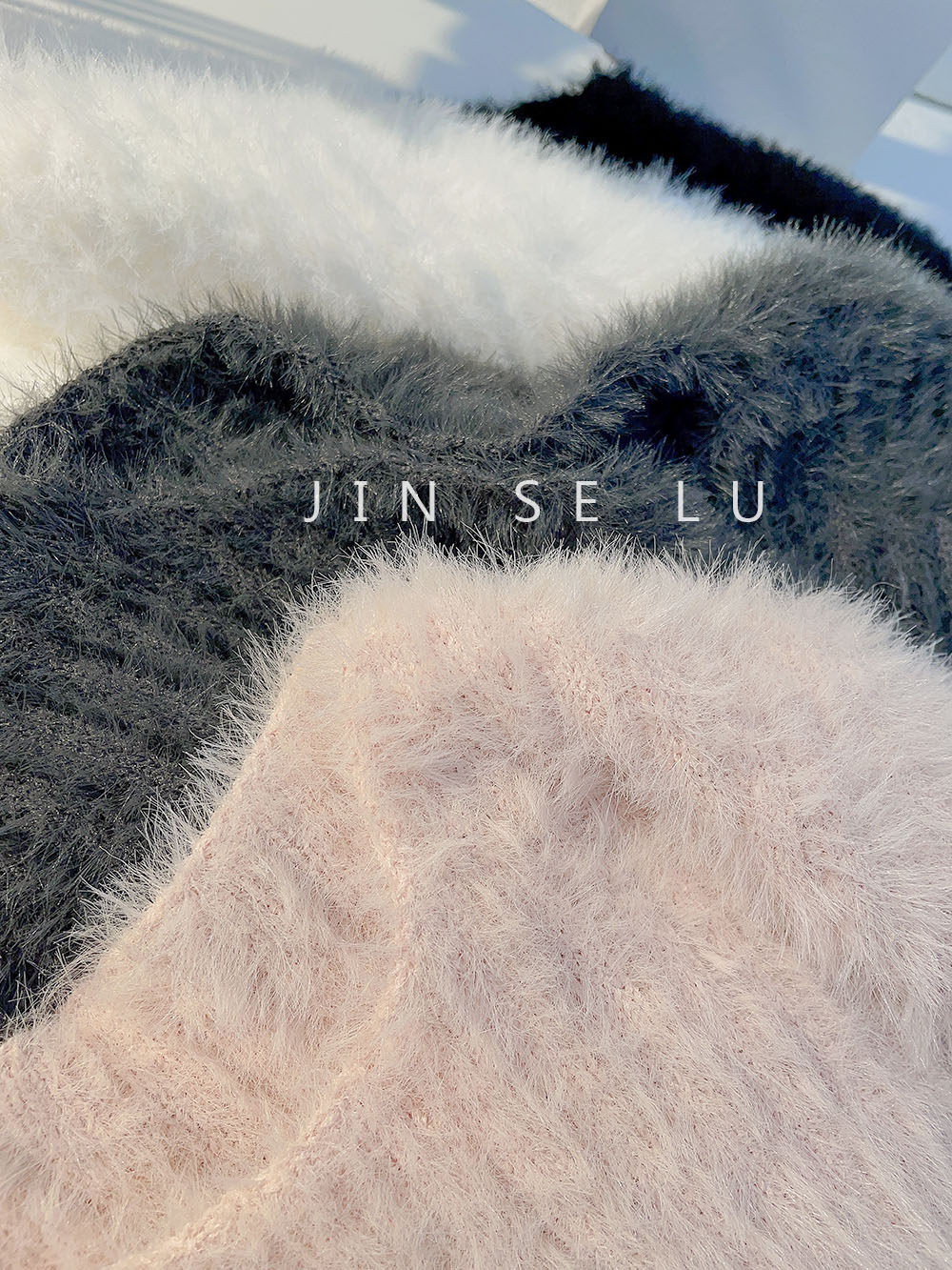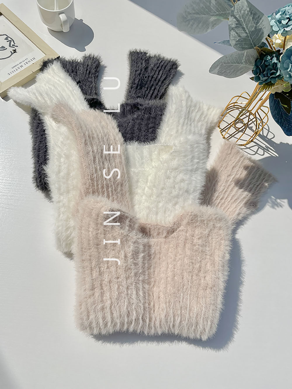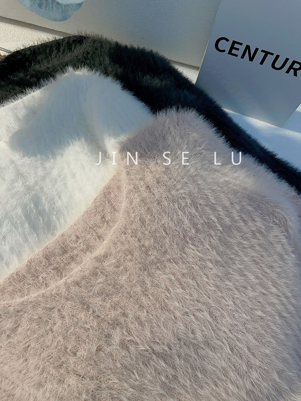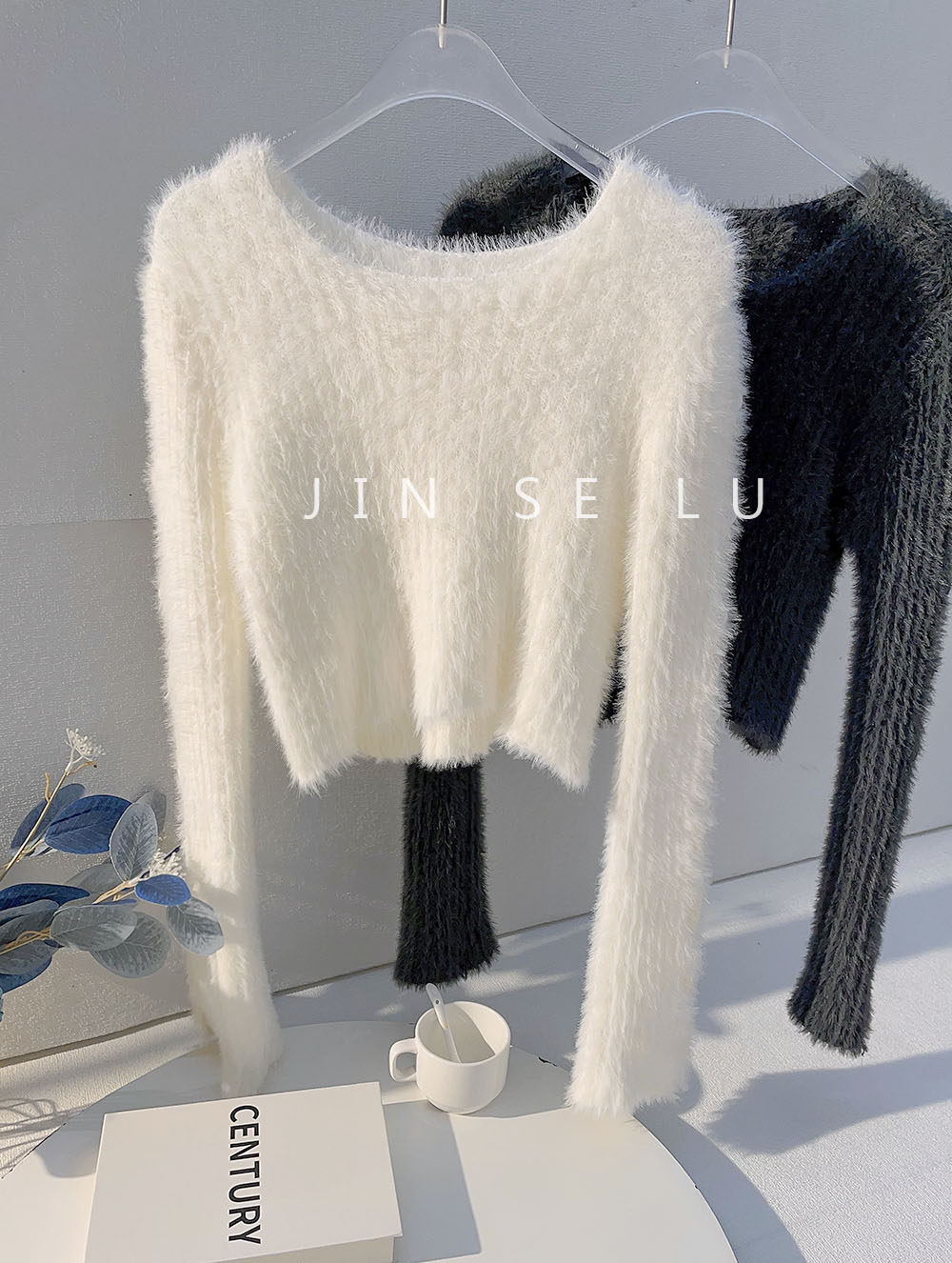 ins潮慵懶風短款水貂絨毛衣女設計感小衆紐釦喇叭袖修身針織衫冬