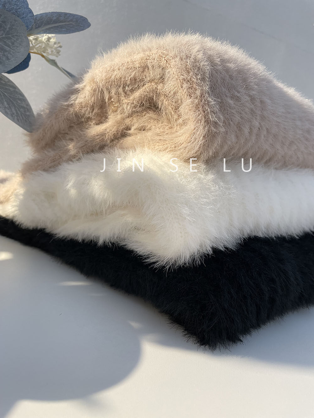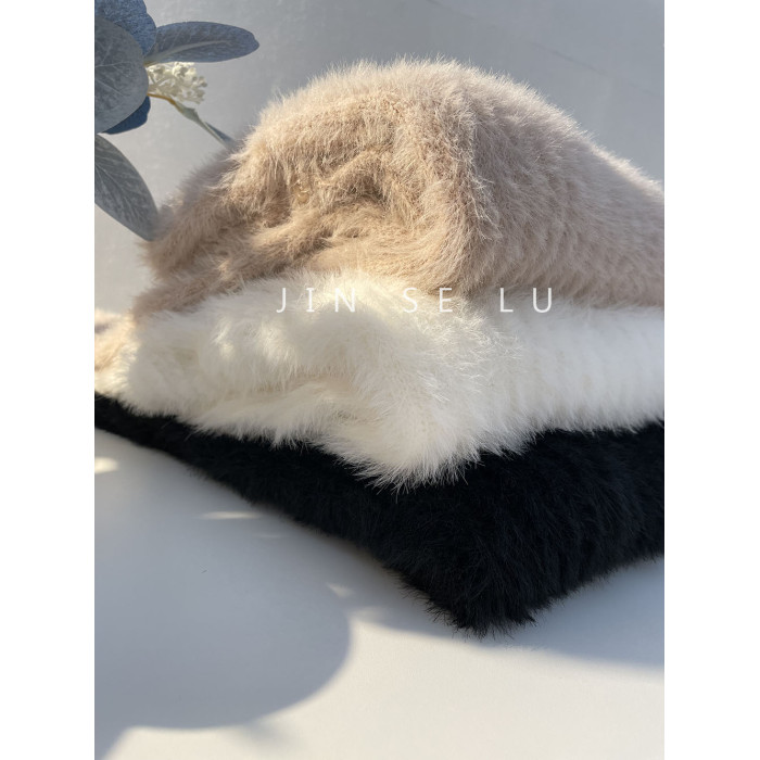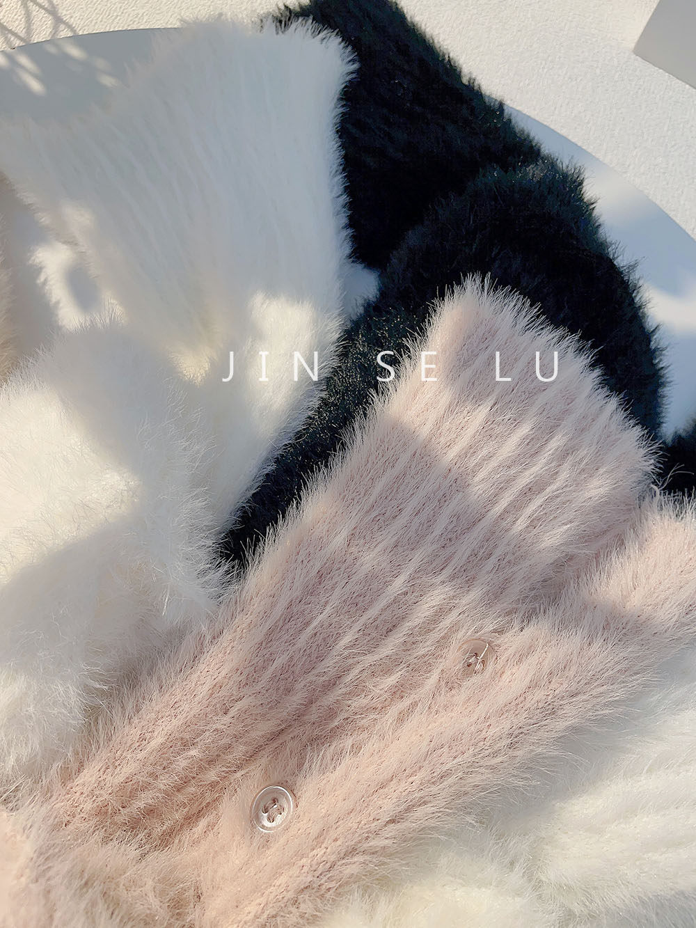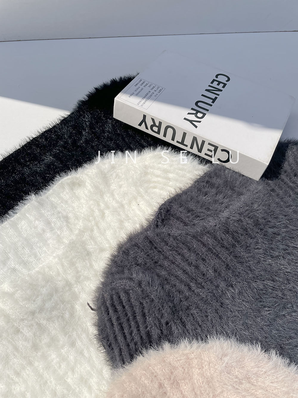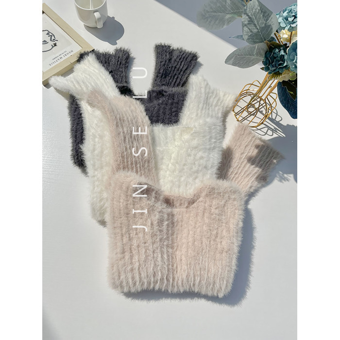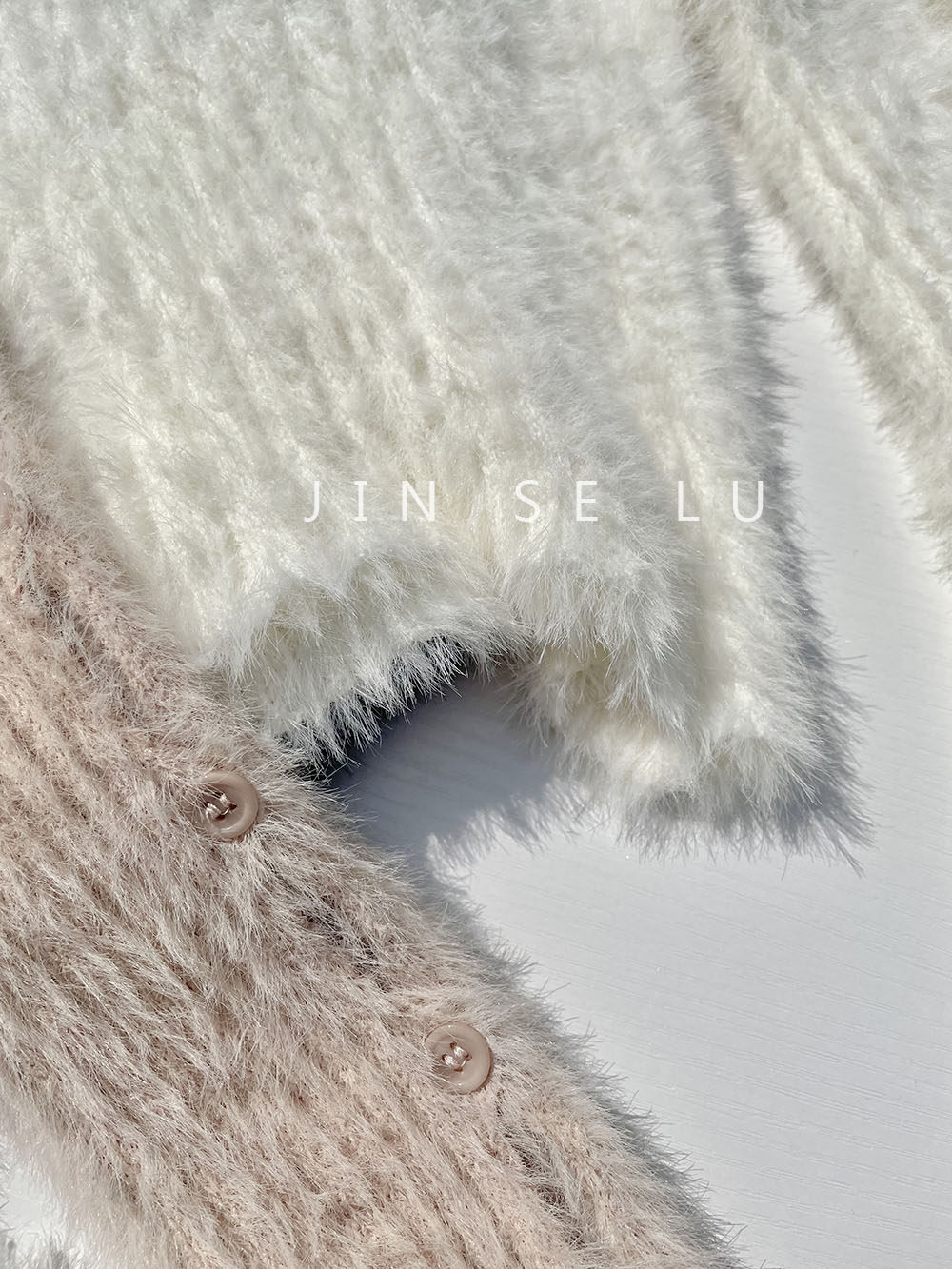 ins潮慵懶風短款水貂絨毛衣女設計感小衆紐釦喇叭袖修身針織衫冬