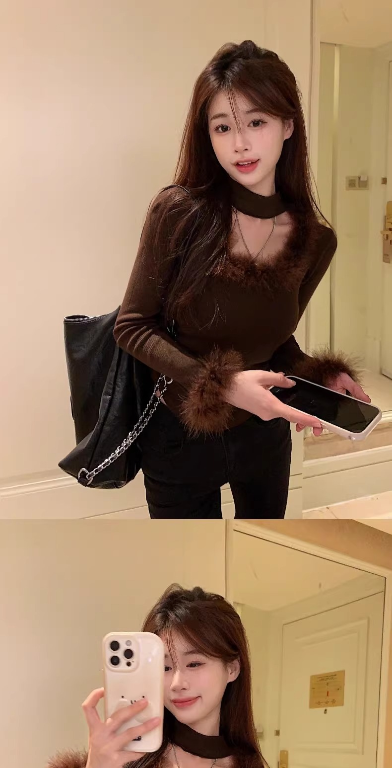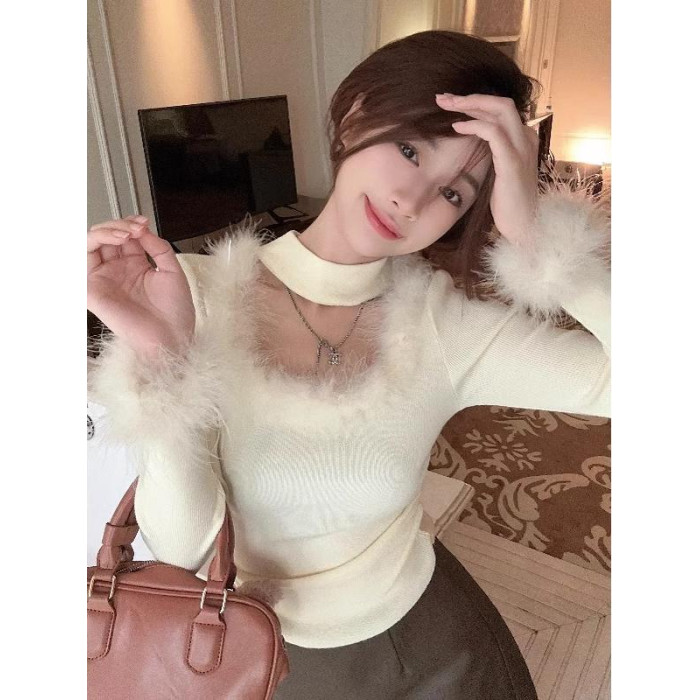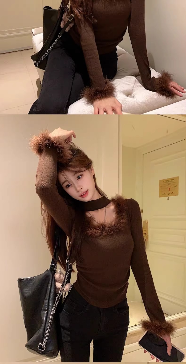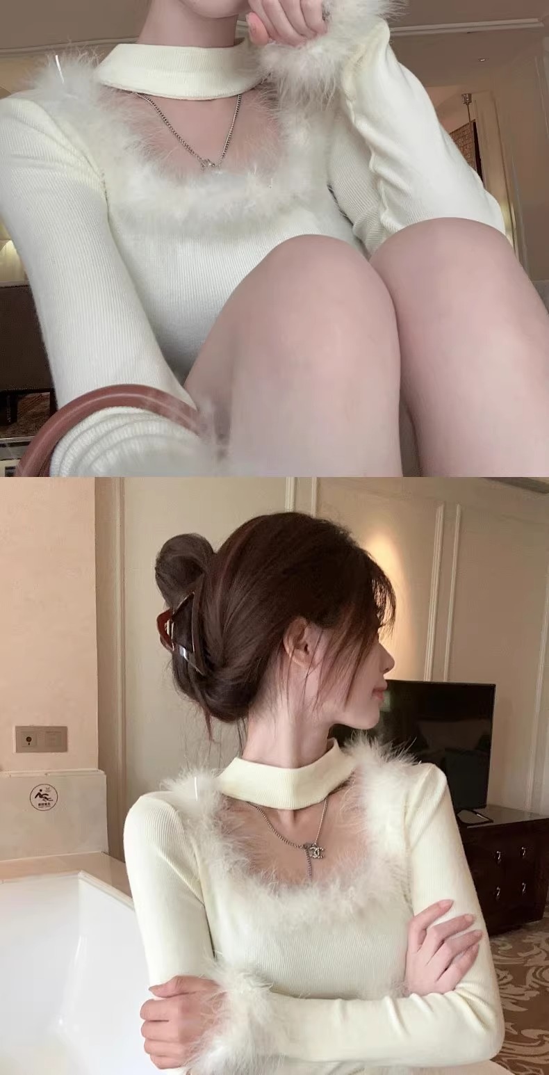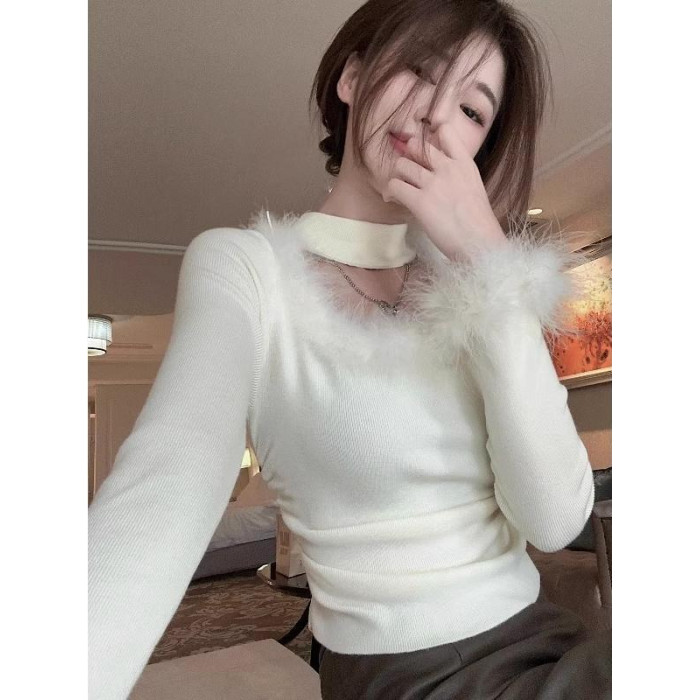 掛脖毛毛領打底毛衣針織衫女秋冬時尚內搭高級感修身顯瘦短款上衣