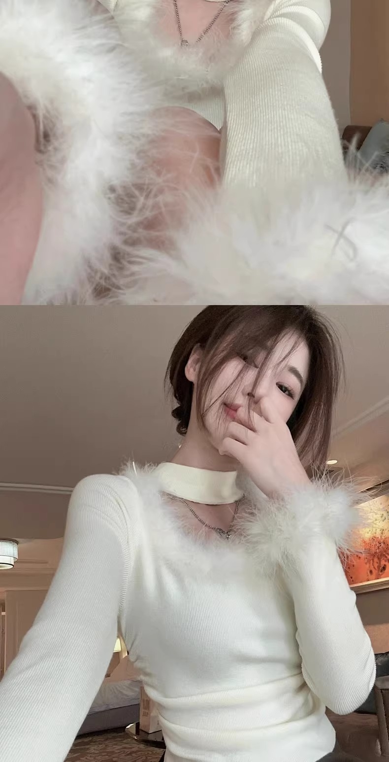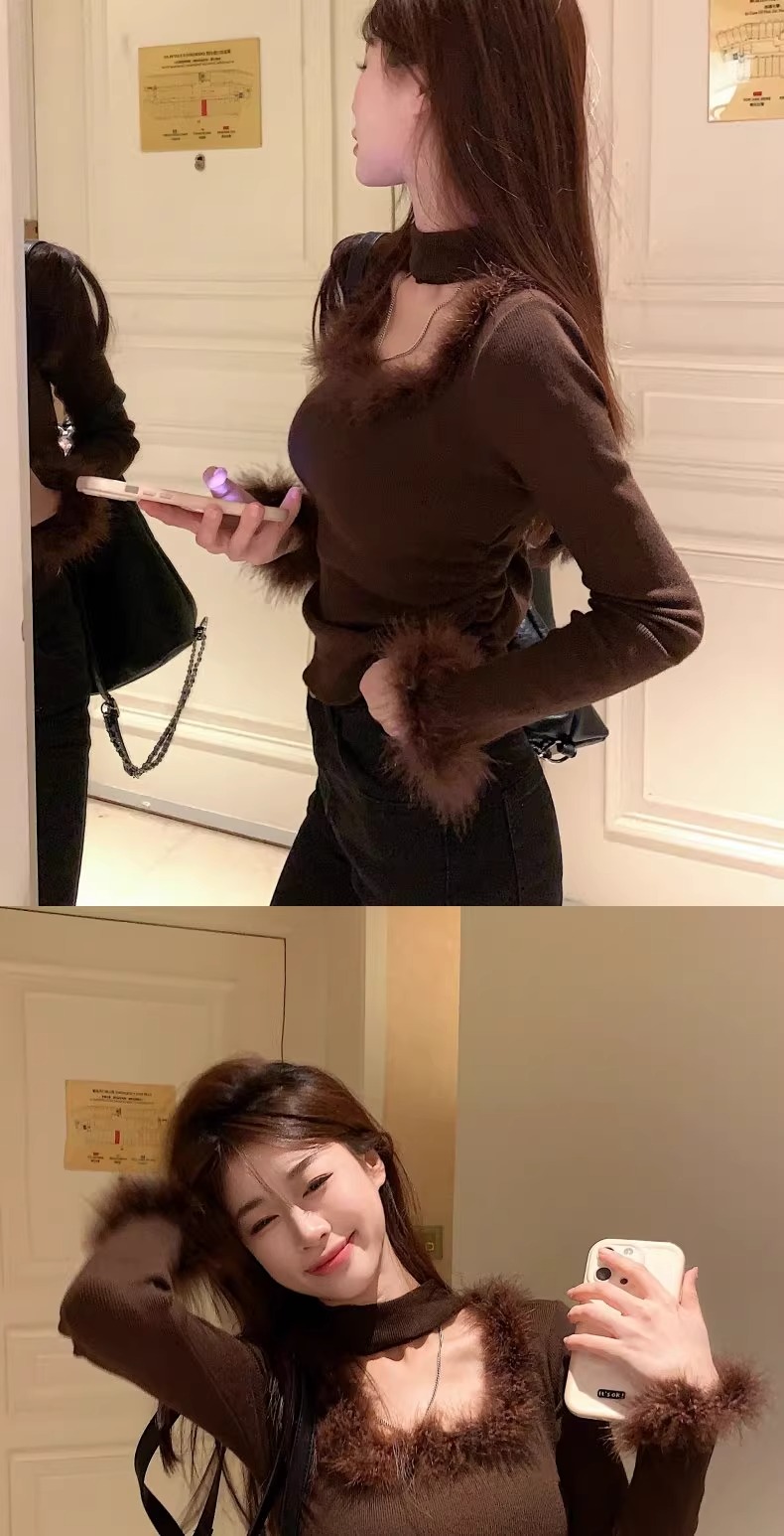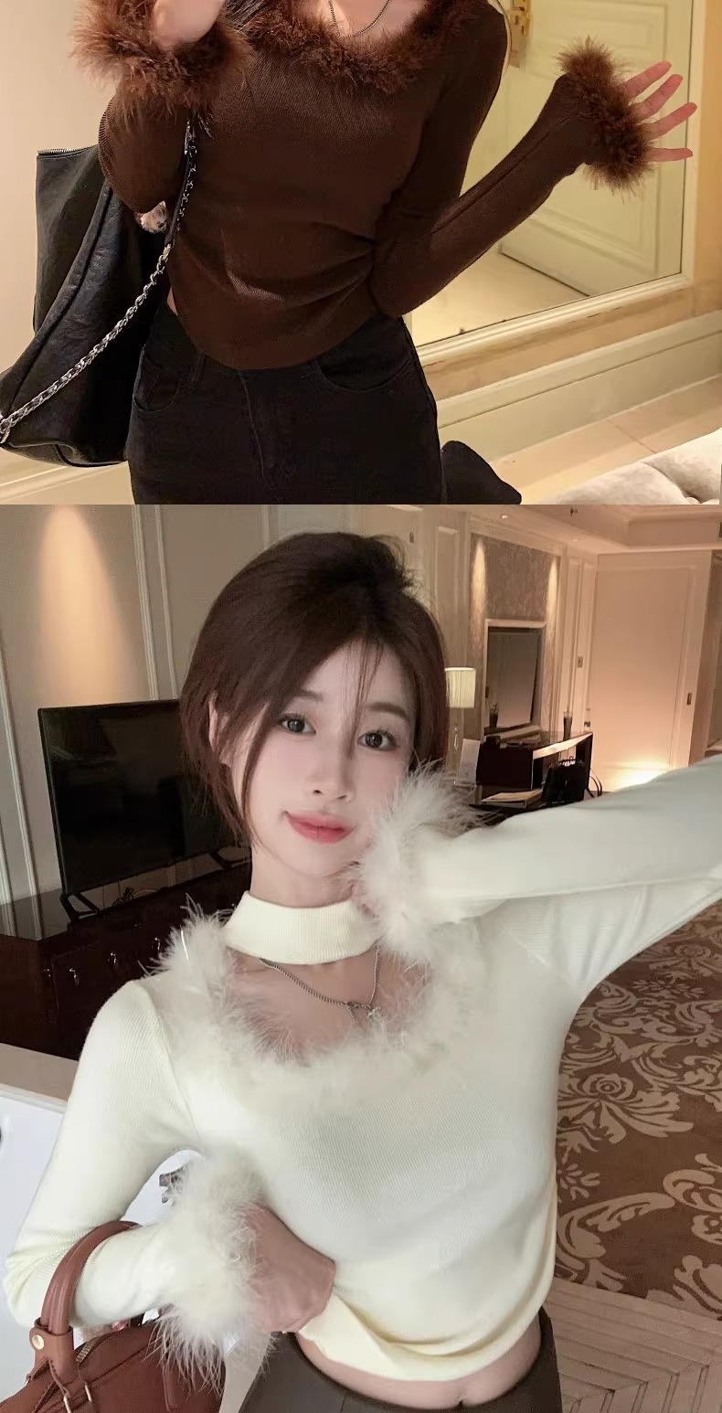 掛脖毛毛領打底毛衣針織衫女秋冬時尚內搭高級感修身顯瘦短款上衣