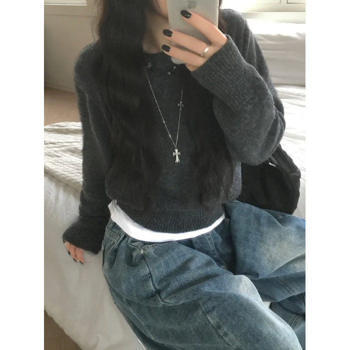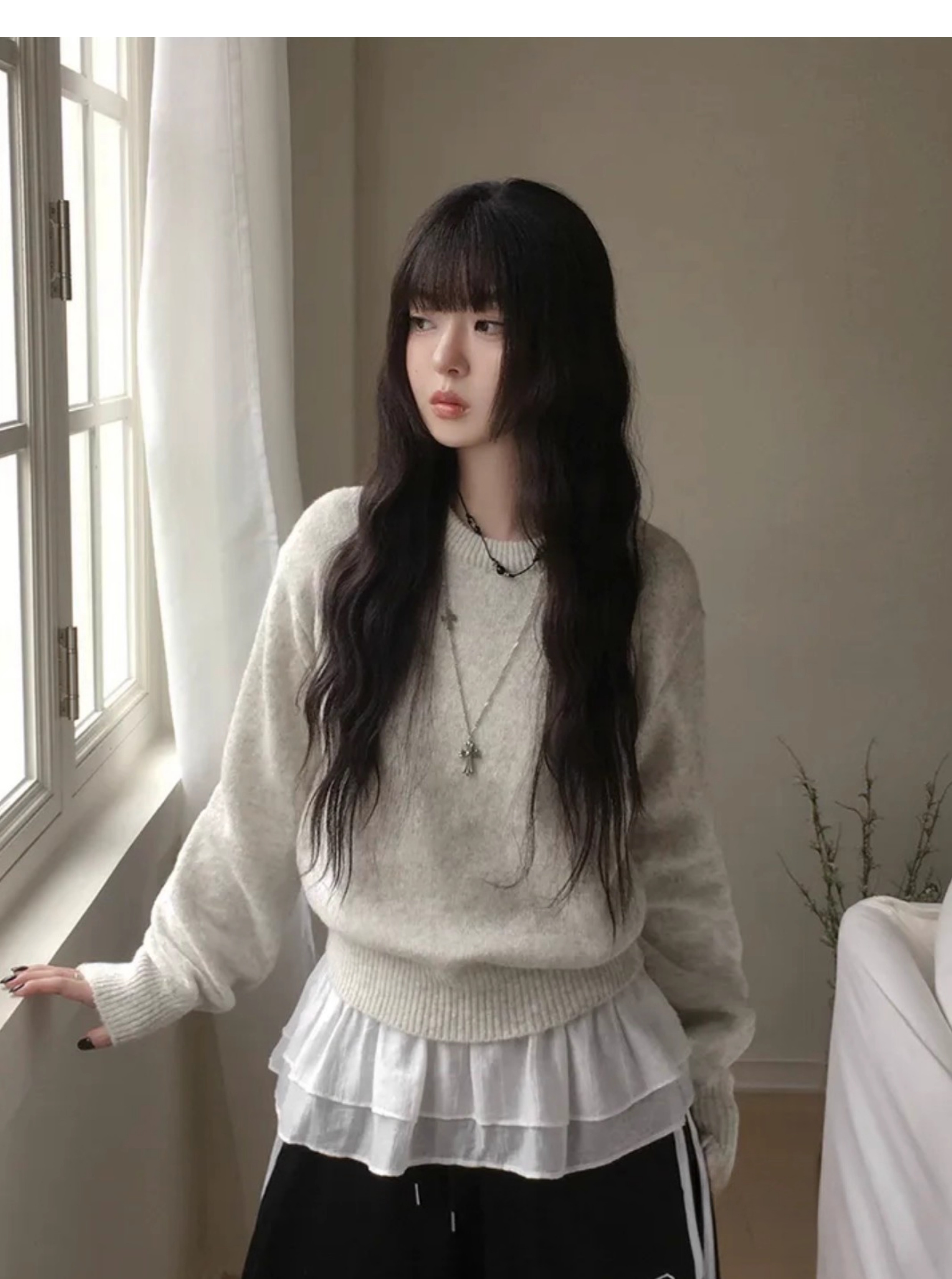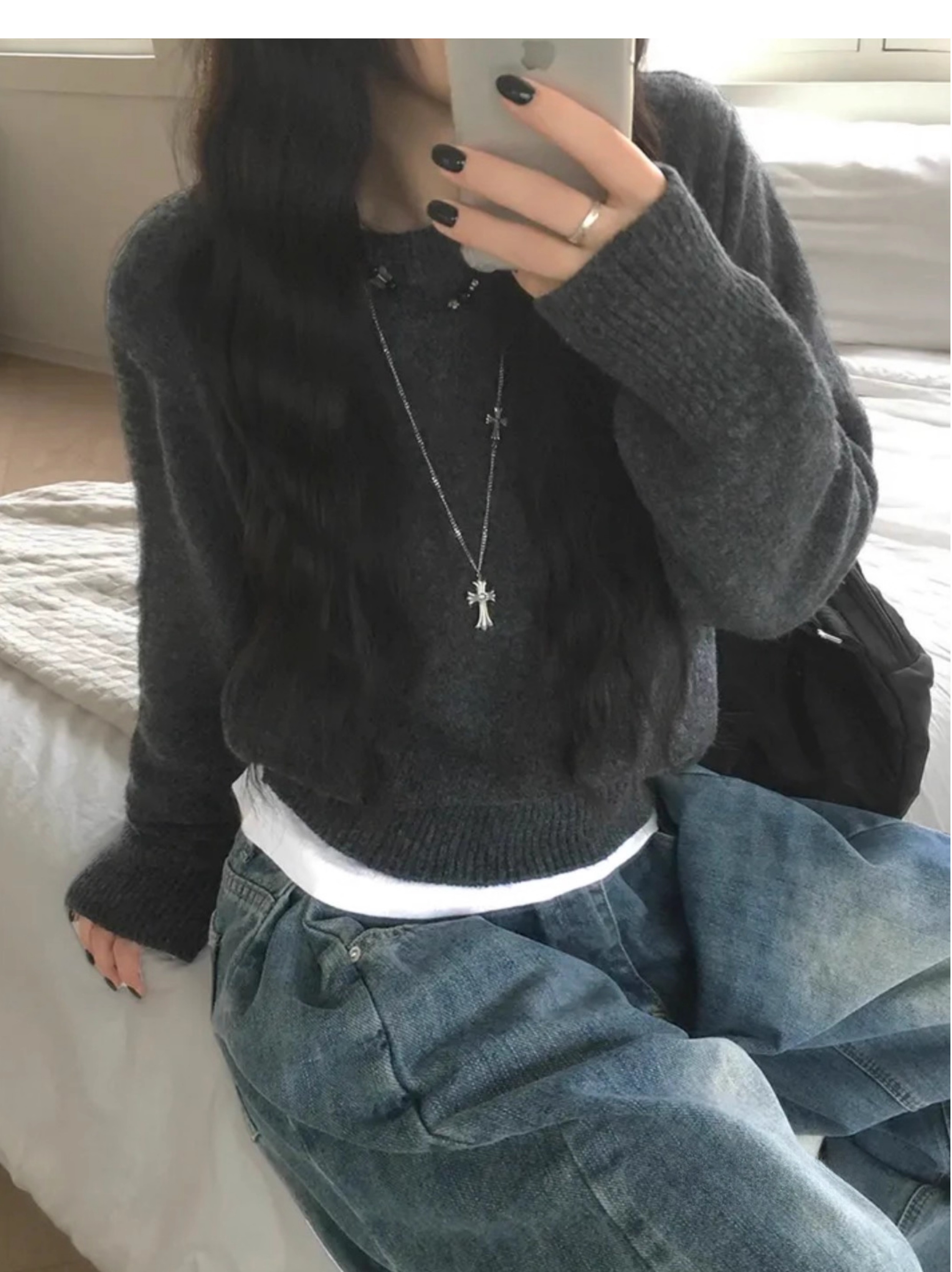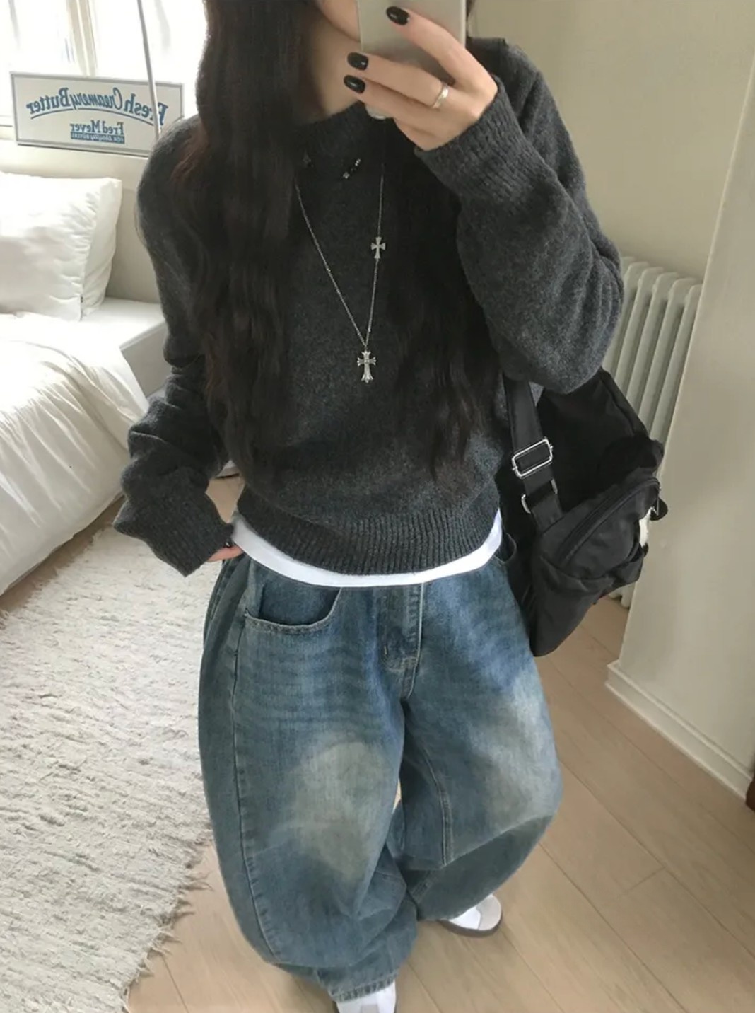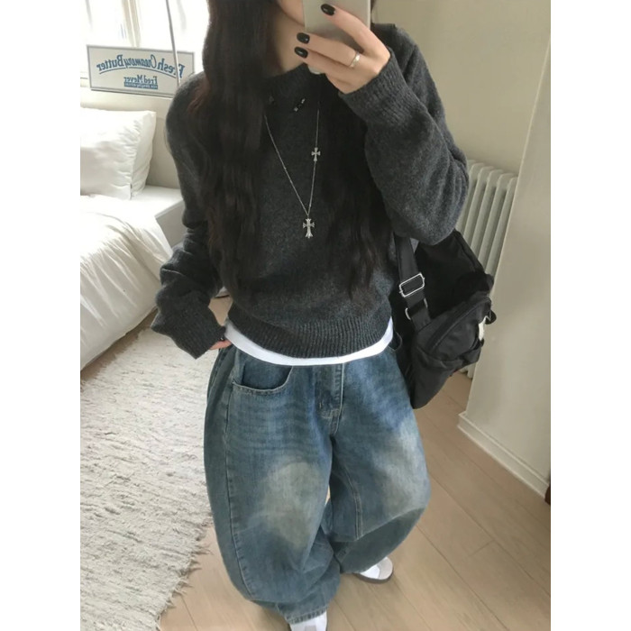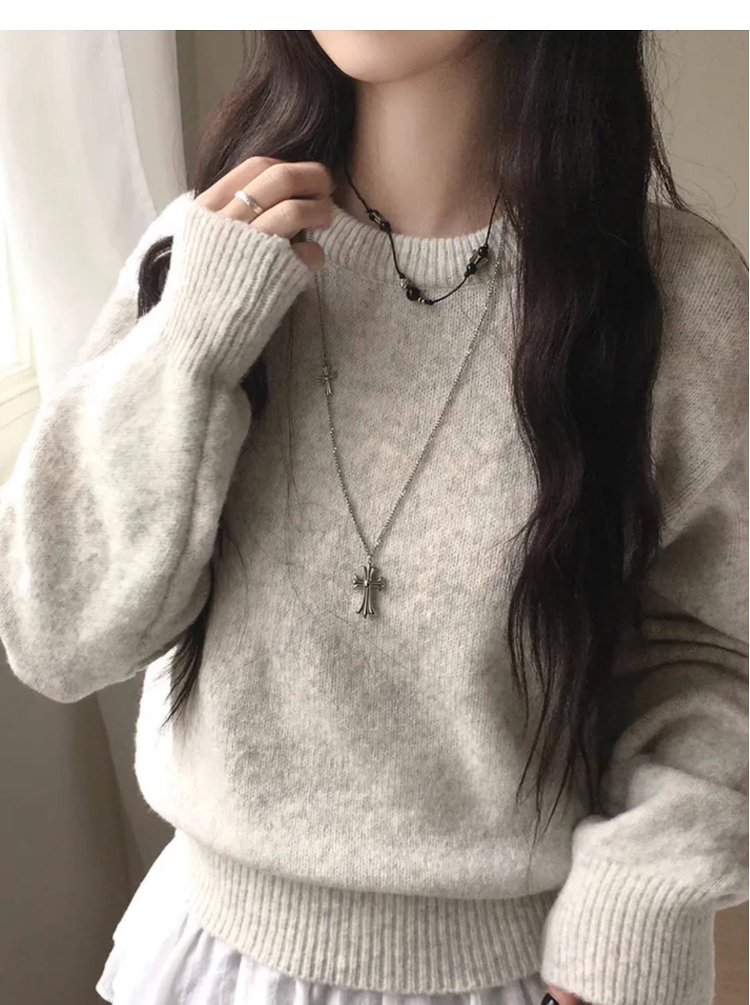 Up and on 韓系慵懶基本款純色休閒百搭寬松圓領長袖針織衫毛衣