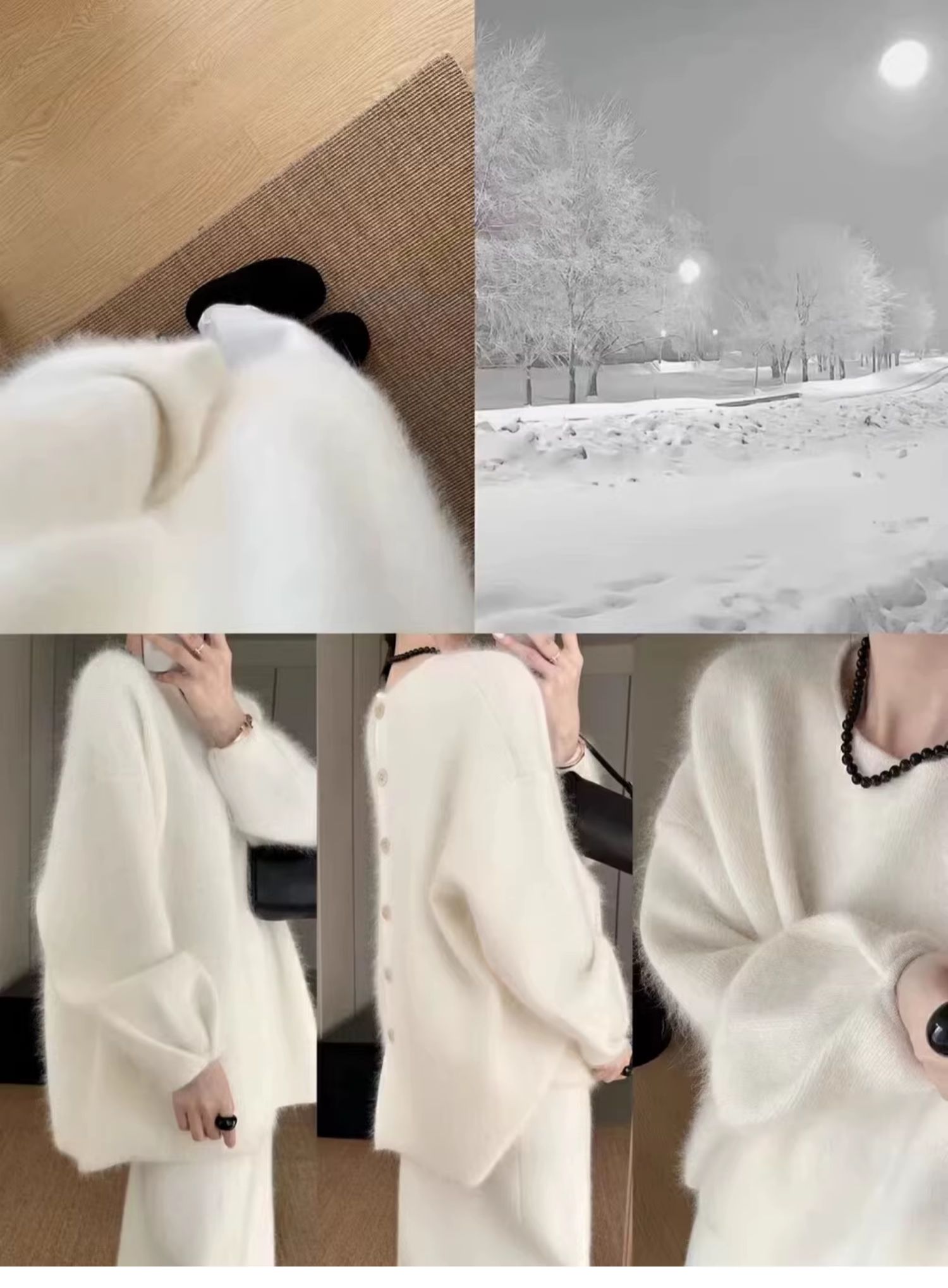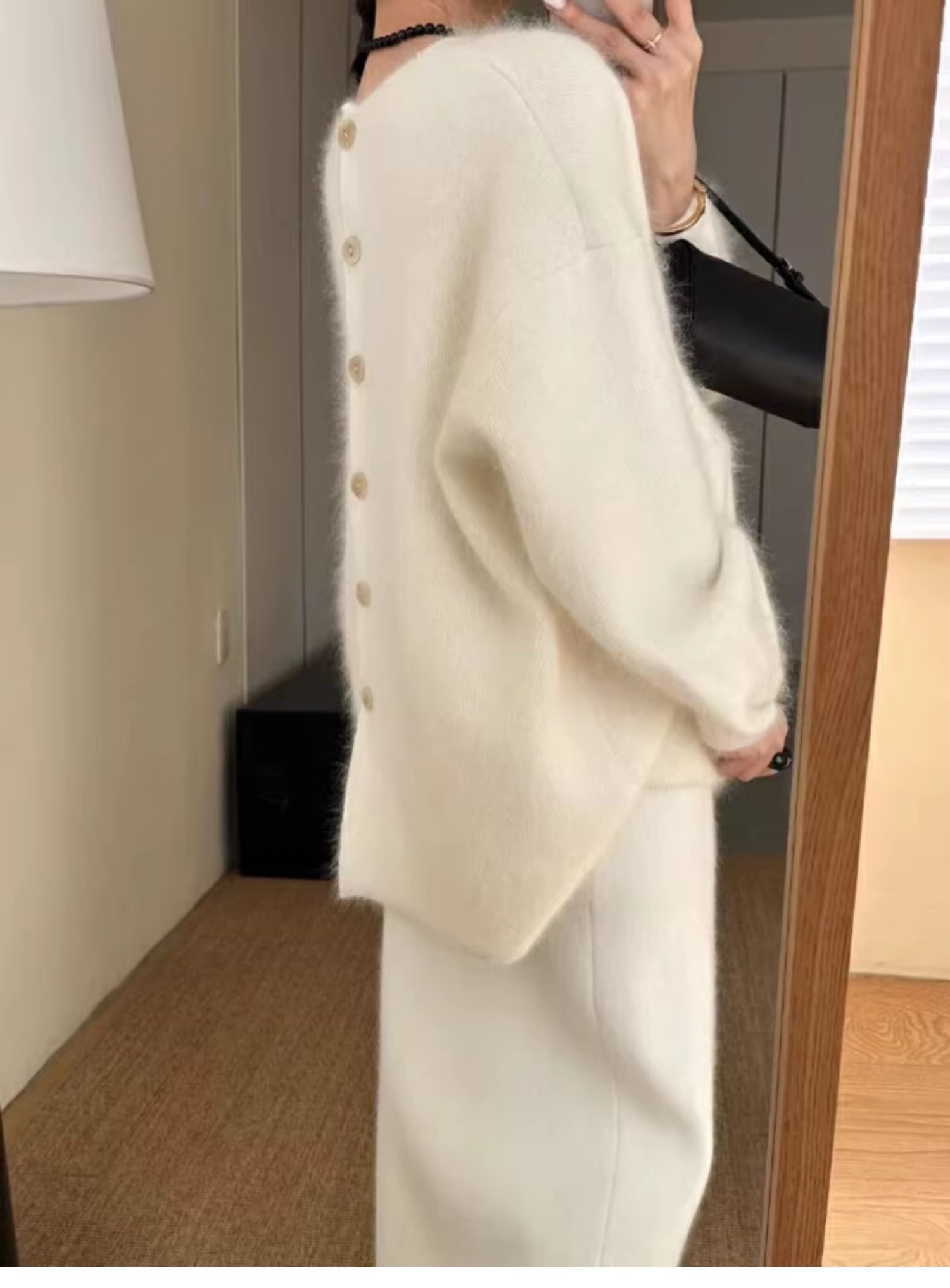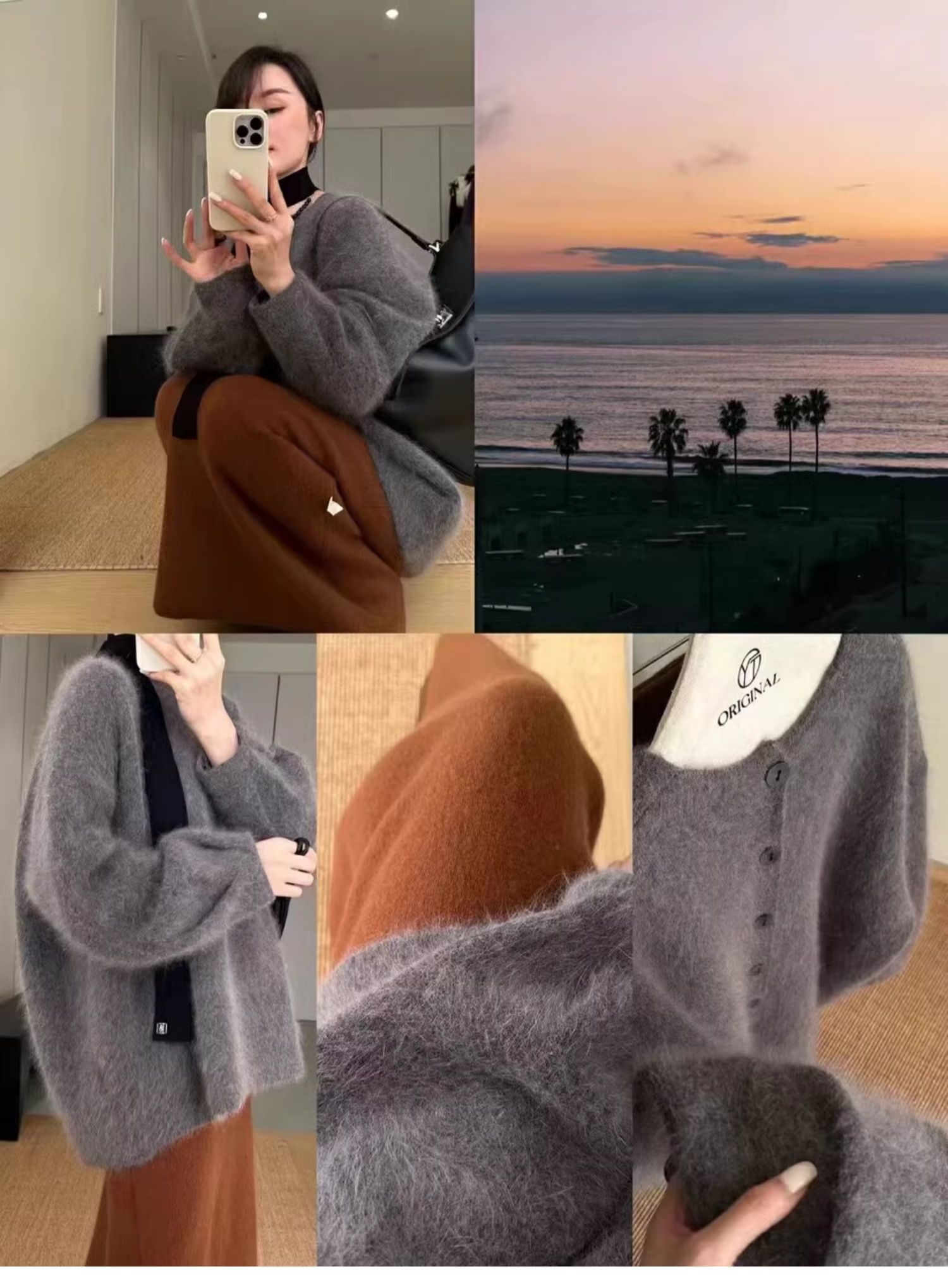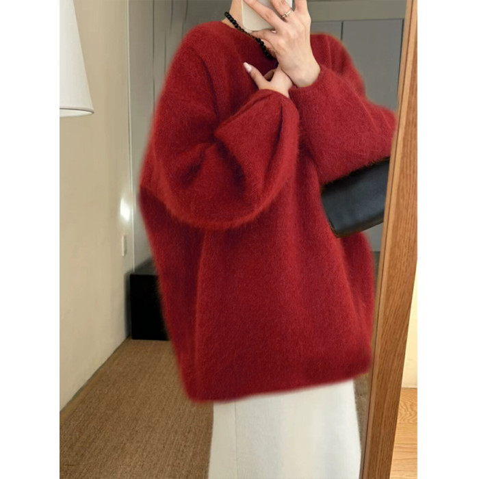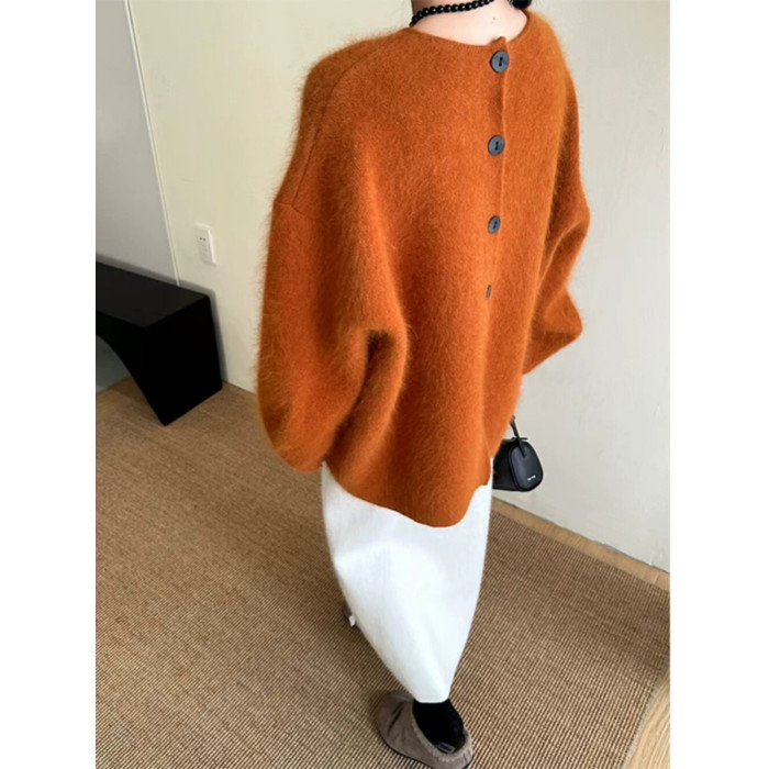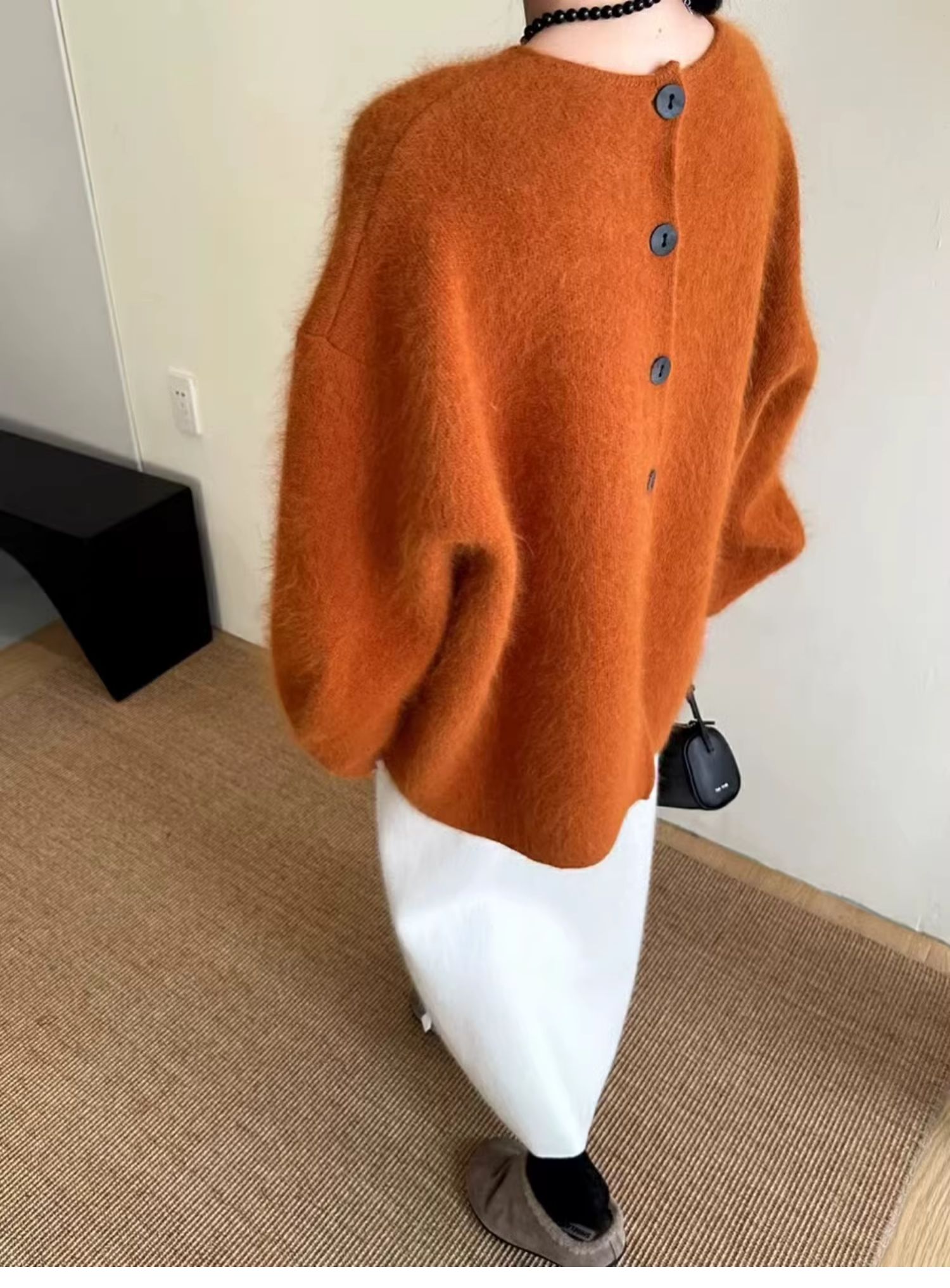 新年紅色後背釦子軟糯毛衣女秋冬外穿寬松針織開衫外套慵懶風上衣