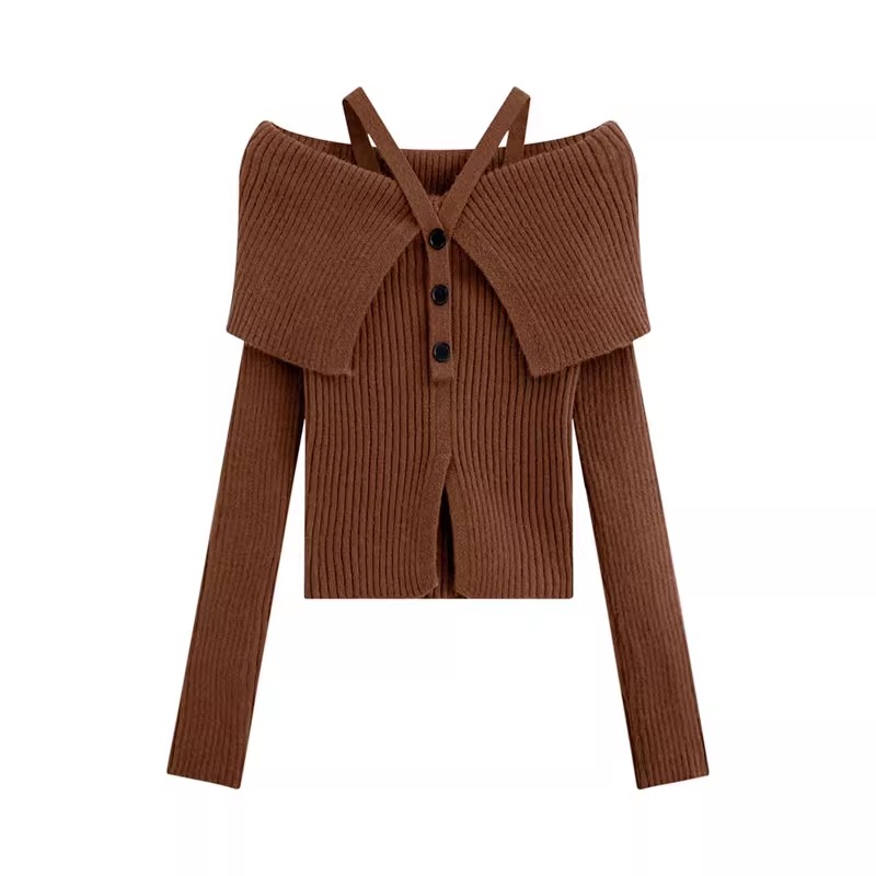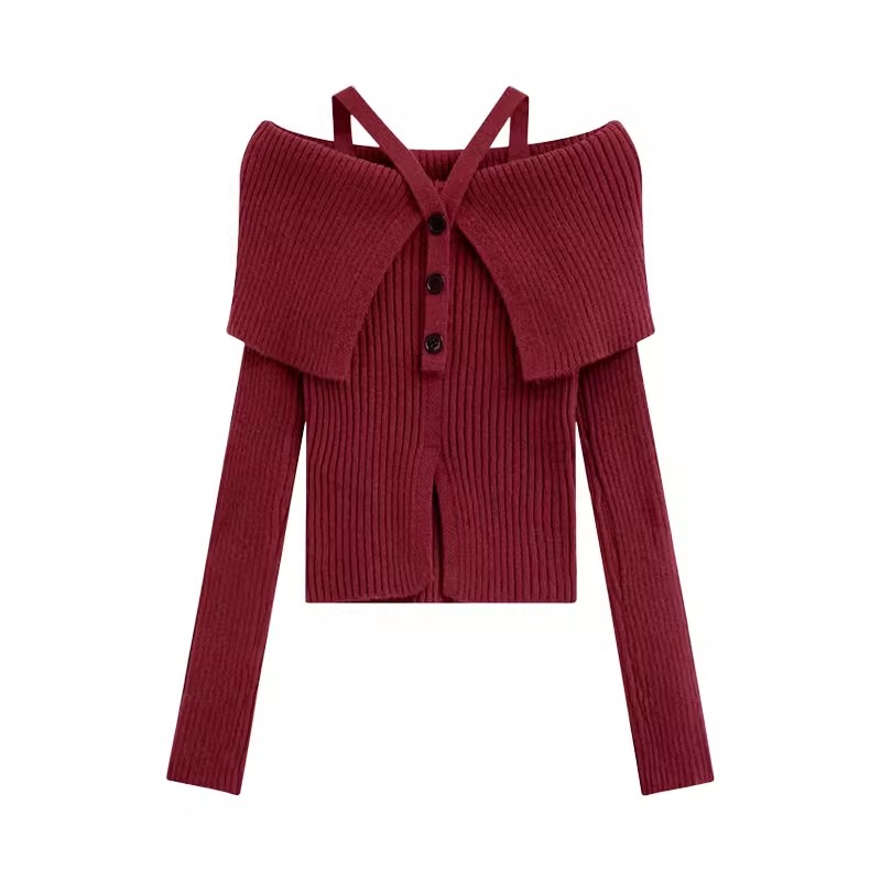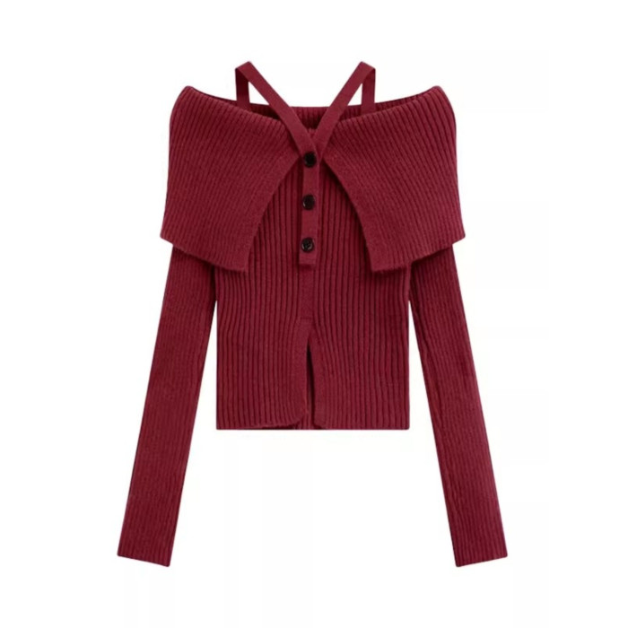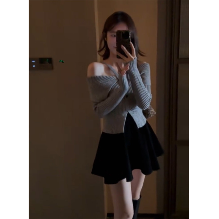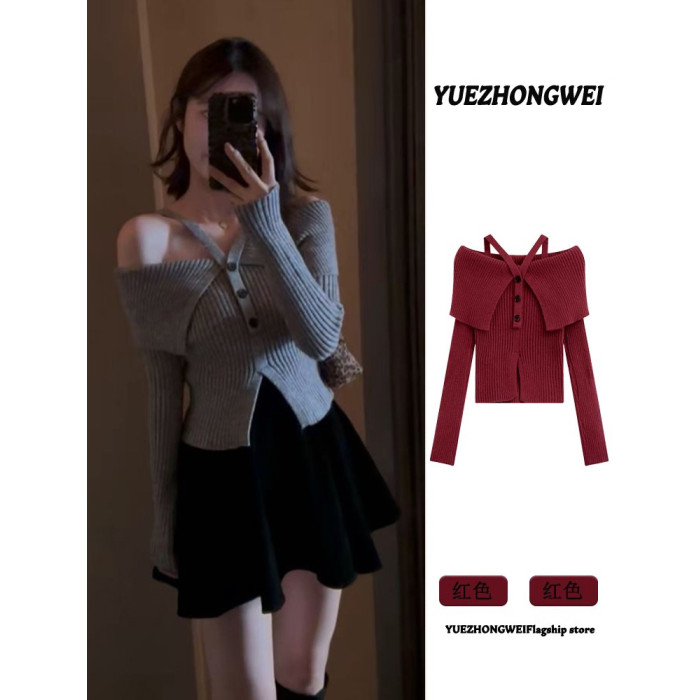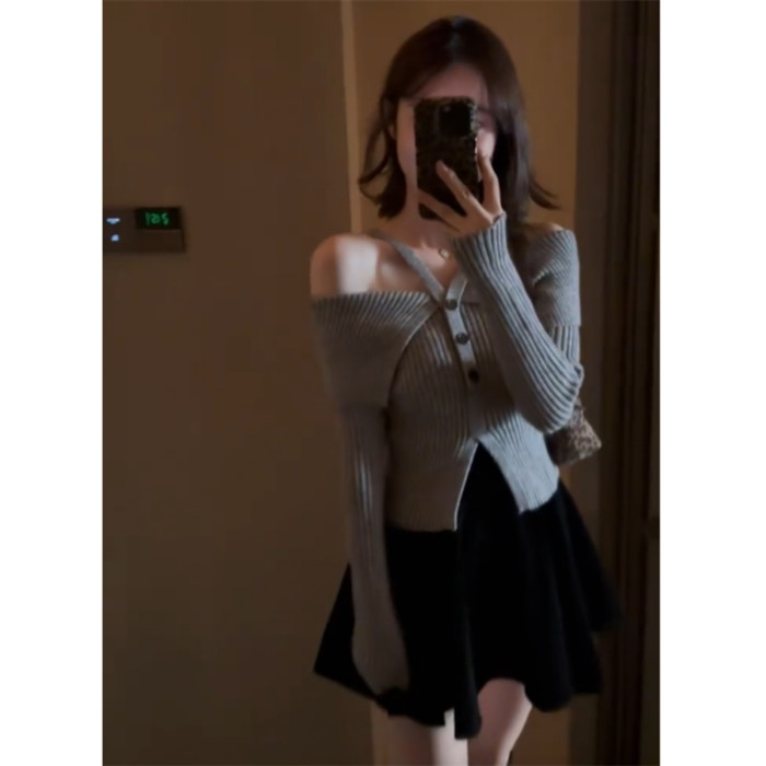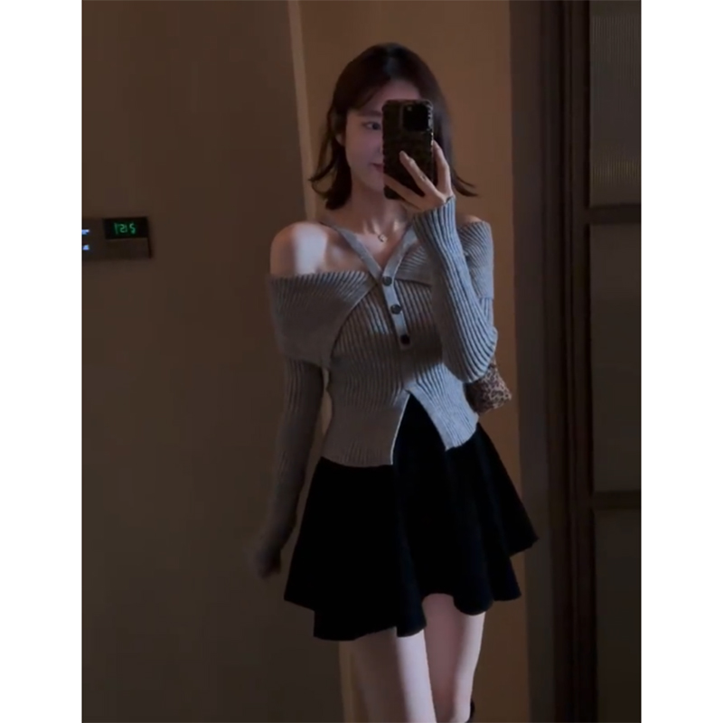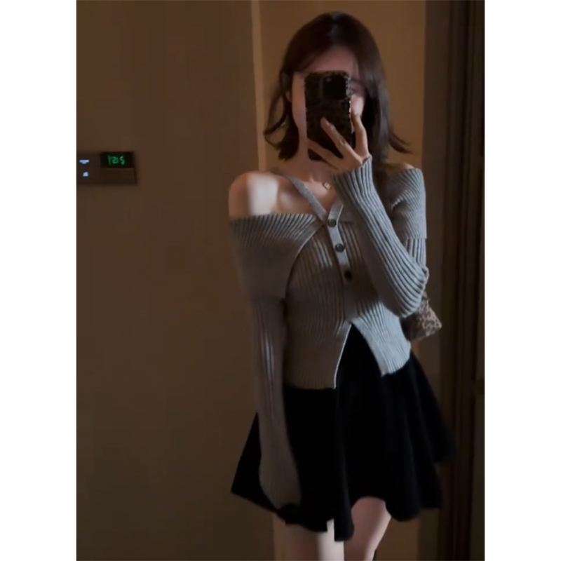法式一字肩灰色掛脖毛衣女款2025新款秋冬季修身露肩短款針織上衣