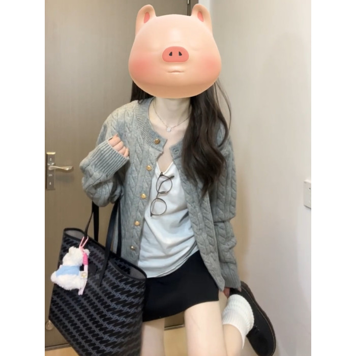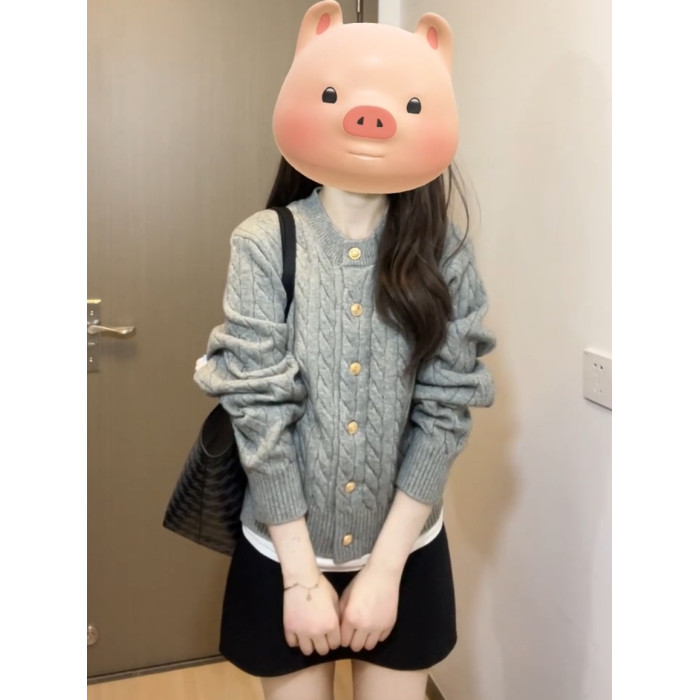 灰色麻花針織開衫女春秋秋季學院風外搭軟糯毛衣外套短款上衣秋冬