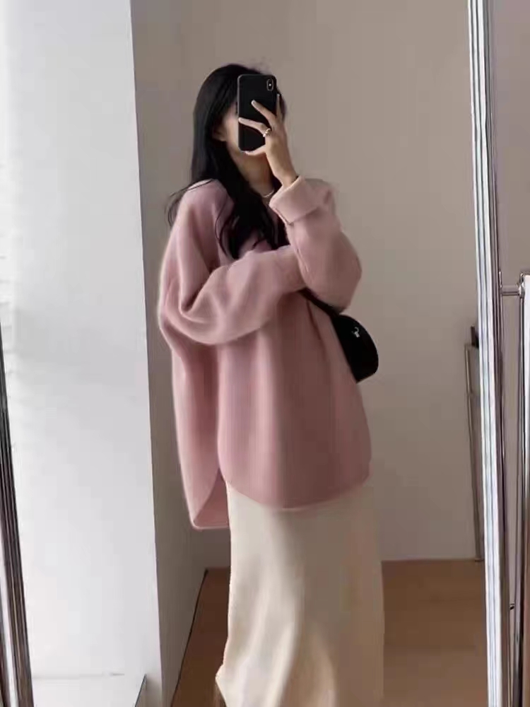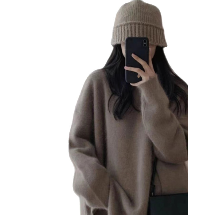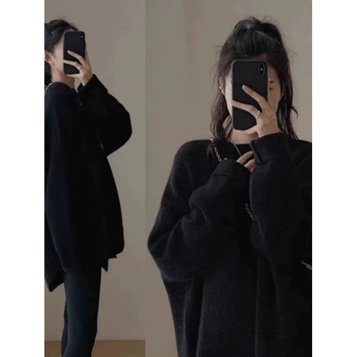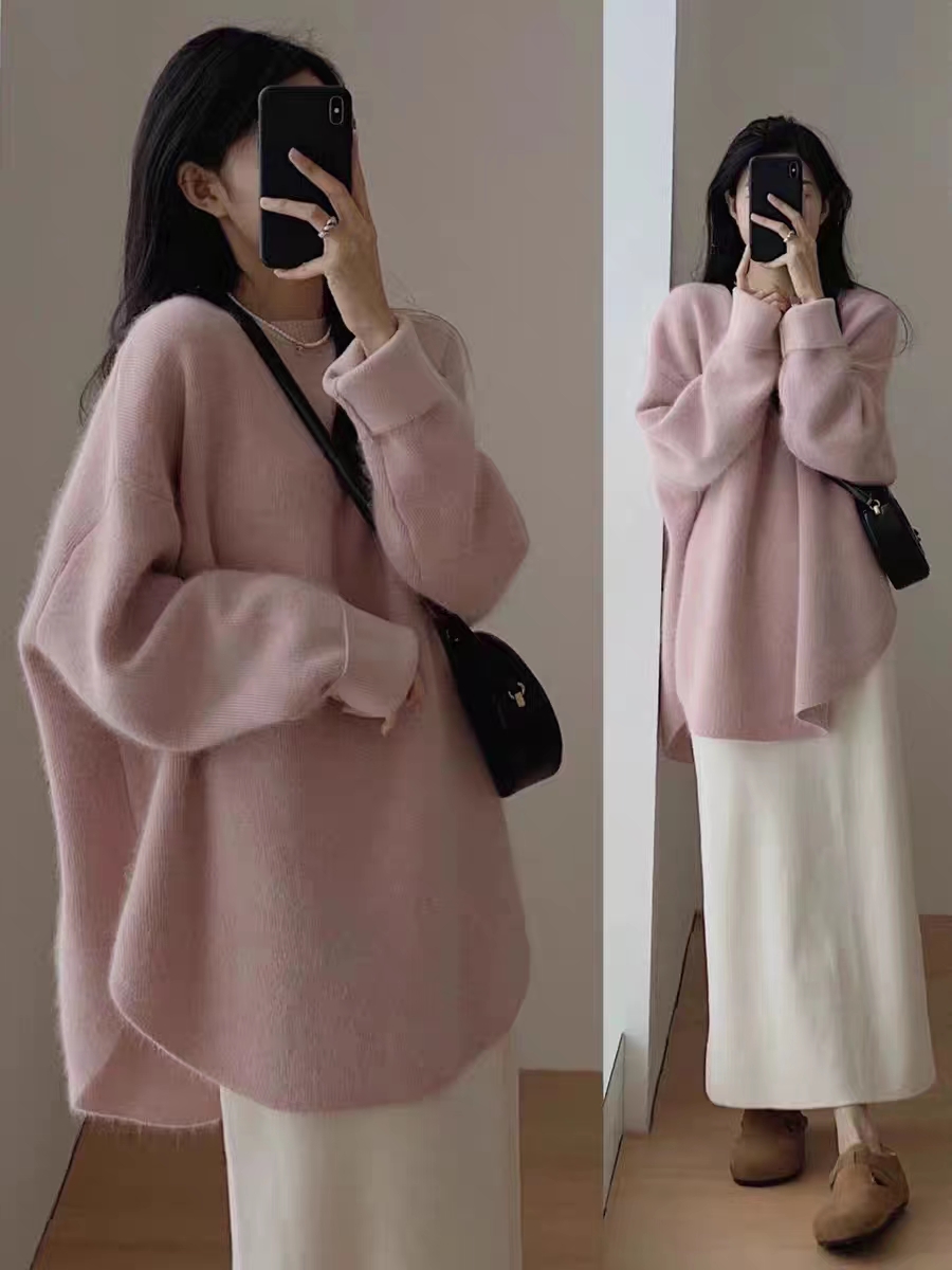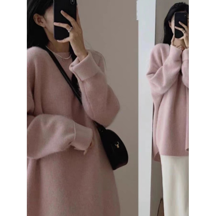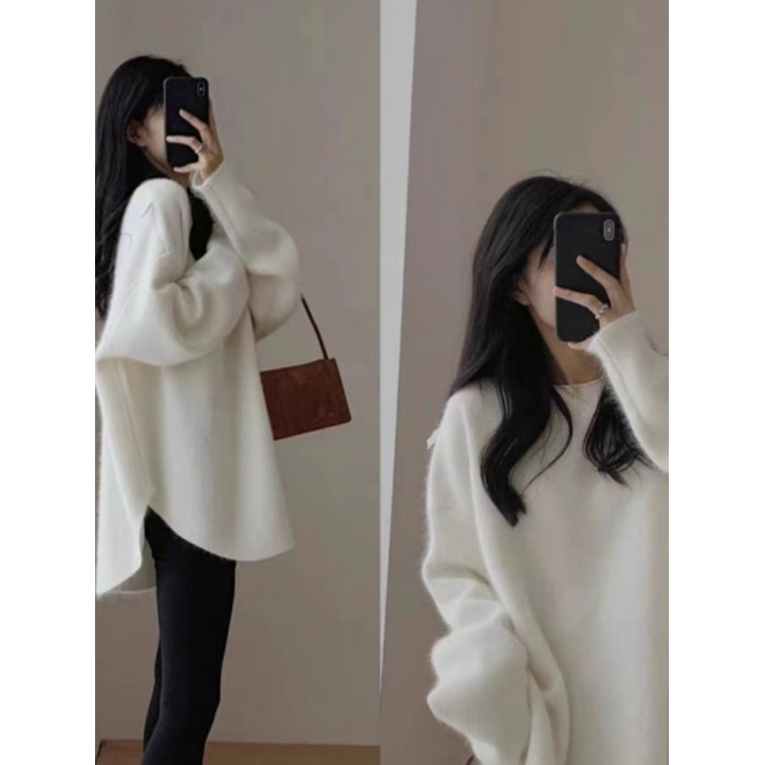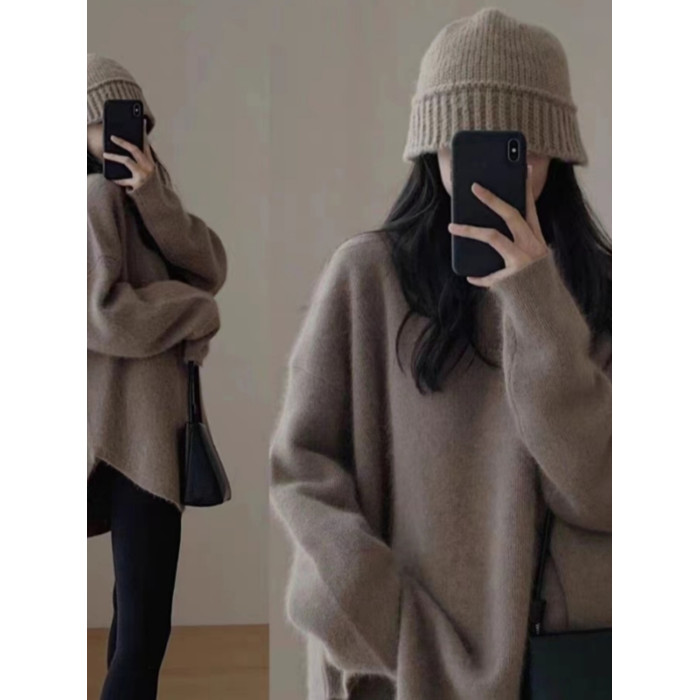 浣熊絨套頭毛衣女秋冬外穿中長款日系慵懶復古開叉針織衫冬季加厚