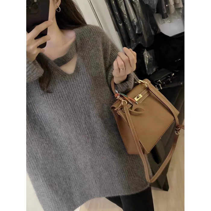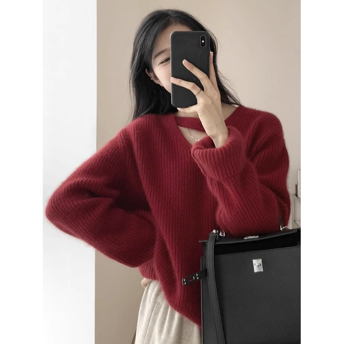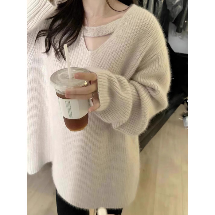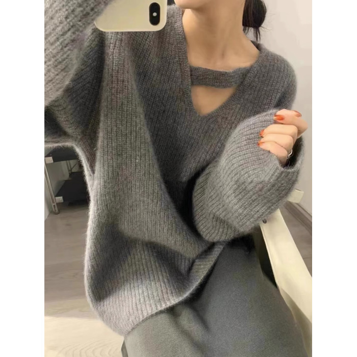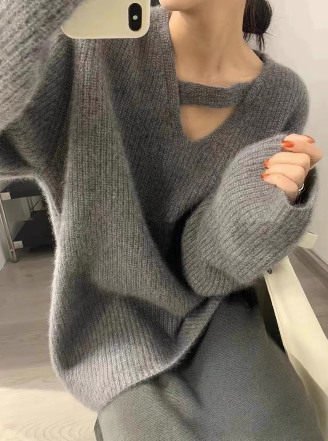 灰色v領鏤空套頭針織軟糯毛衣女秋冬季設計感小衆高級感慵懶風厚