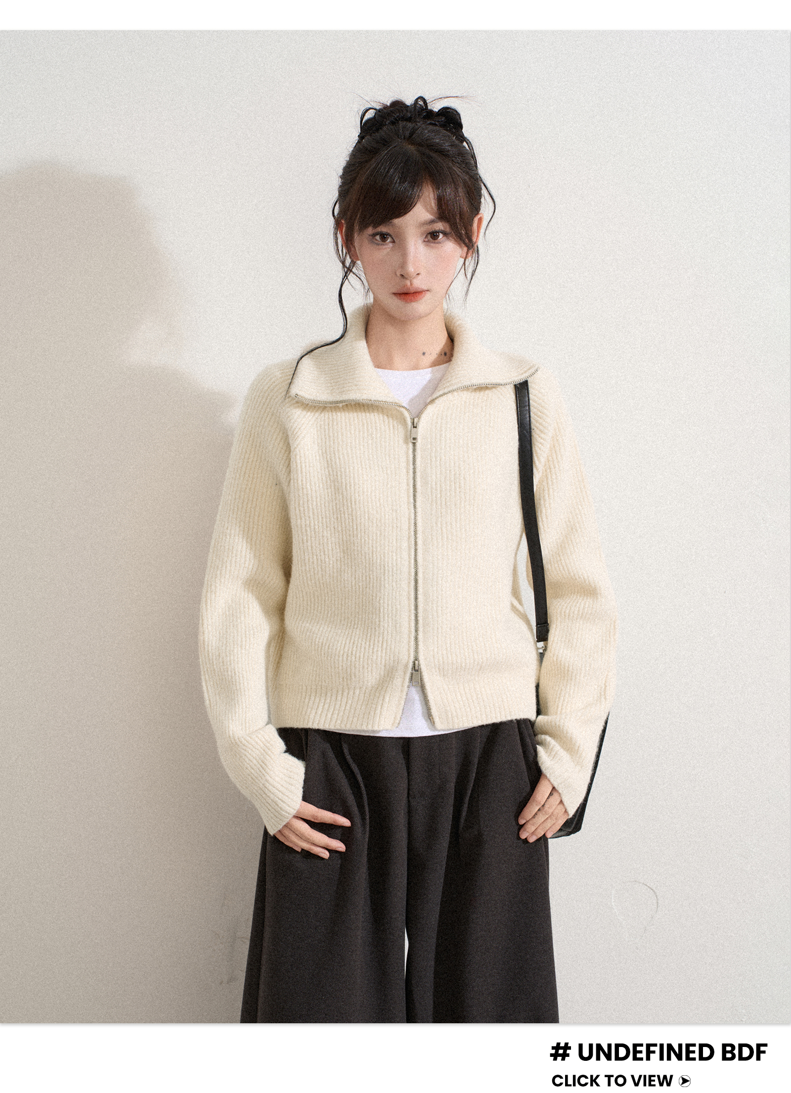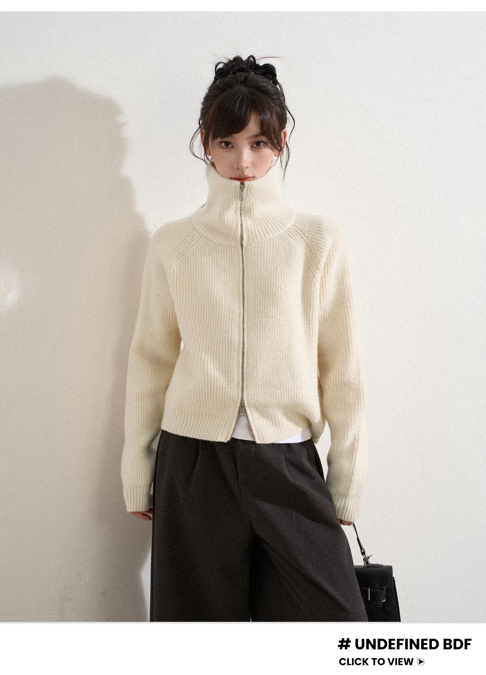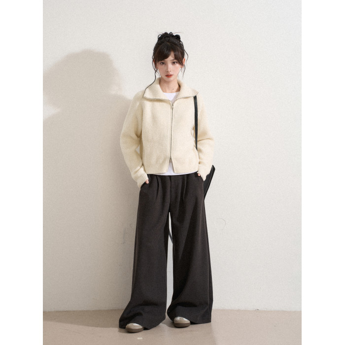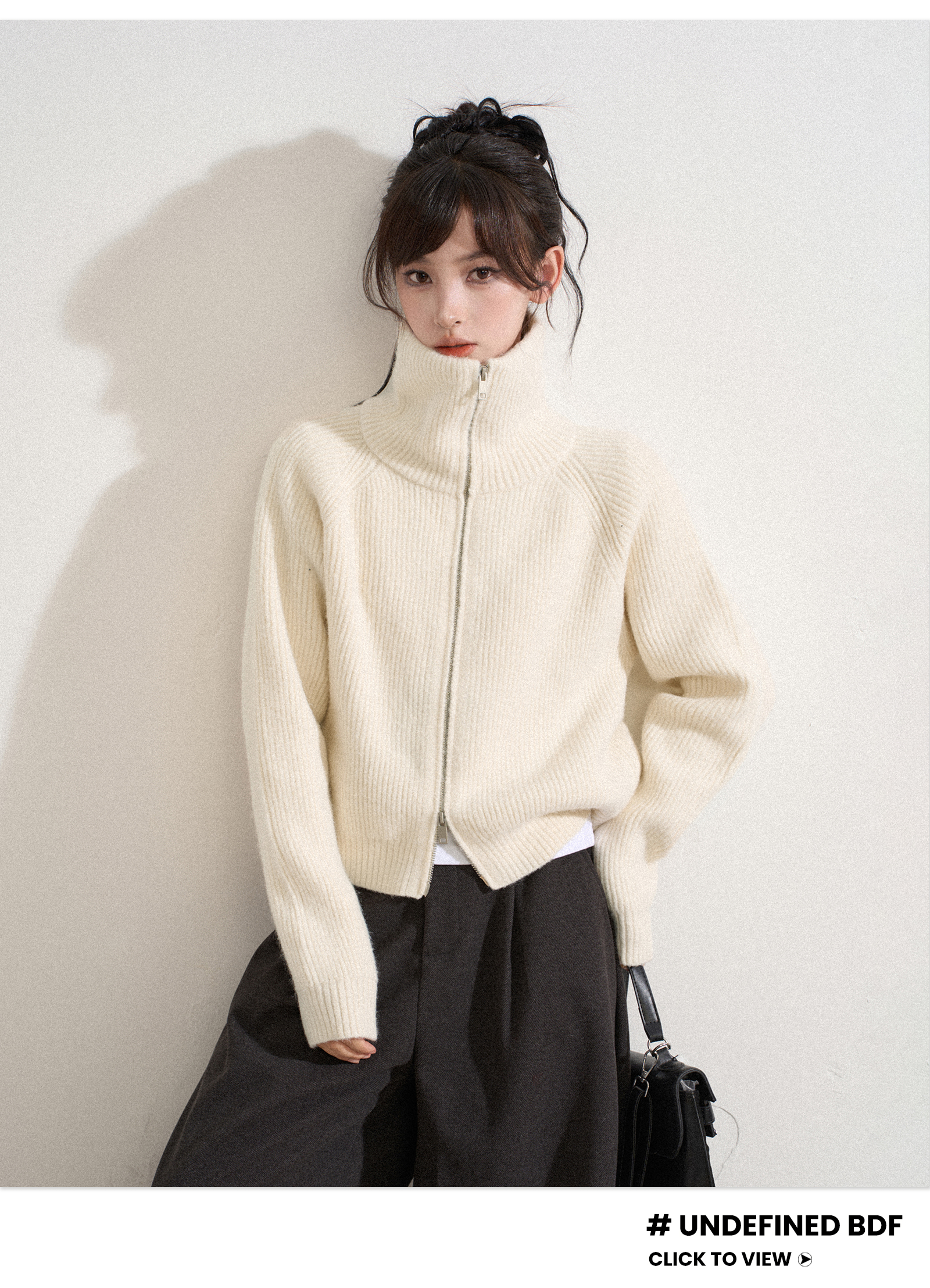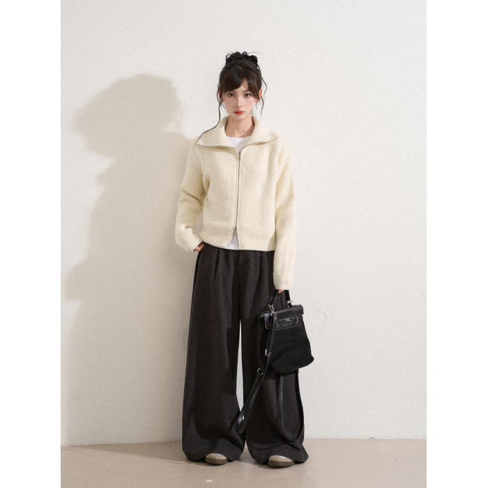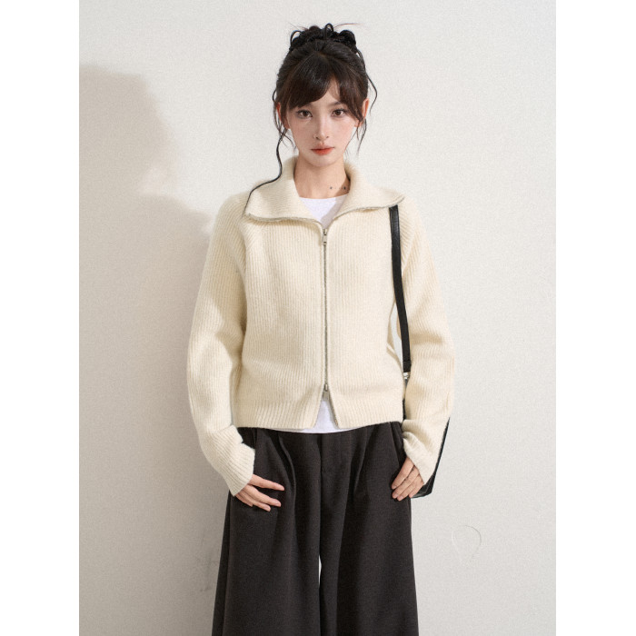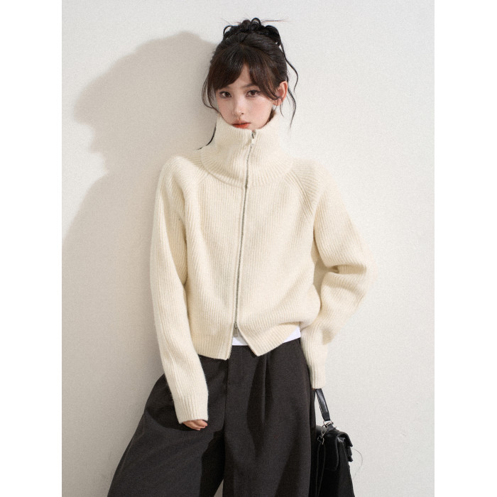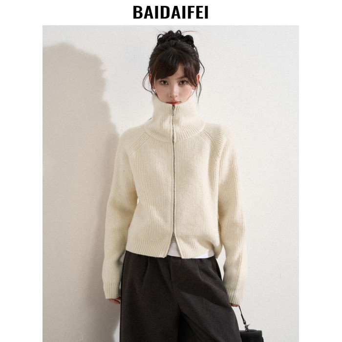 白色高領雙拉鍊針織毛衣外套女秋冬冬季短款立領加厚打底開衫上衣