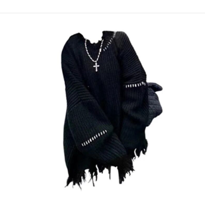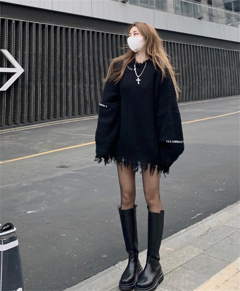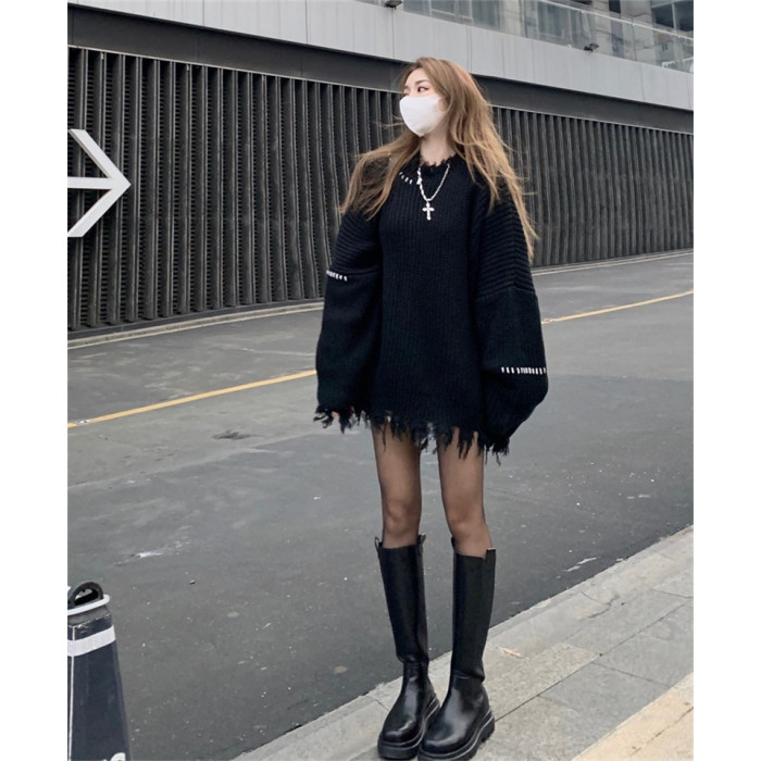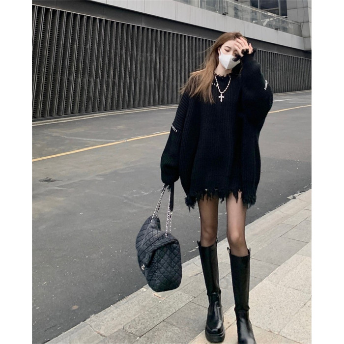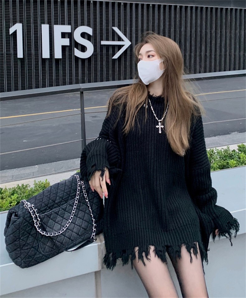 破洞流蘇加厚毛衣女2023秋冬新款寬松中長款針織衫設計感小衆上衣