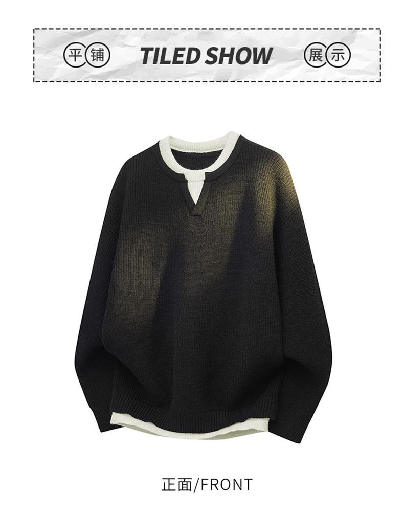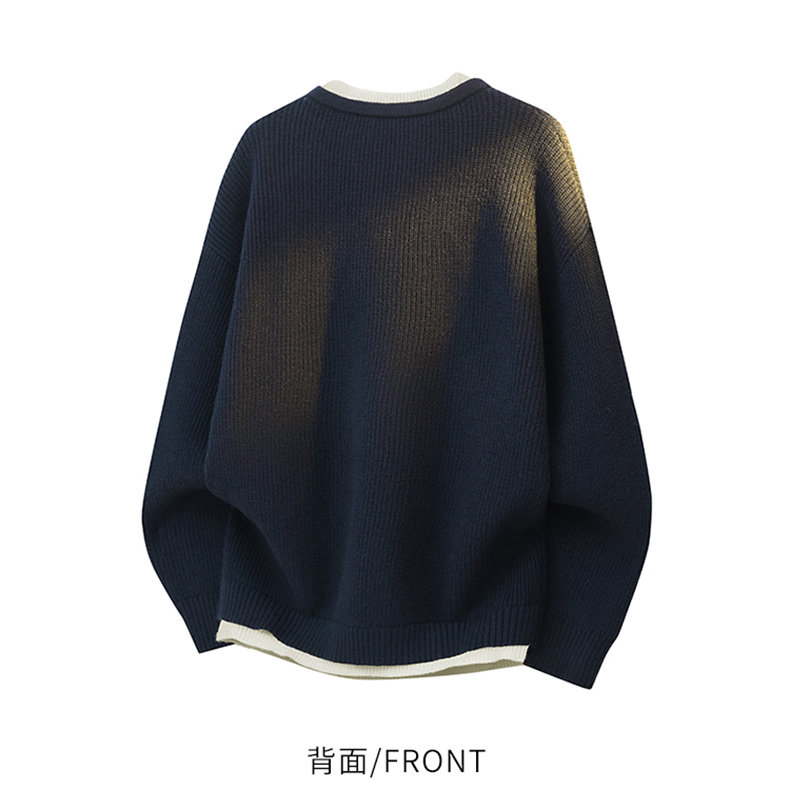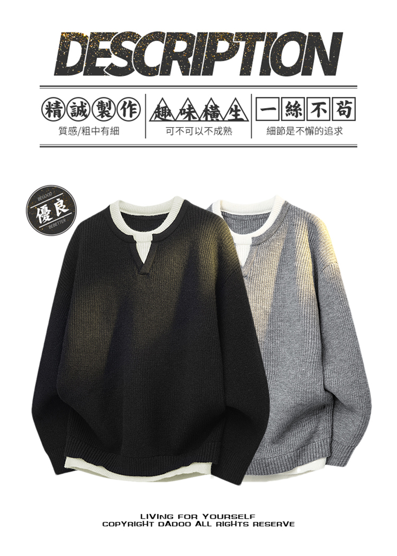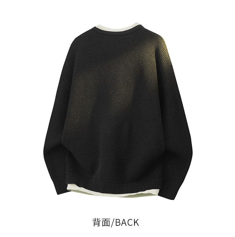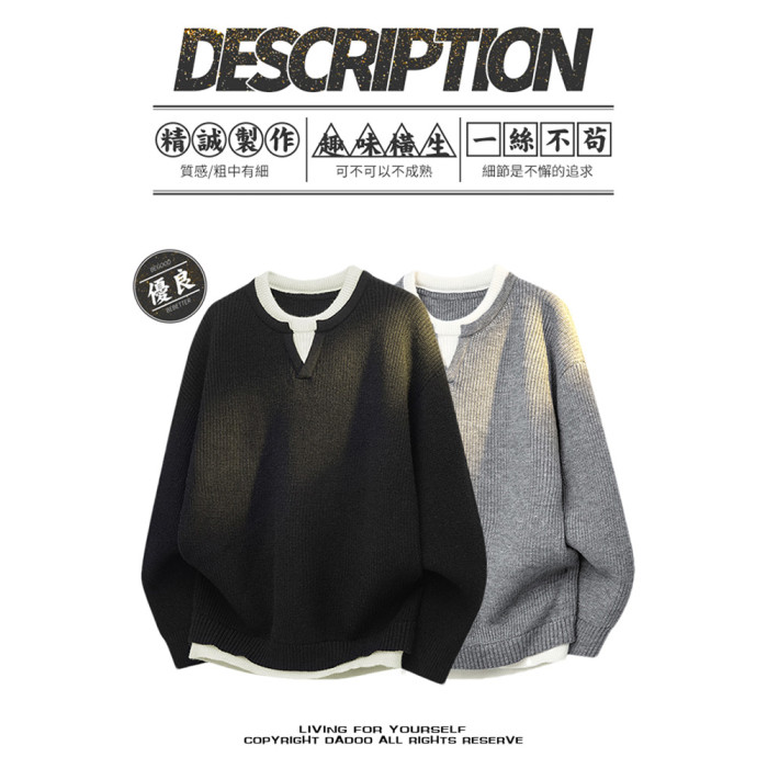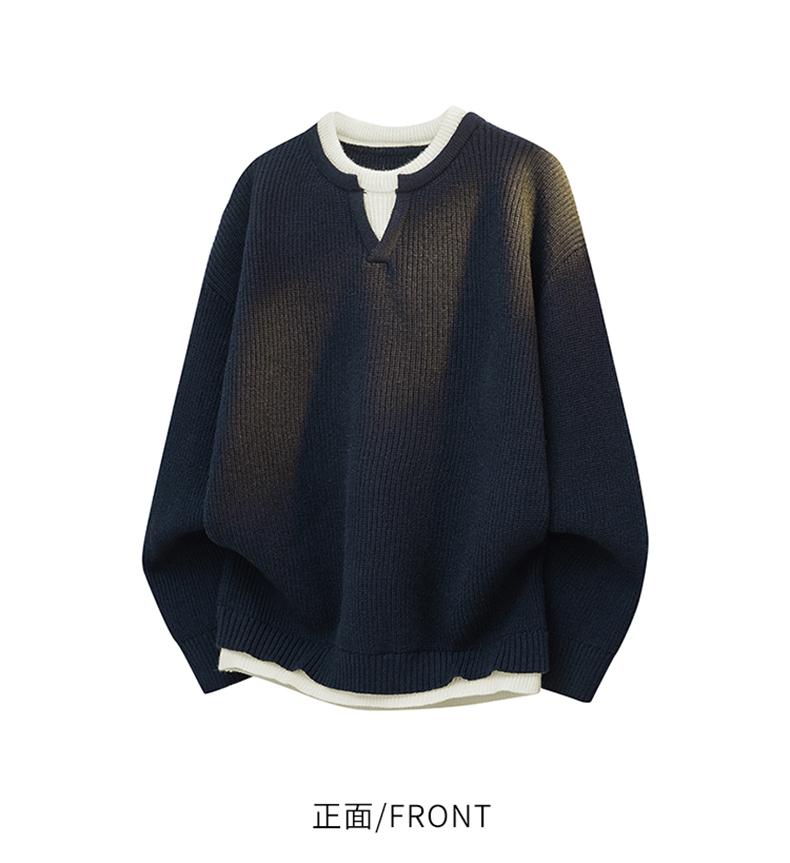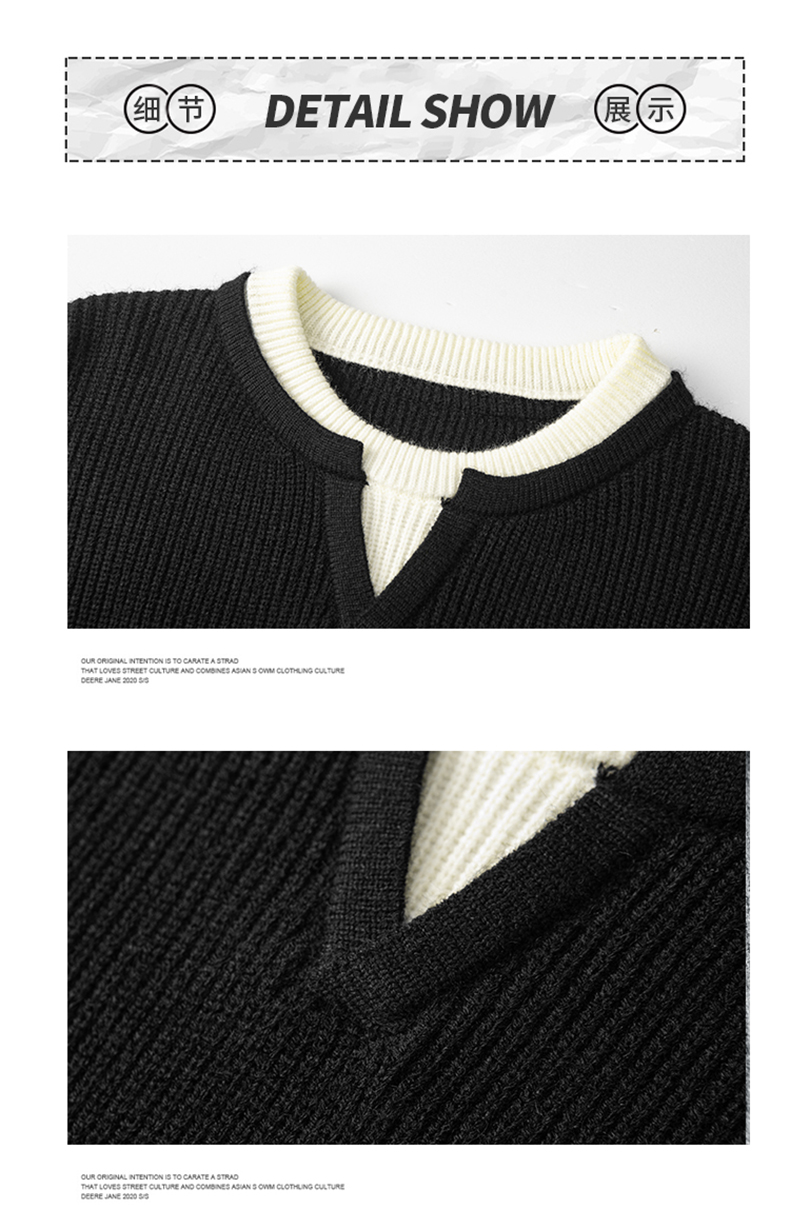 WOODSOON假兩件V圓領針織衫上衣秋冬新款寬松休閒男士慵懶風毛衣