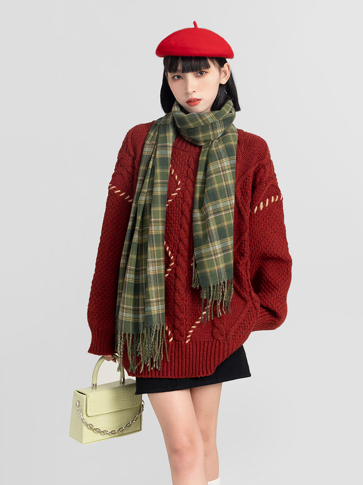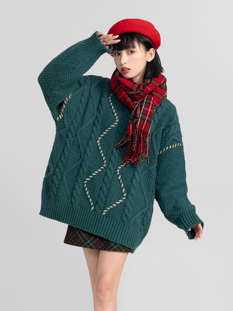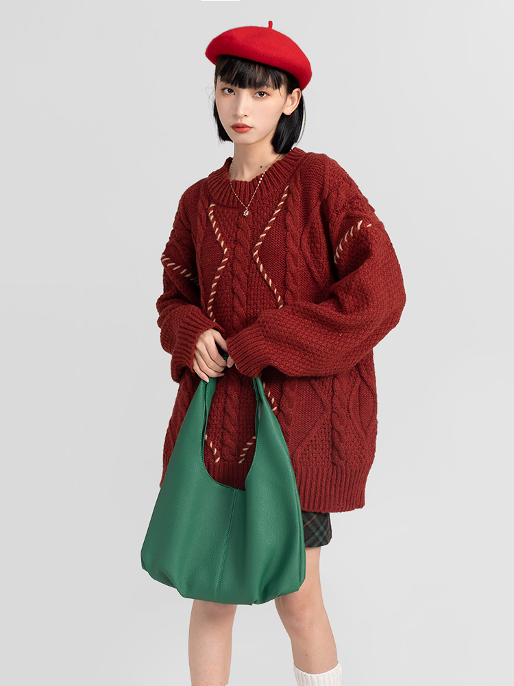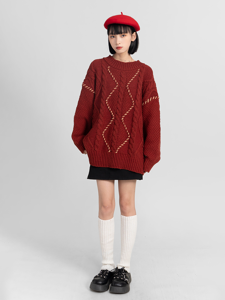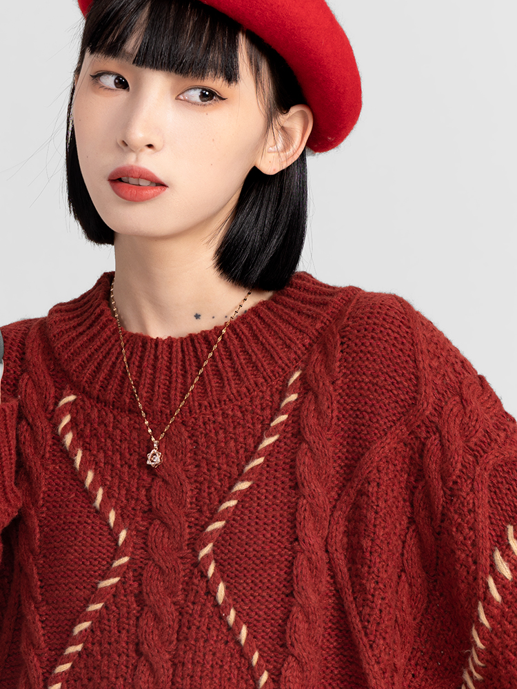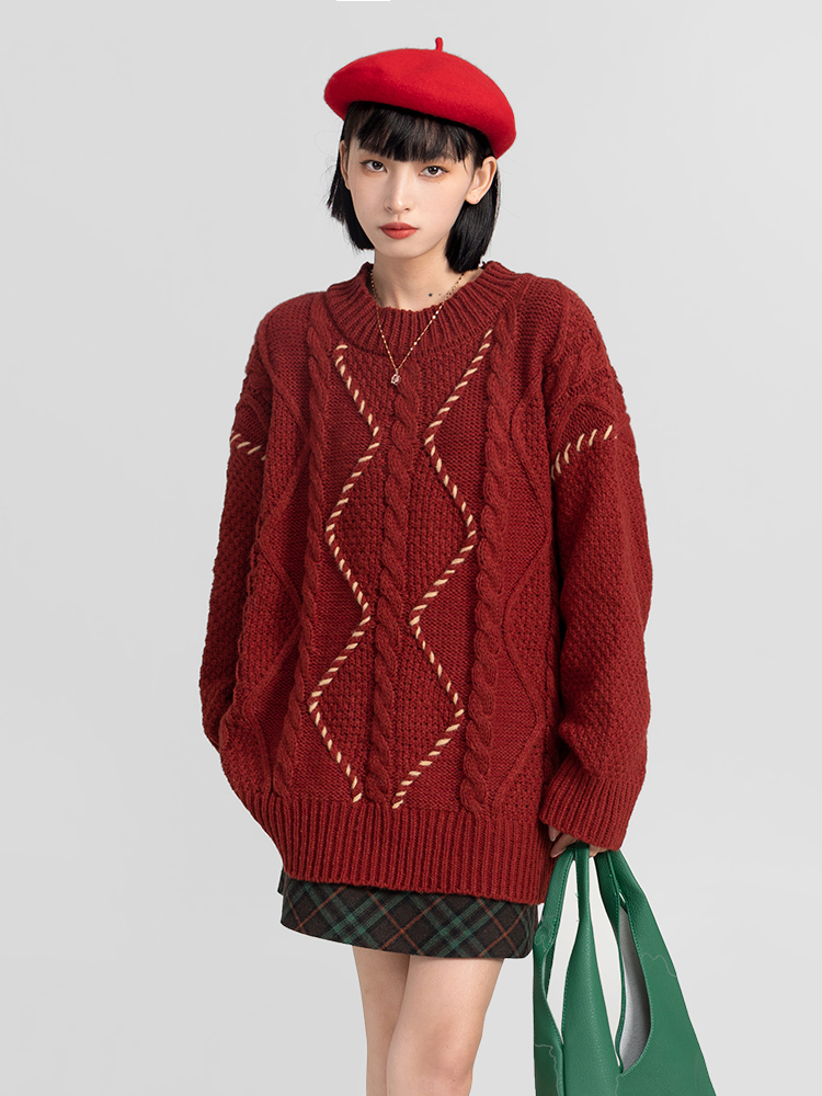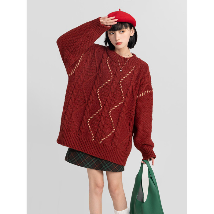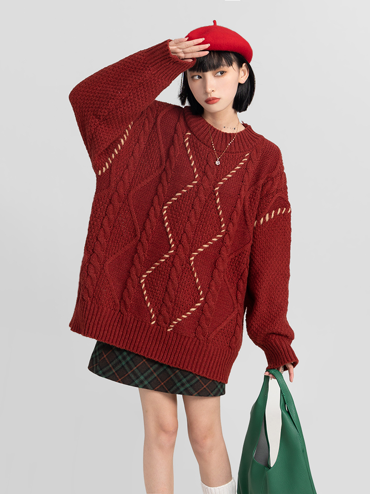 過年新年酒紅色麻花套頭毛衣女秋冬2025龍年本命龍年加厚冬季寬松