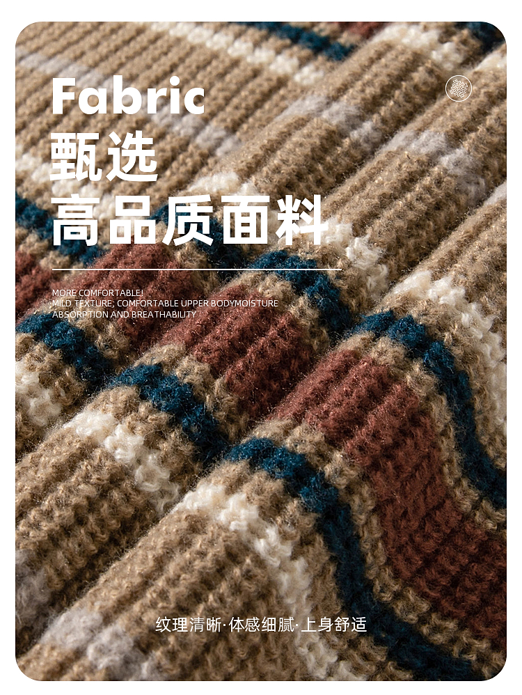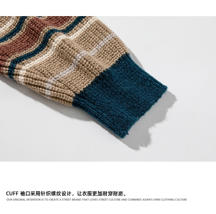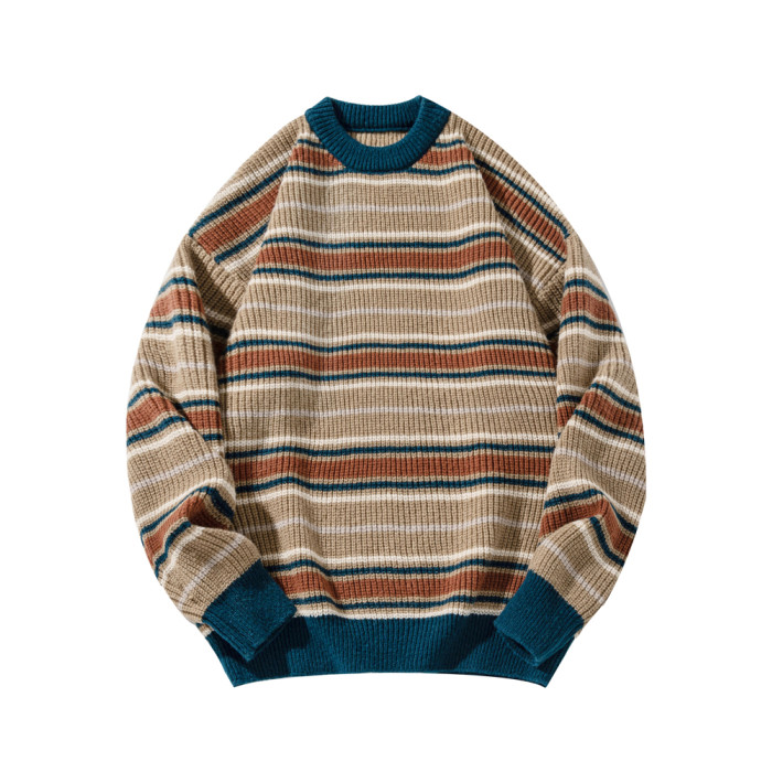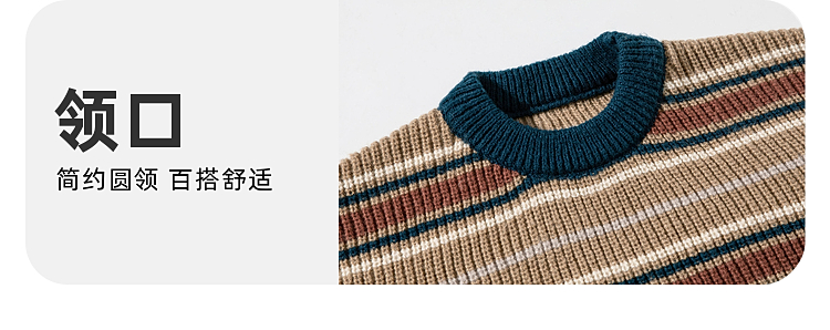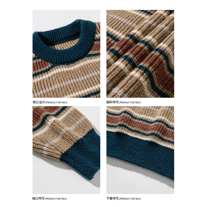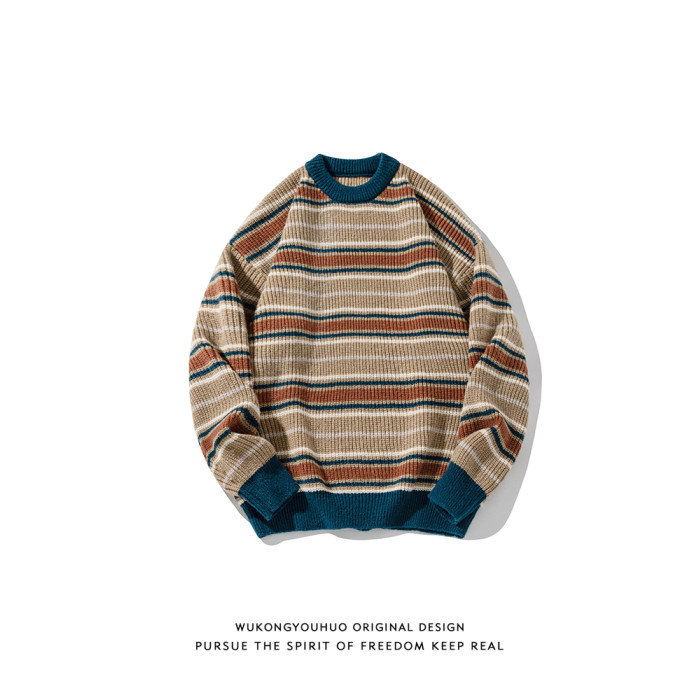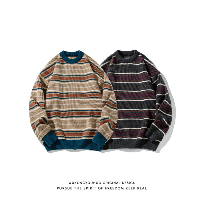 悟空有貨復古日系條紋高級感圓領毛衣男女秋冬情侶寬松休閒針織衫