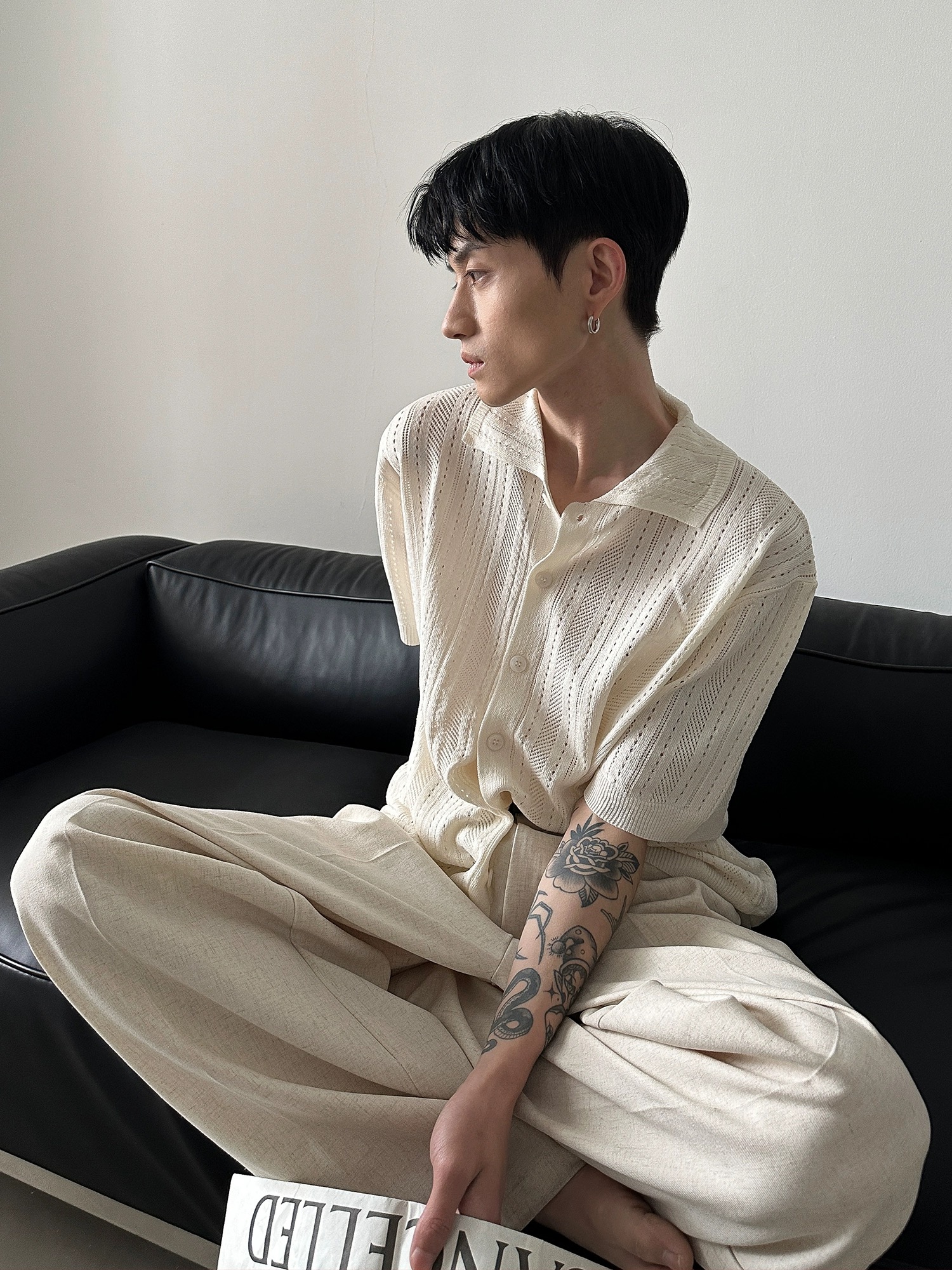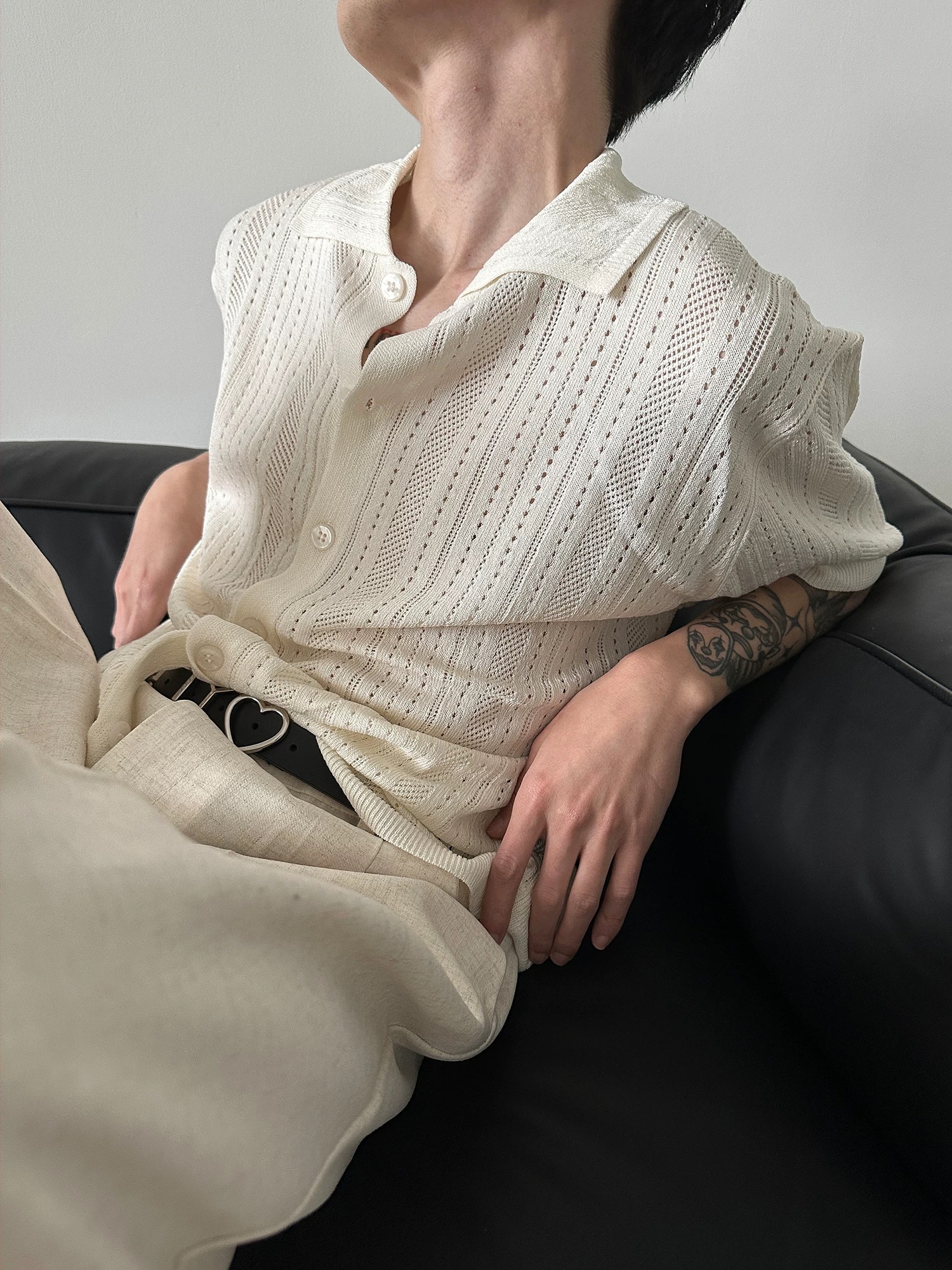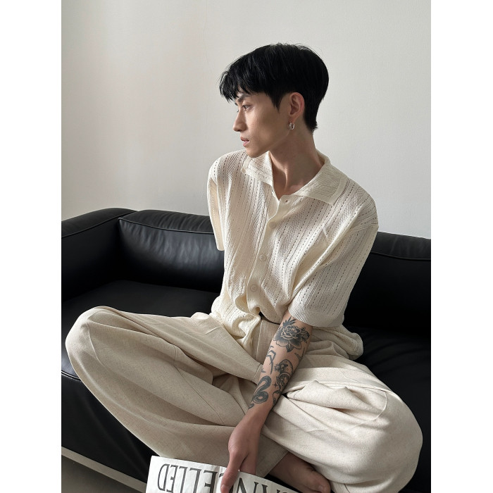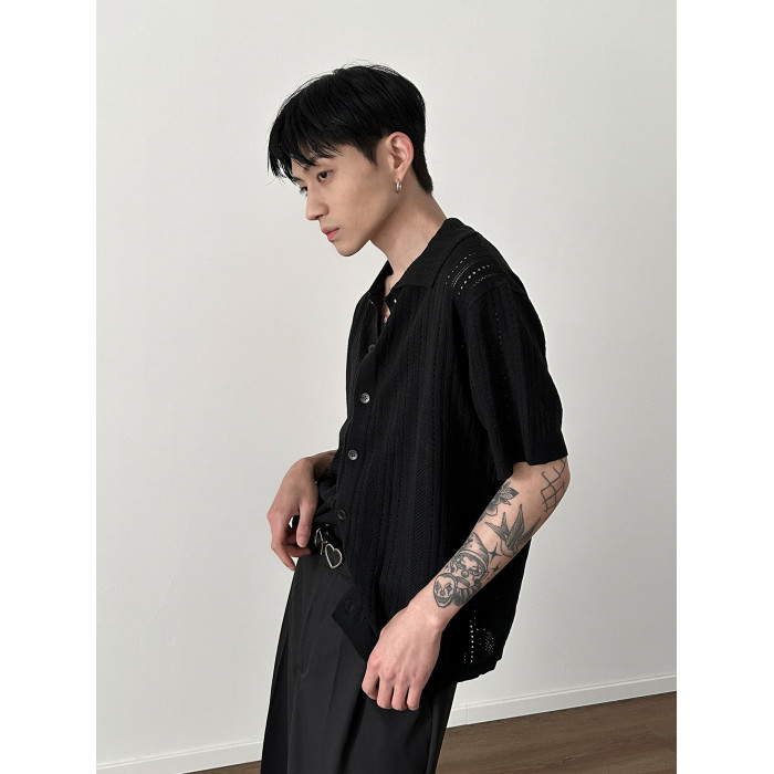 美式復古鏤空方領短袖針織衫夏季時髦寬松慵懶蕾絲半袖高級男襯衣