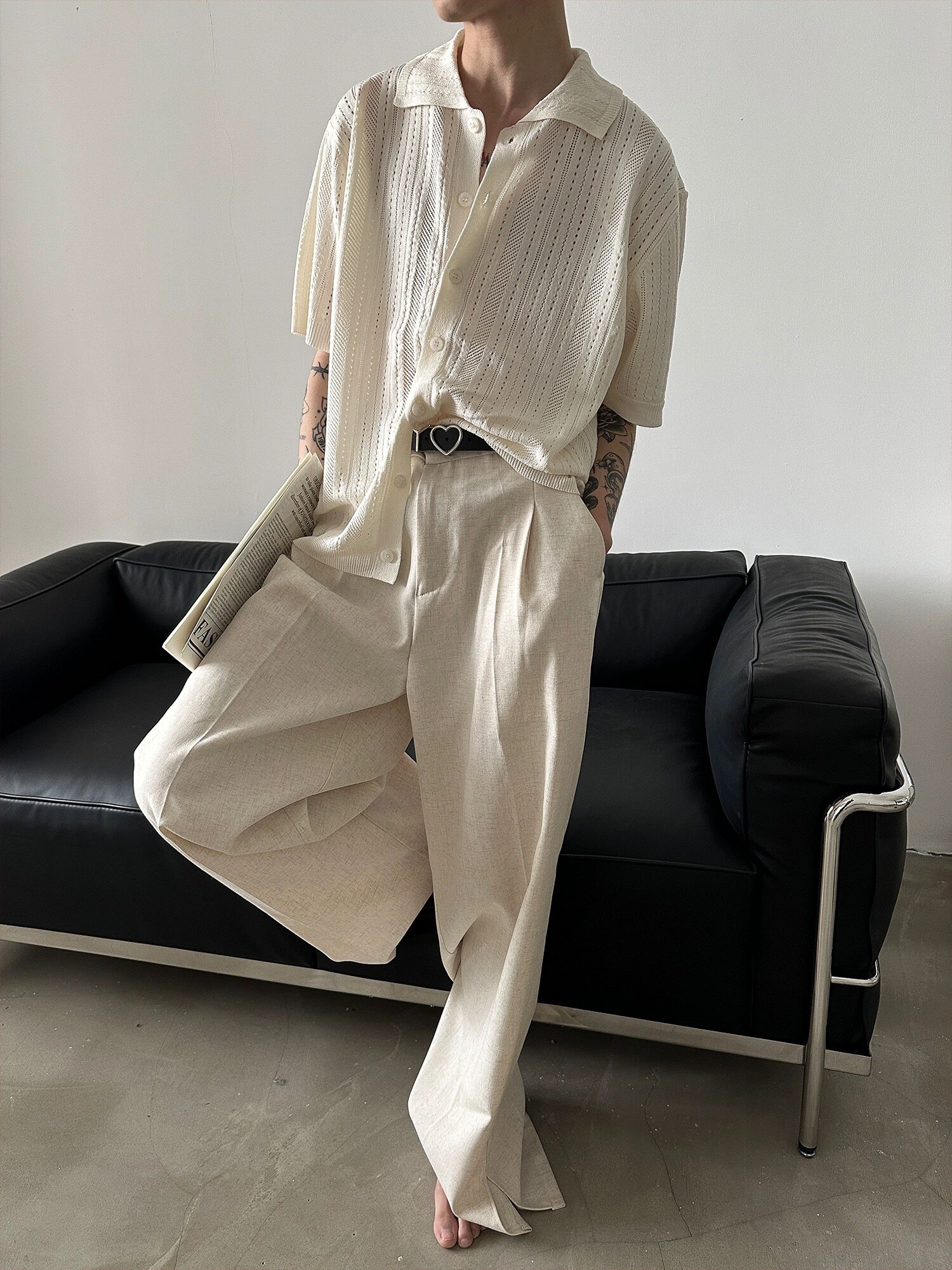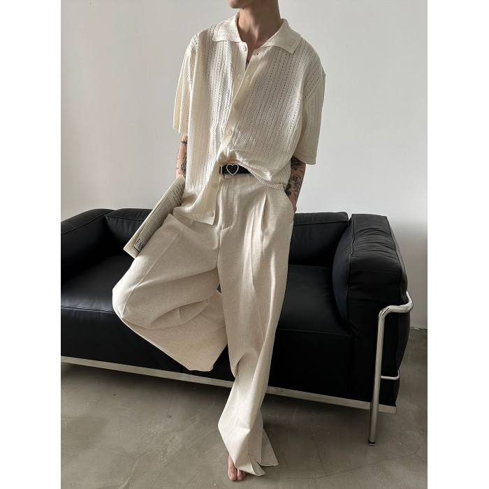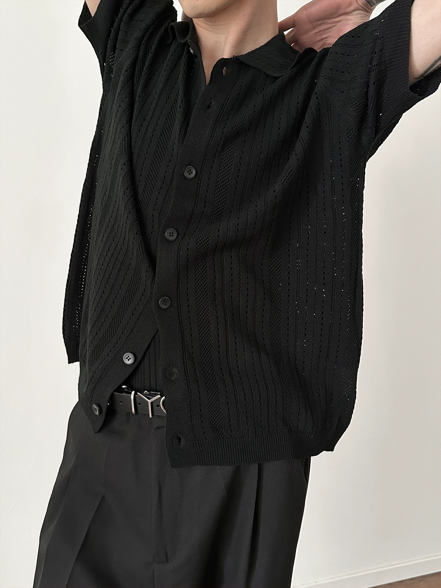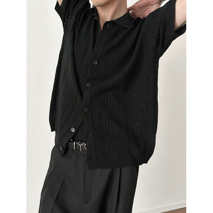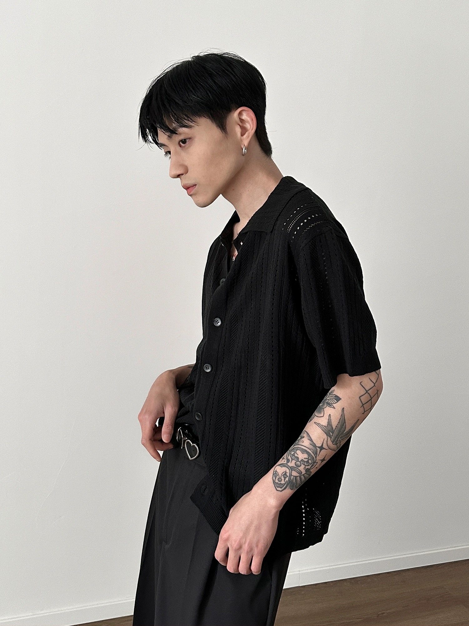 美式復古鏤空方領短袖針織衫夏季時髦寬松慵懶蕾絲半袖高級男襯衣