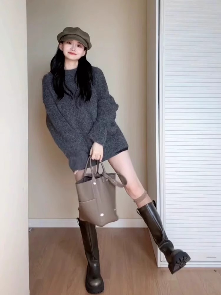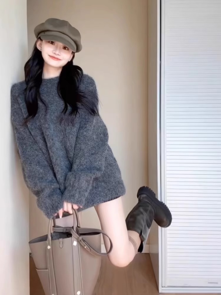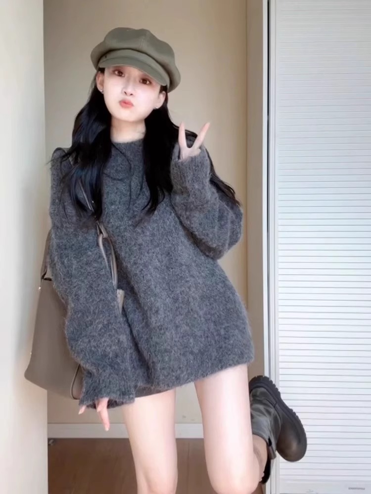 深秋初冬穿搭灰色寬松慵懶風中長款海馬毛毛衣女美拉德針織衫上衣