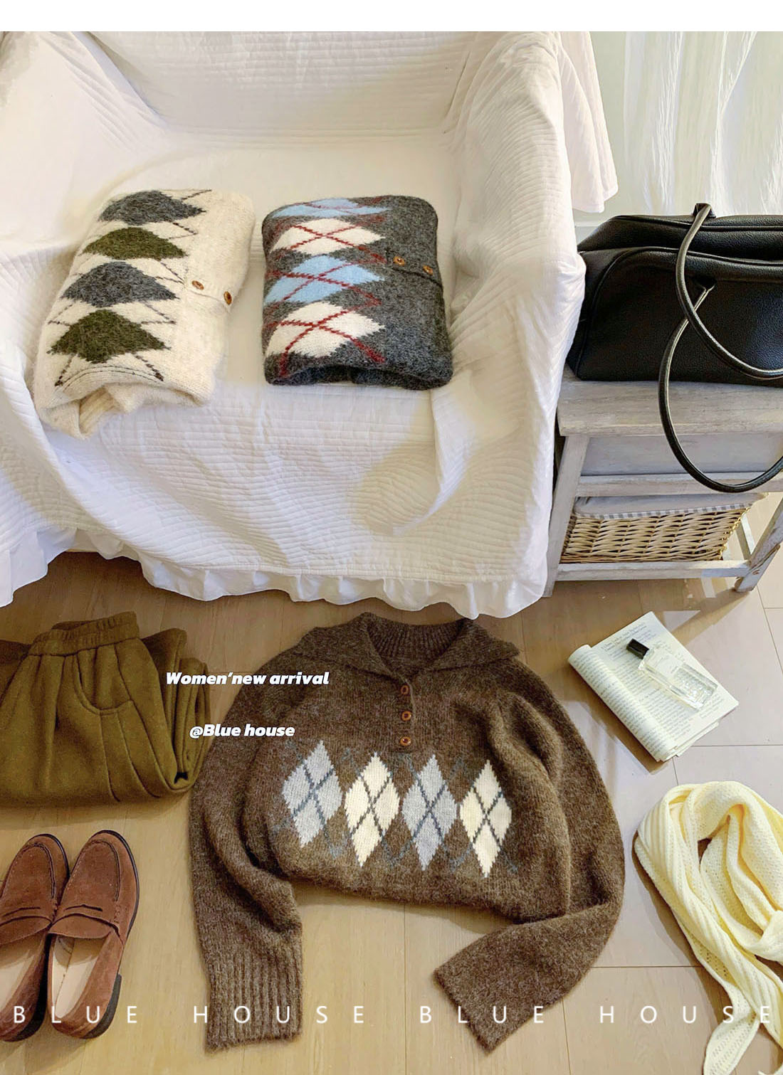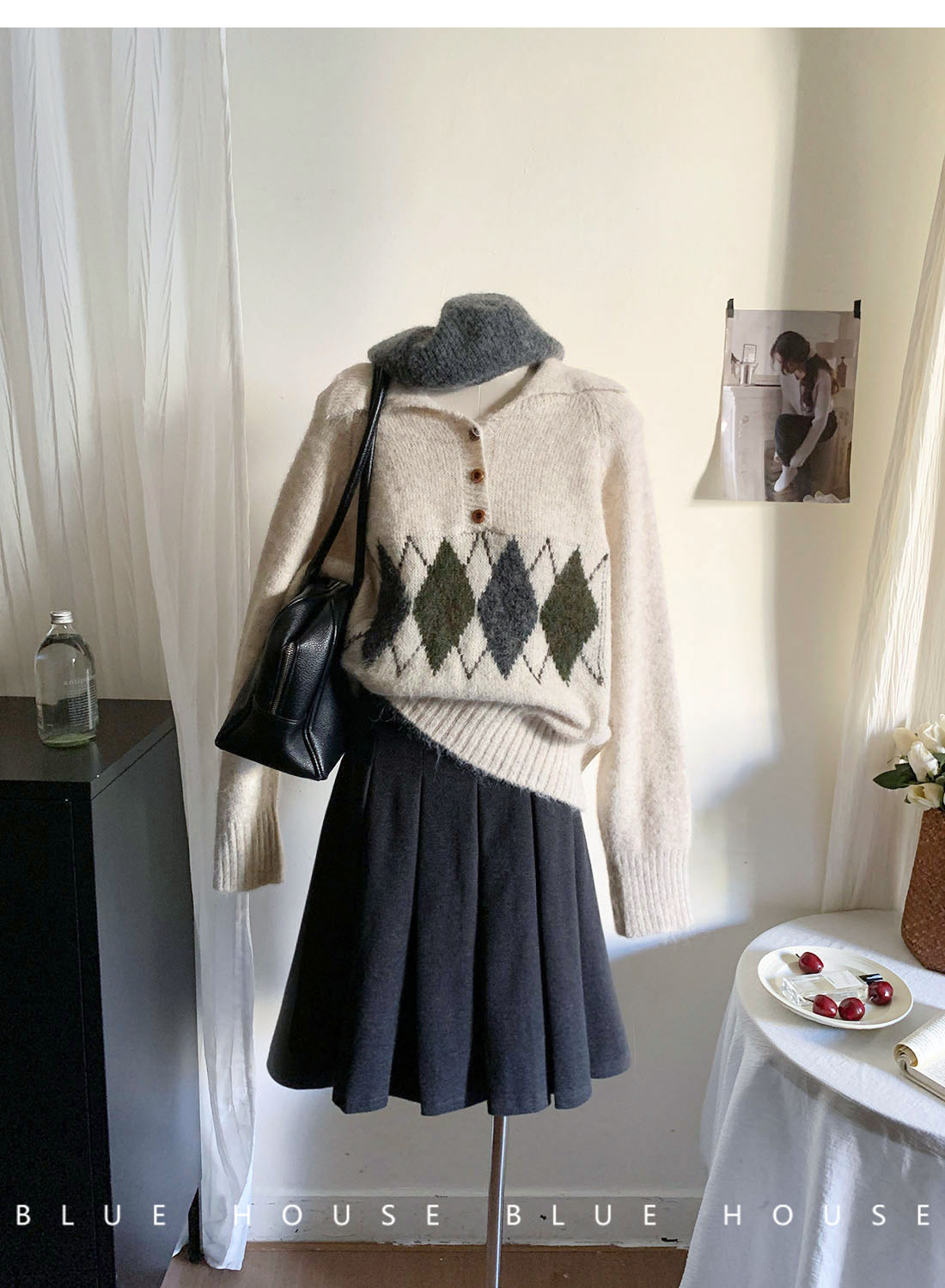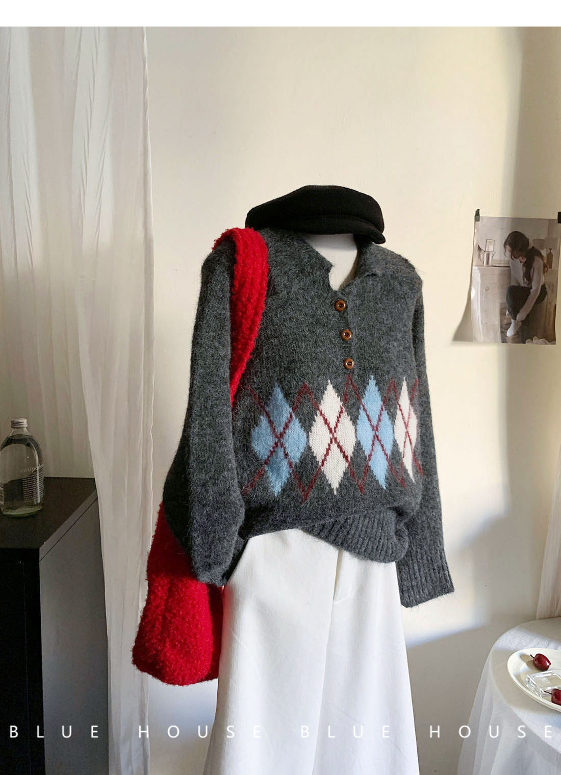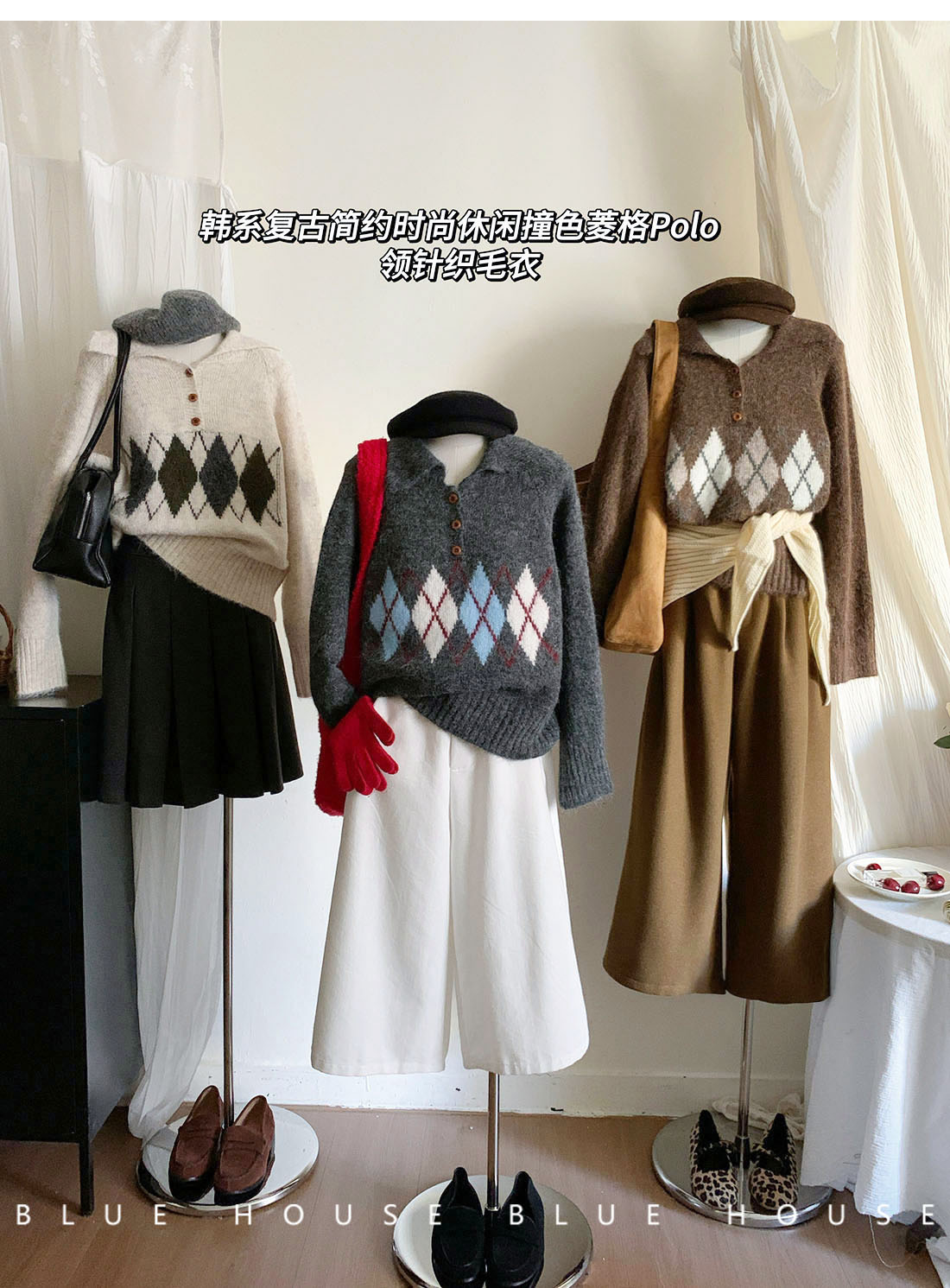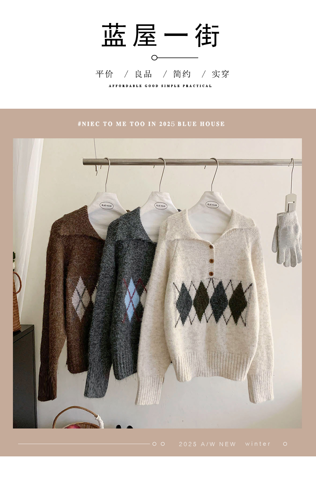 日系學院風復古撞色菱格翻領套頭毛衣女冬加厚軟糯寬松針織衫上衣