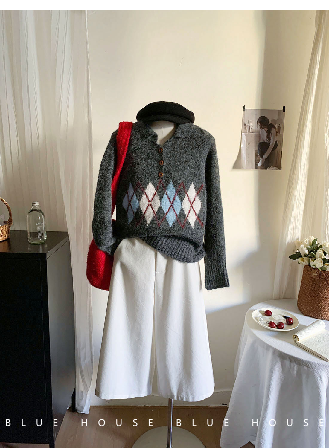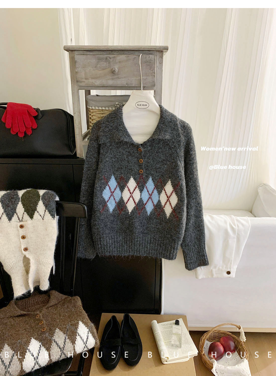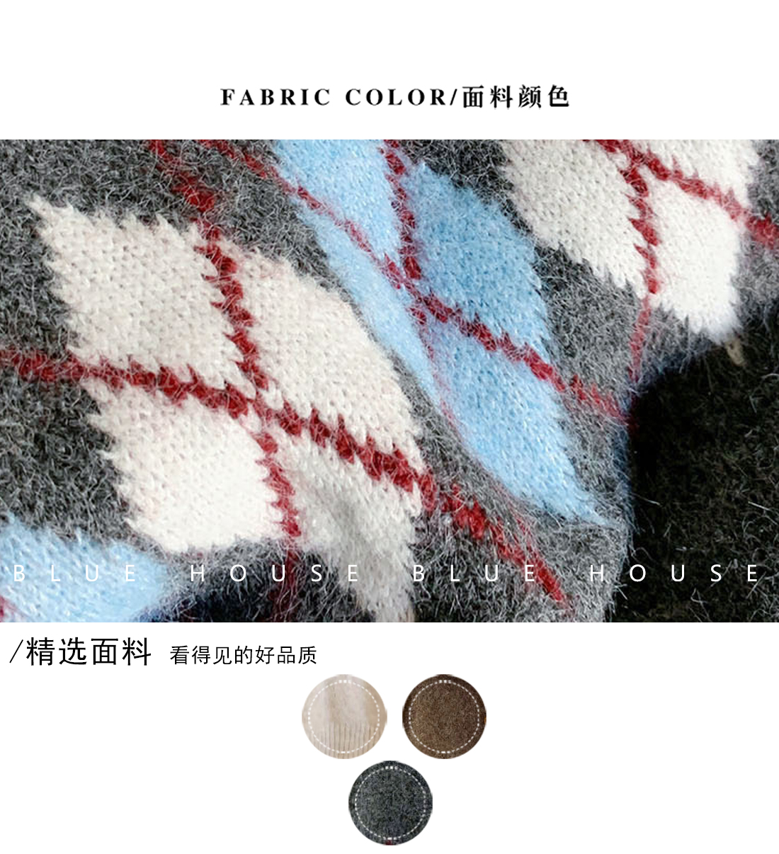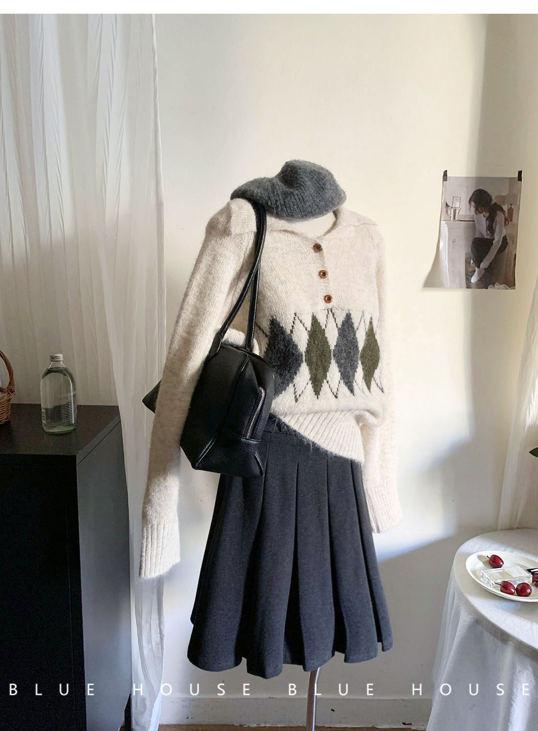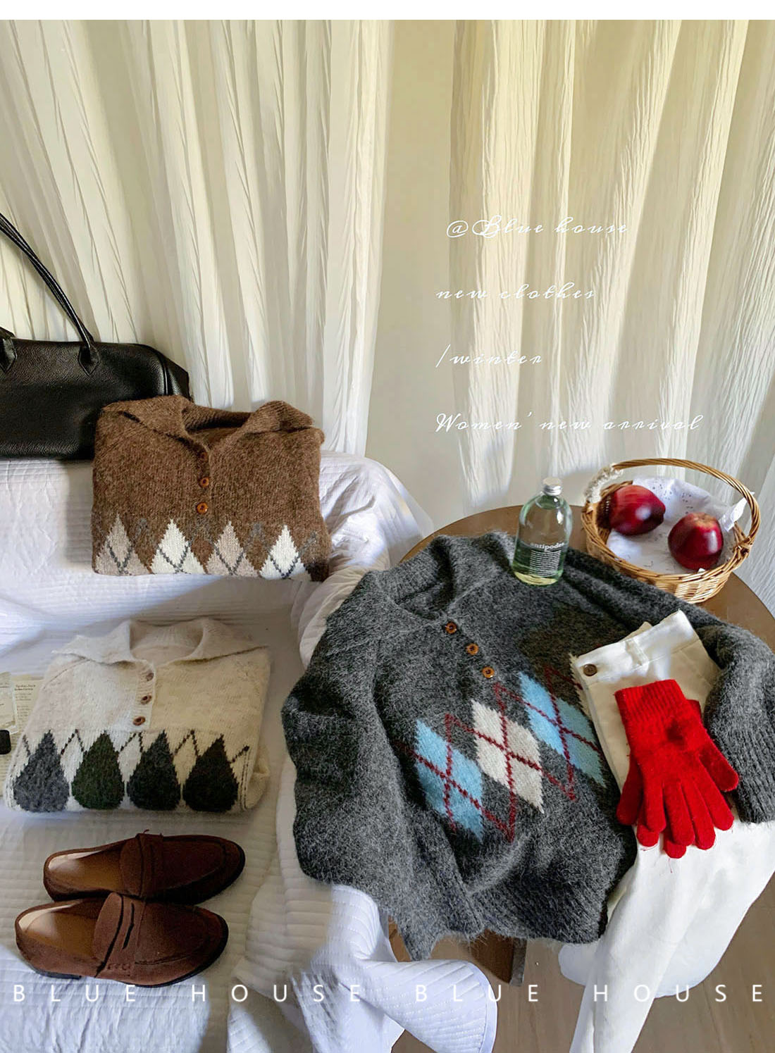 日系學院風復古撞色菱格翻領套頭毛衣女冬加厚軟糯寬松針織衫上衣