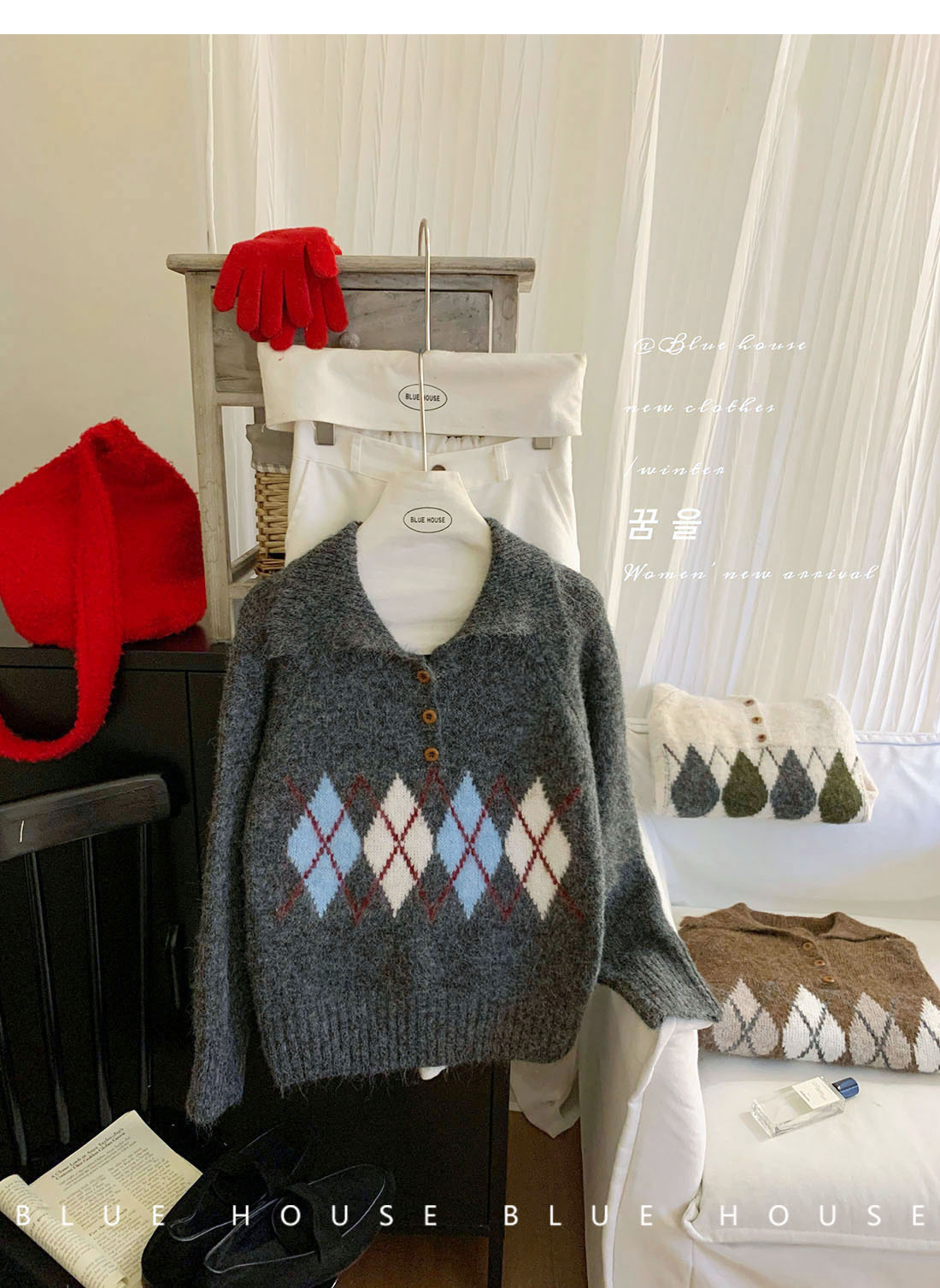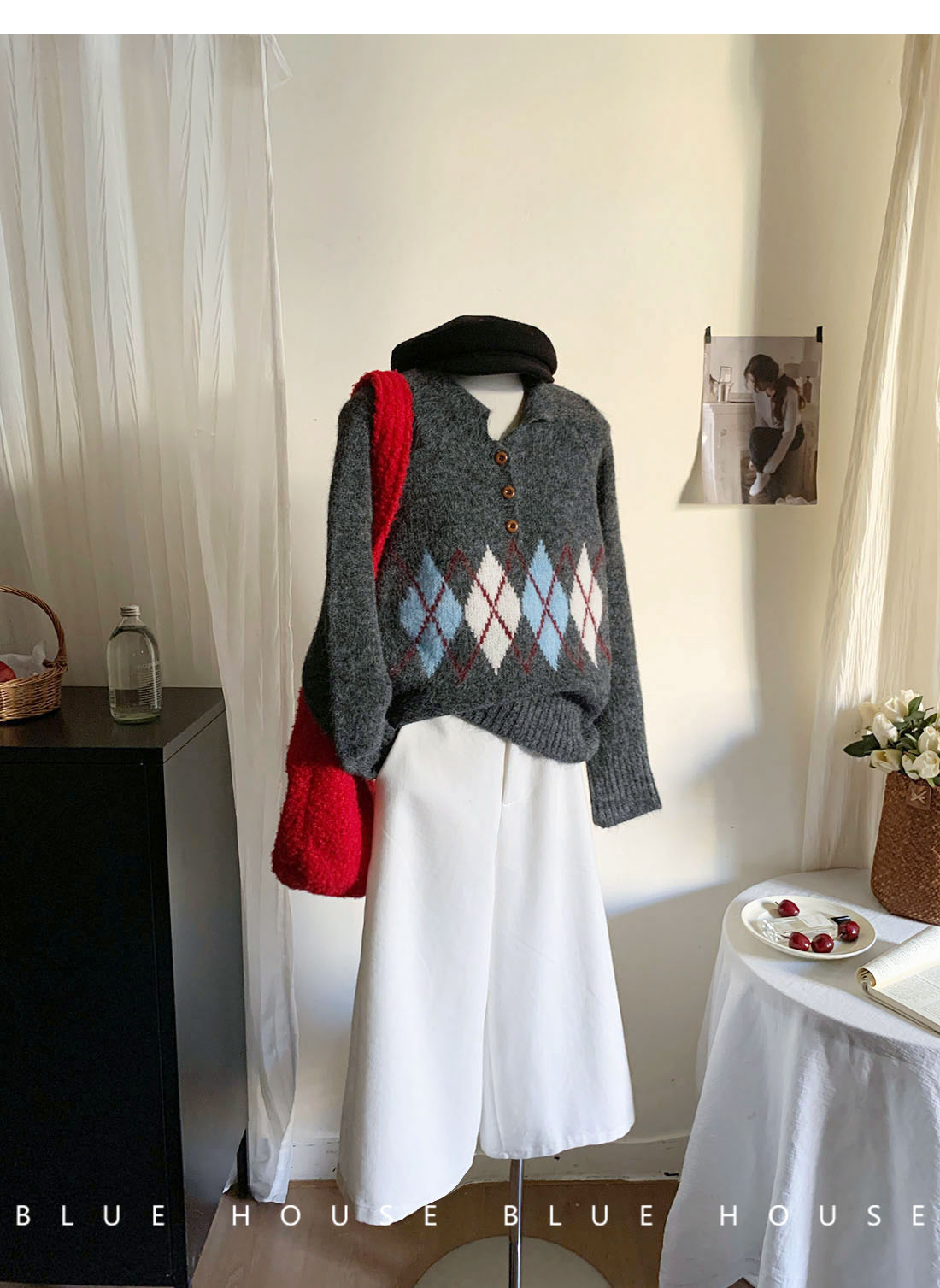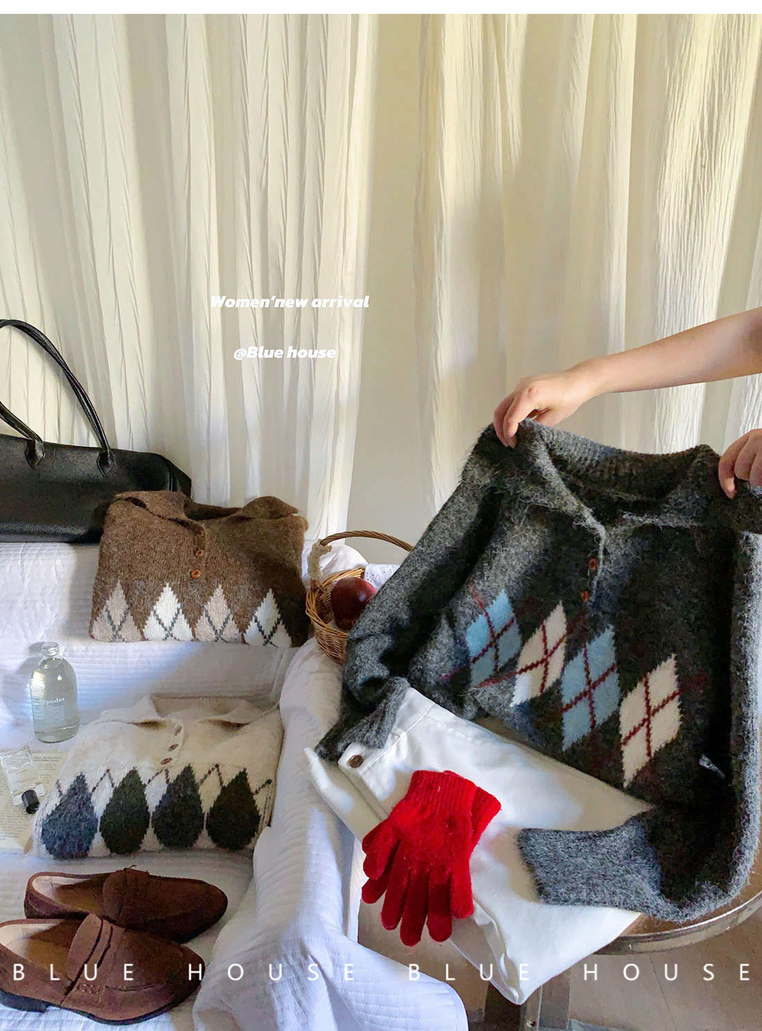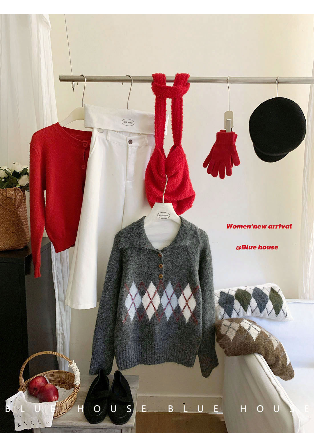 日系學院風復古撞色菱格翻領套頭毛衣女冬加厚軟糯寬松針織衫上衣