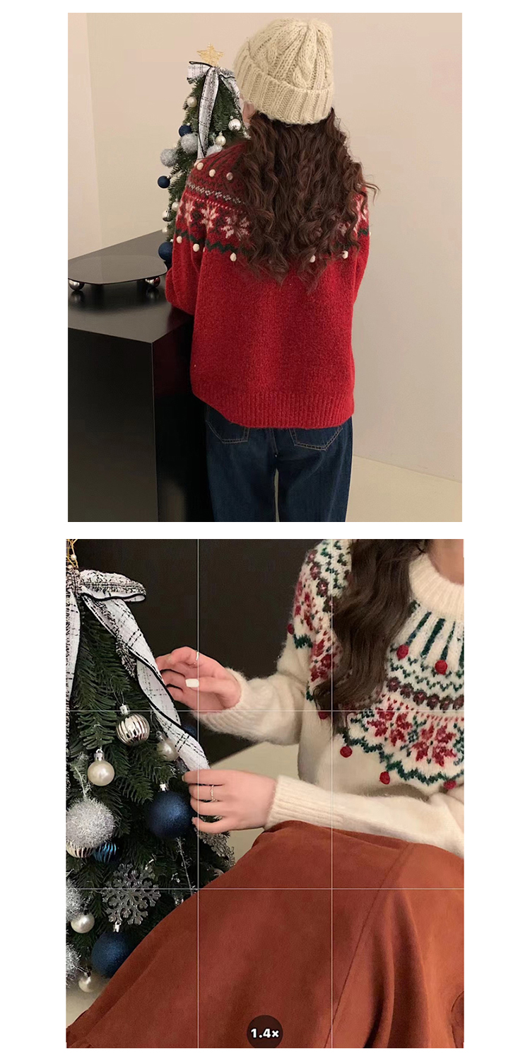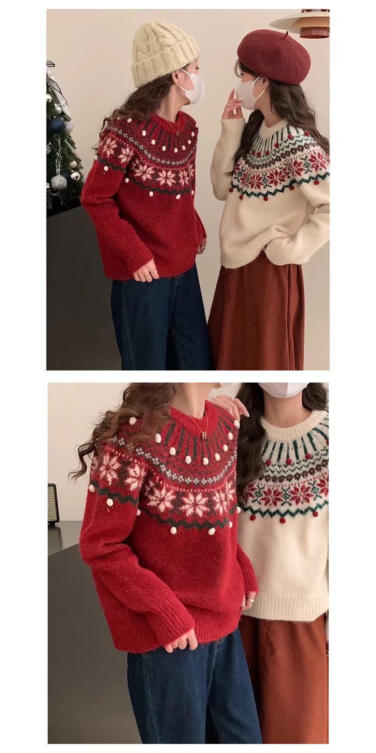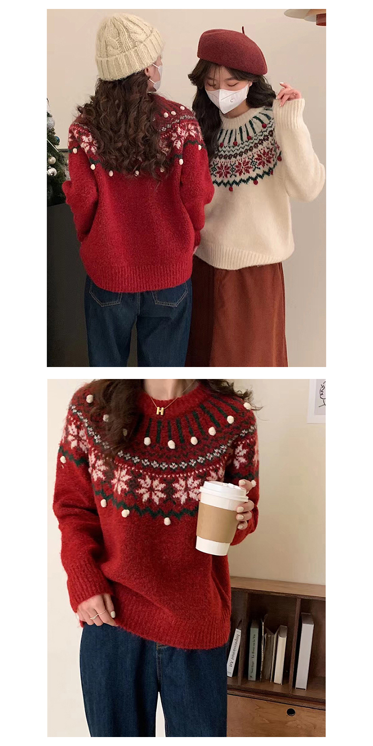 復古提花聖誕新年紅色費爾島毛衣女套頭寬松秋冬加厚內搭針織上衣