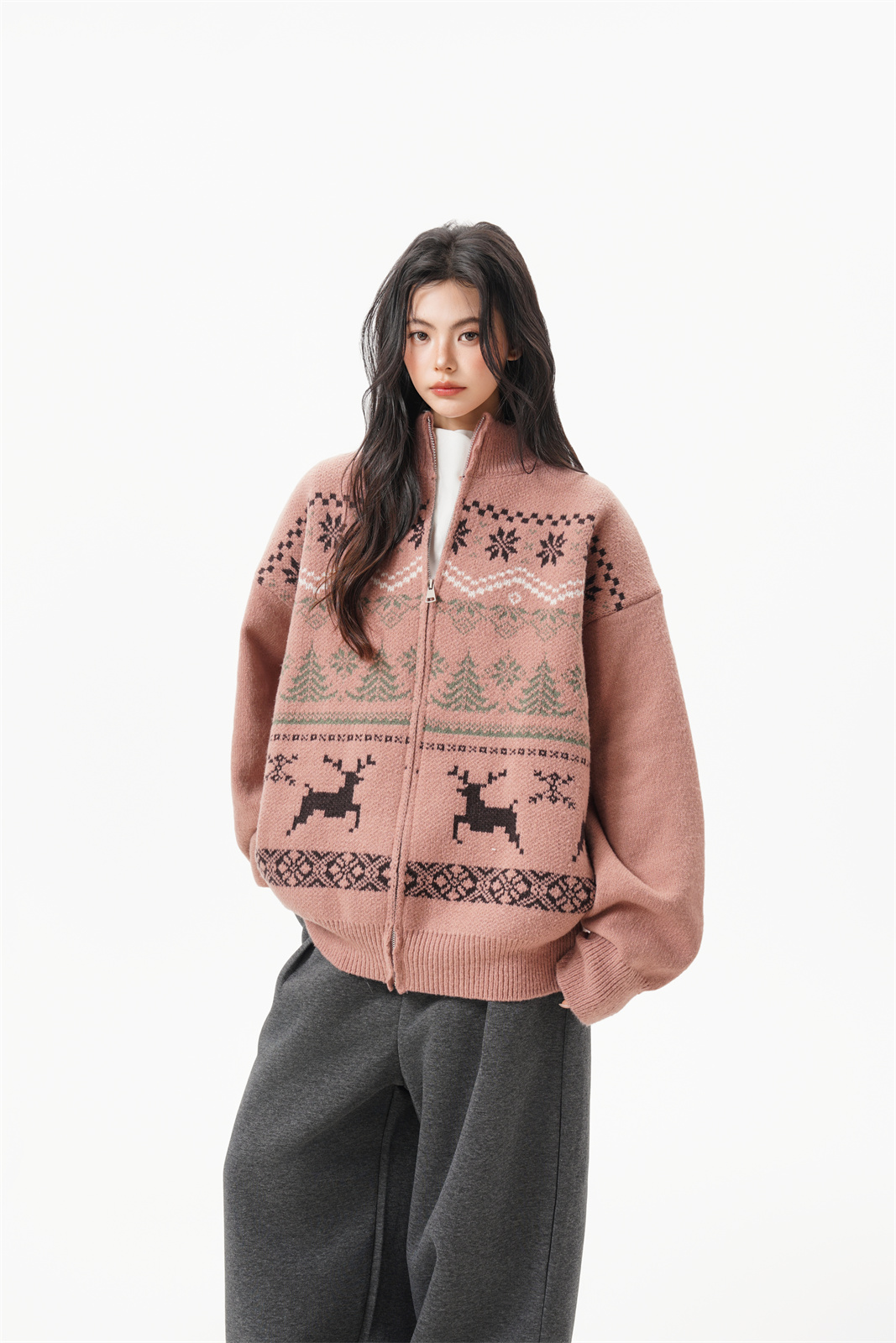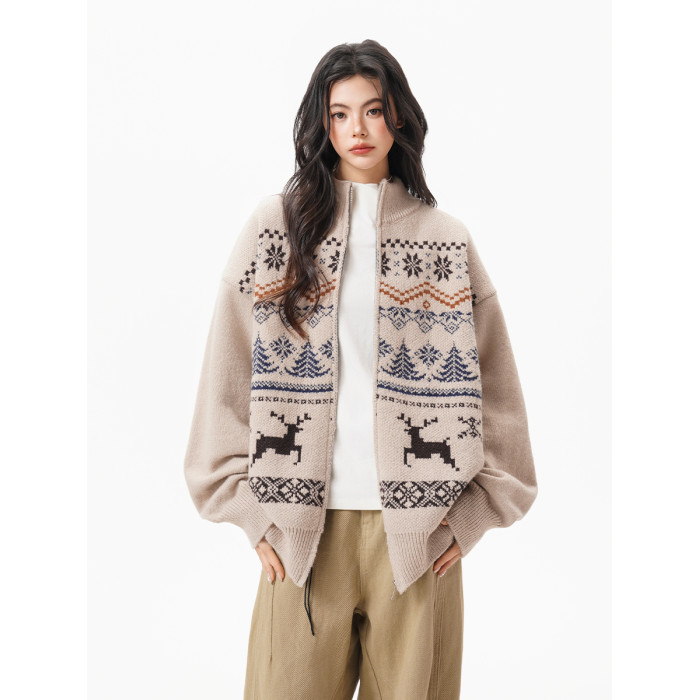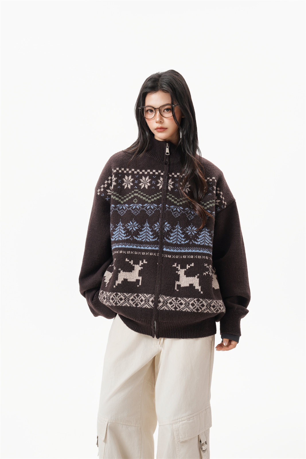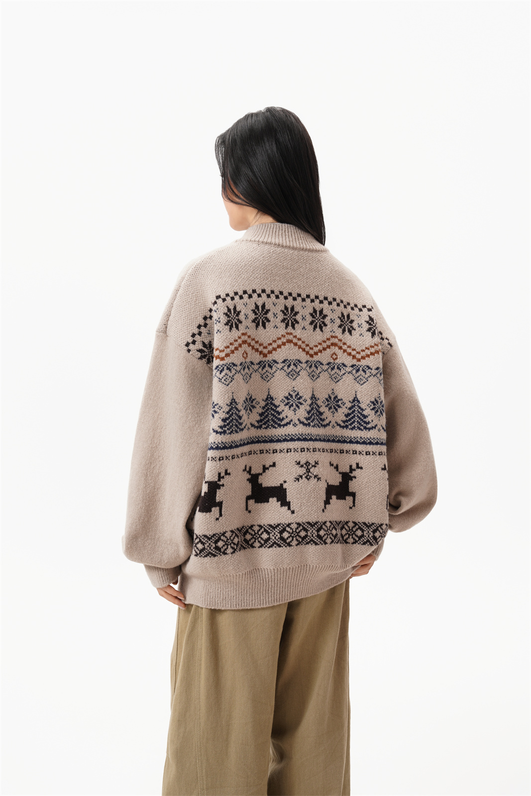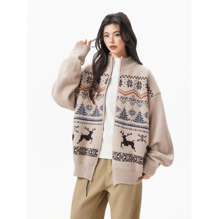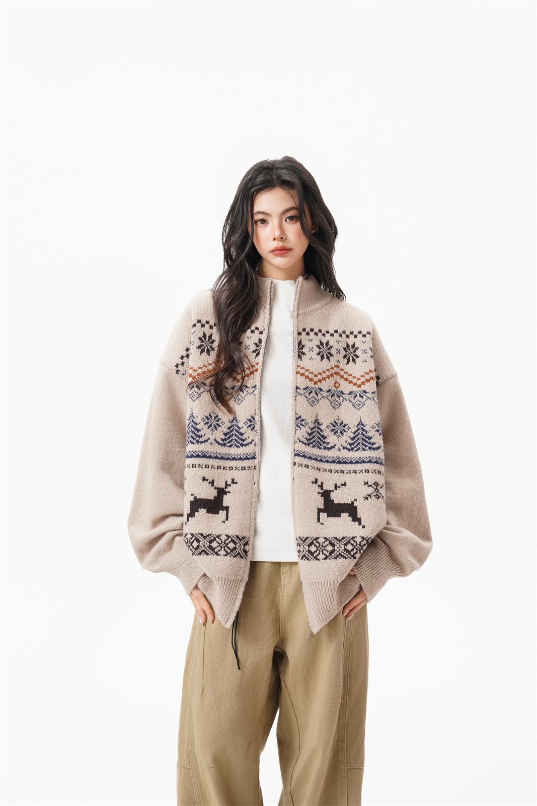 費爾島提花開衫毛衣女男秋冬季復古撞色拉鍊針織衫松弛感休閒外套