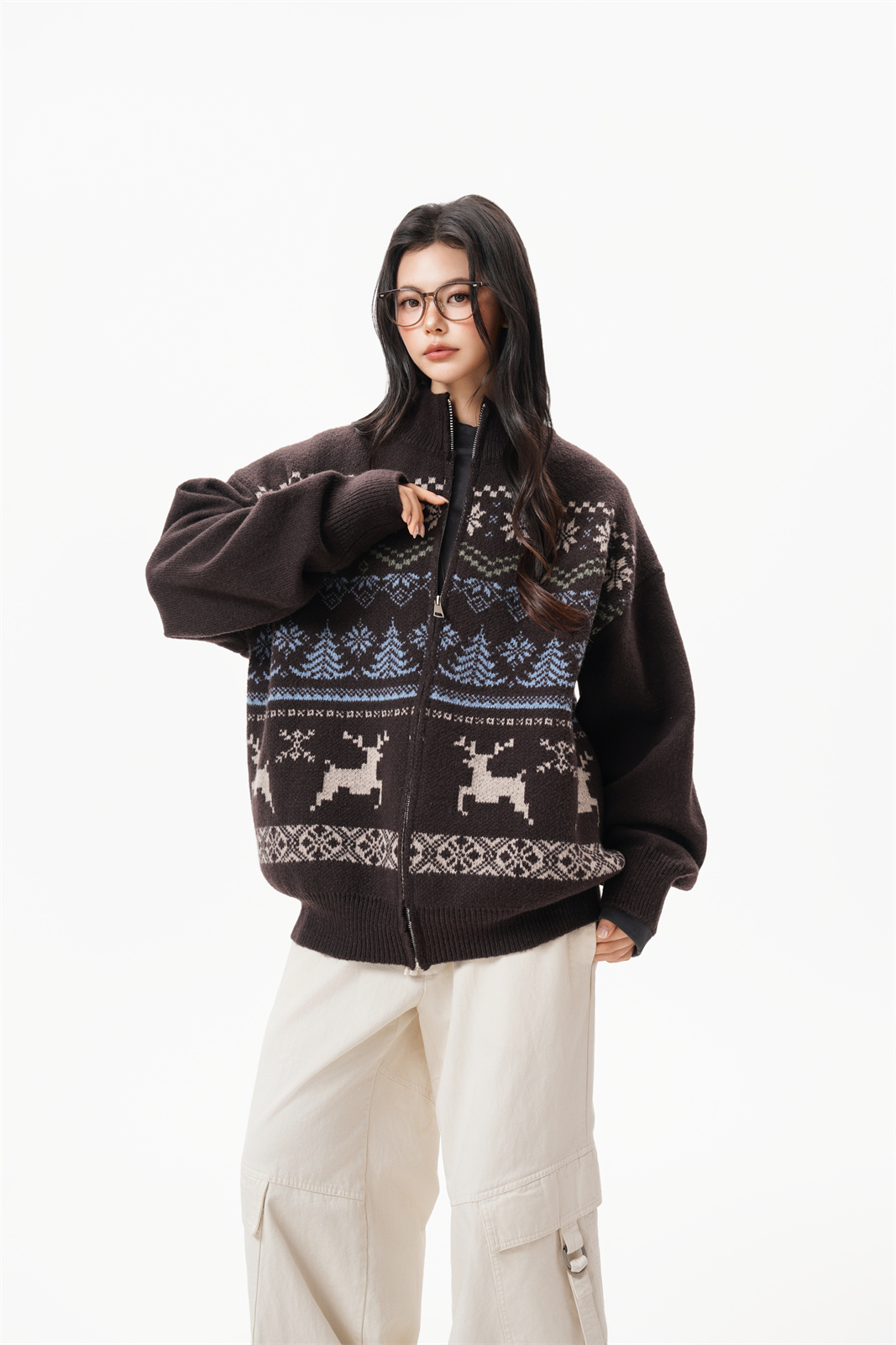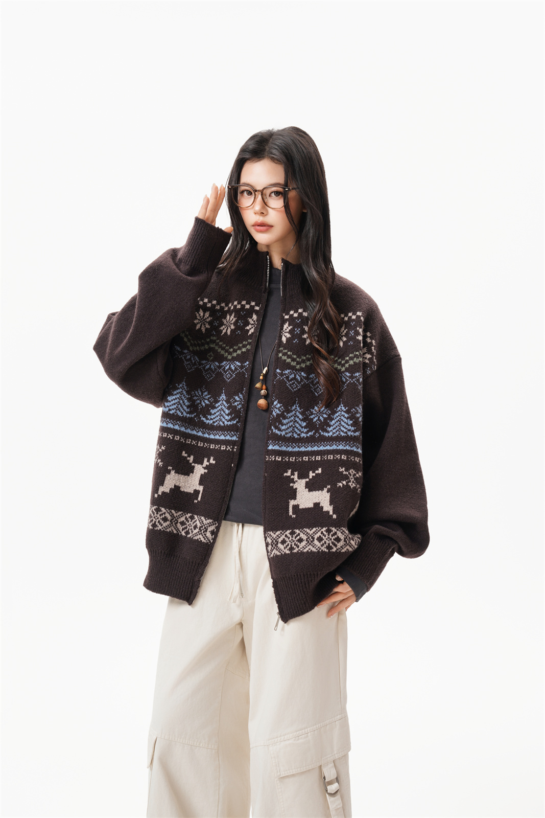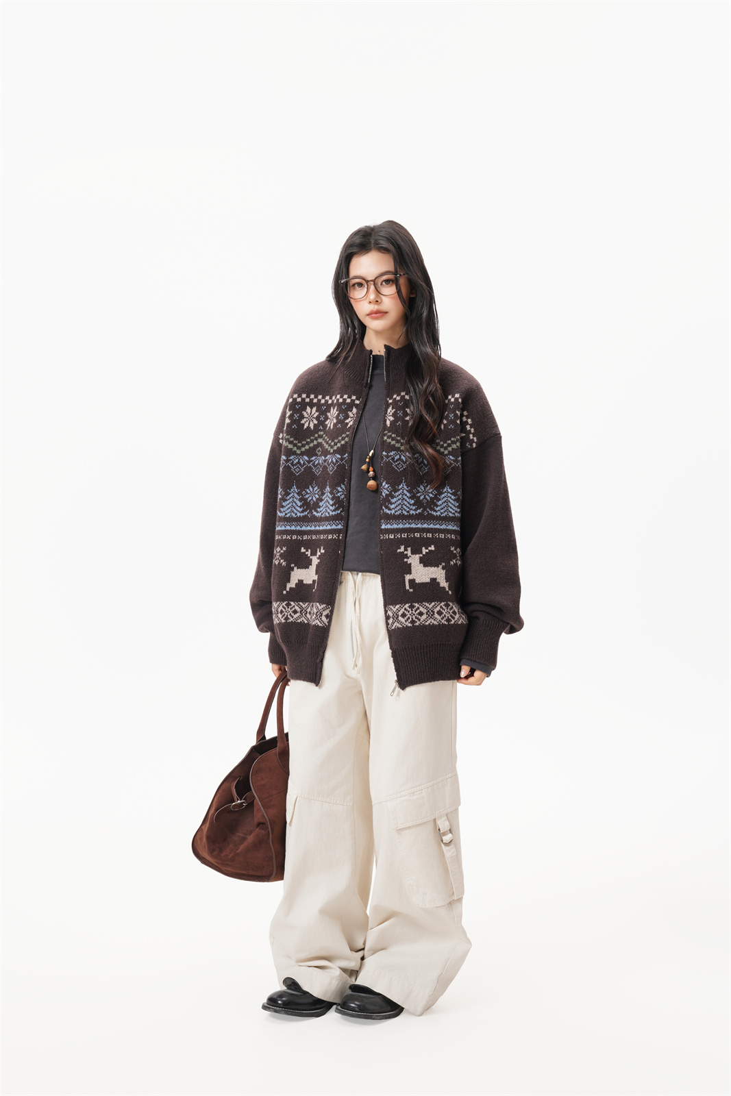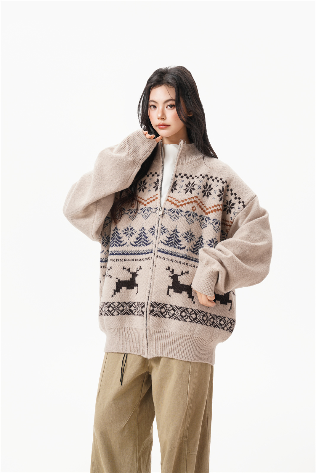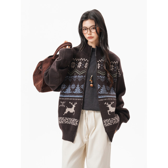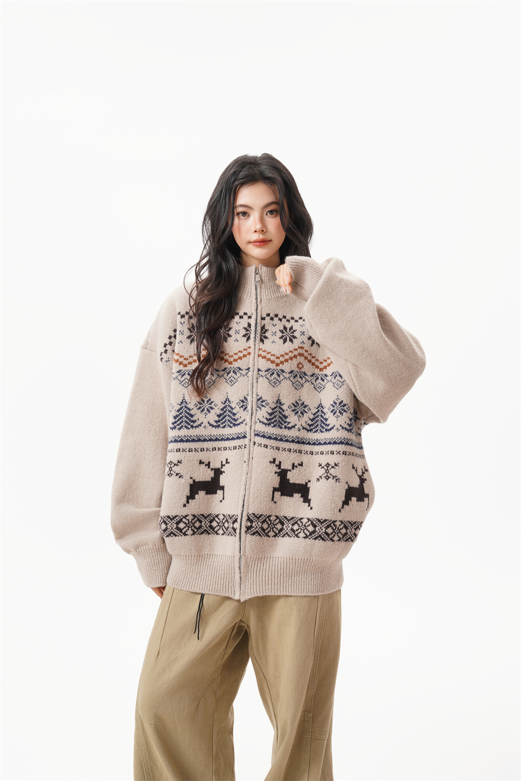 費爾島提花開衫毛衣女男秋冬季復古撞色拉鍊針織衫松弛感休閒外套