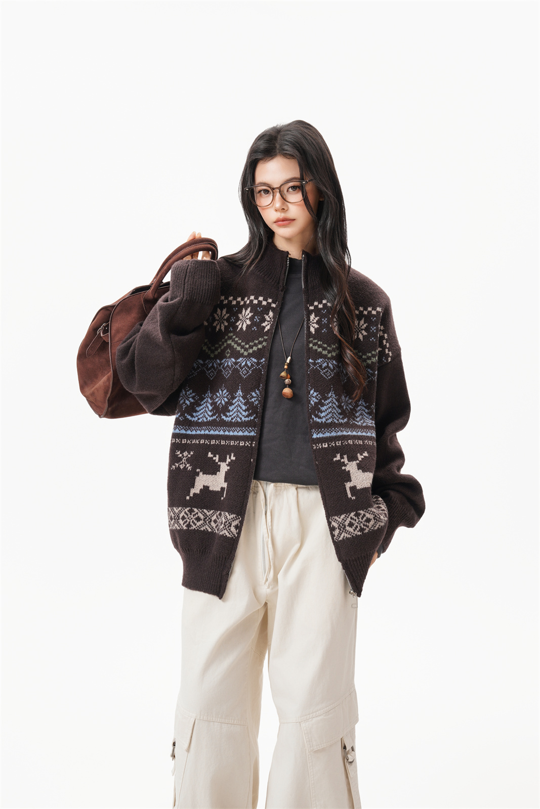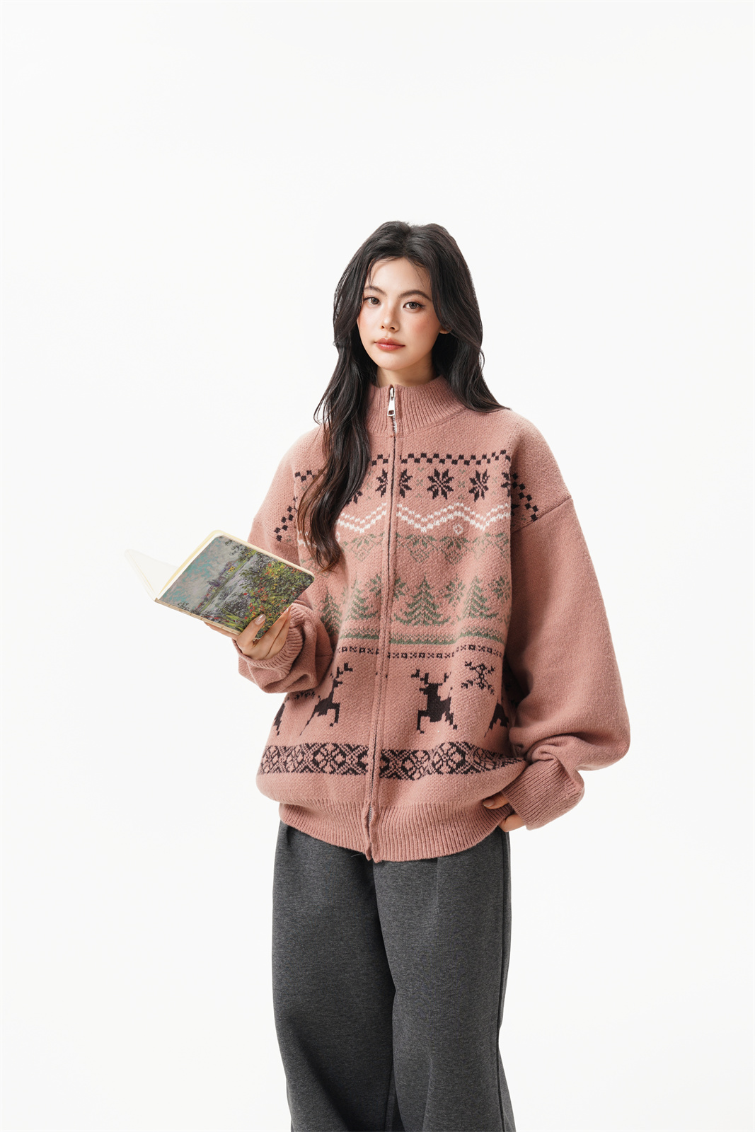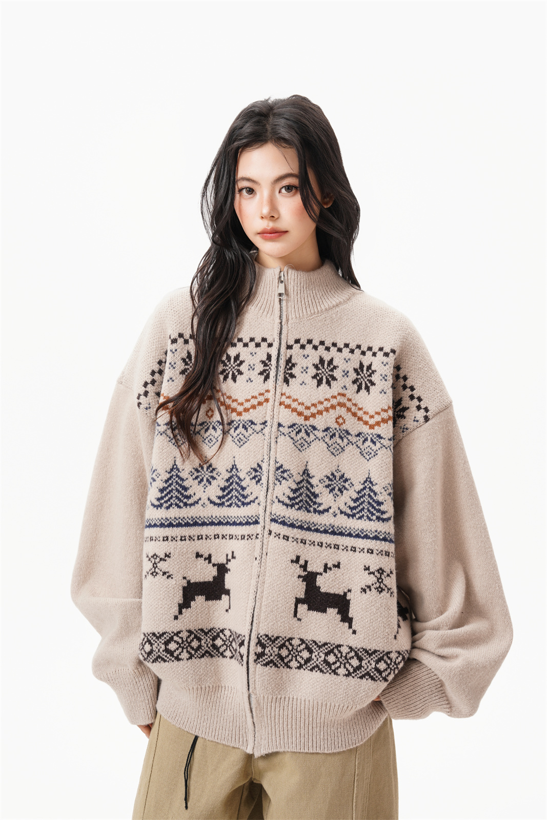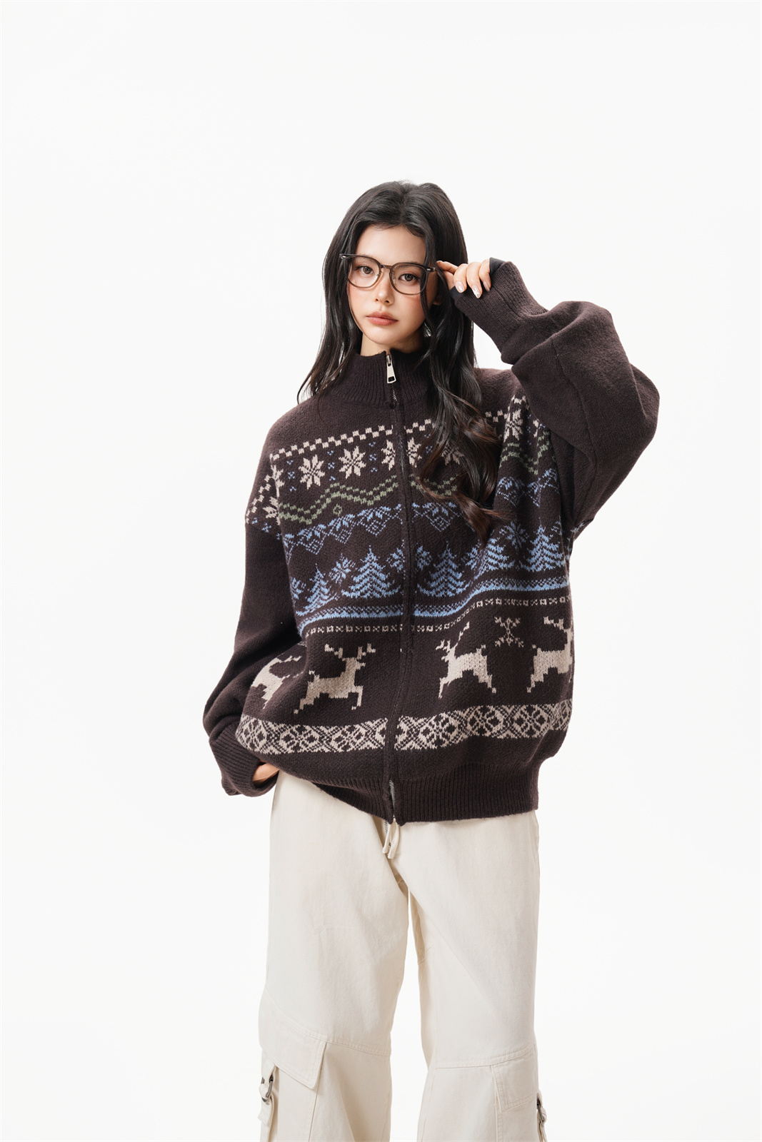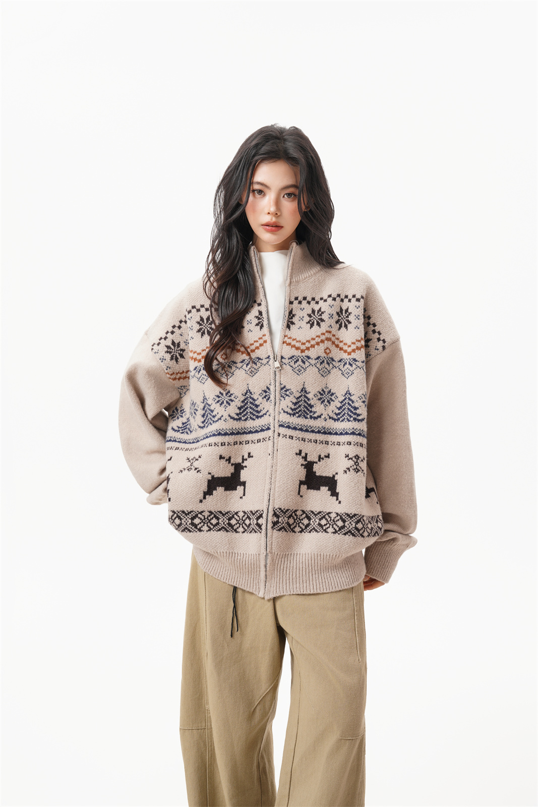 費爾島提花開衫毛衣女男秋冬季復古撞色拉鍊針織衫松弛感休閒外套