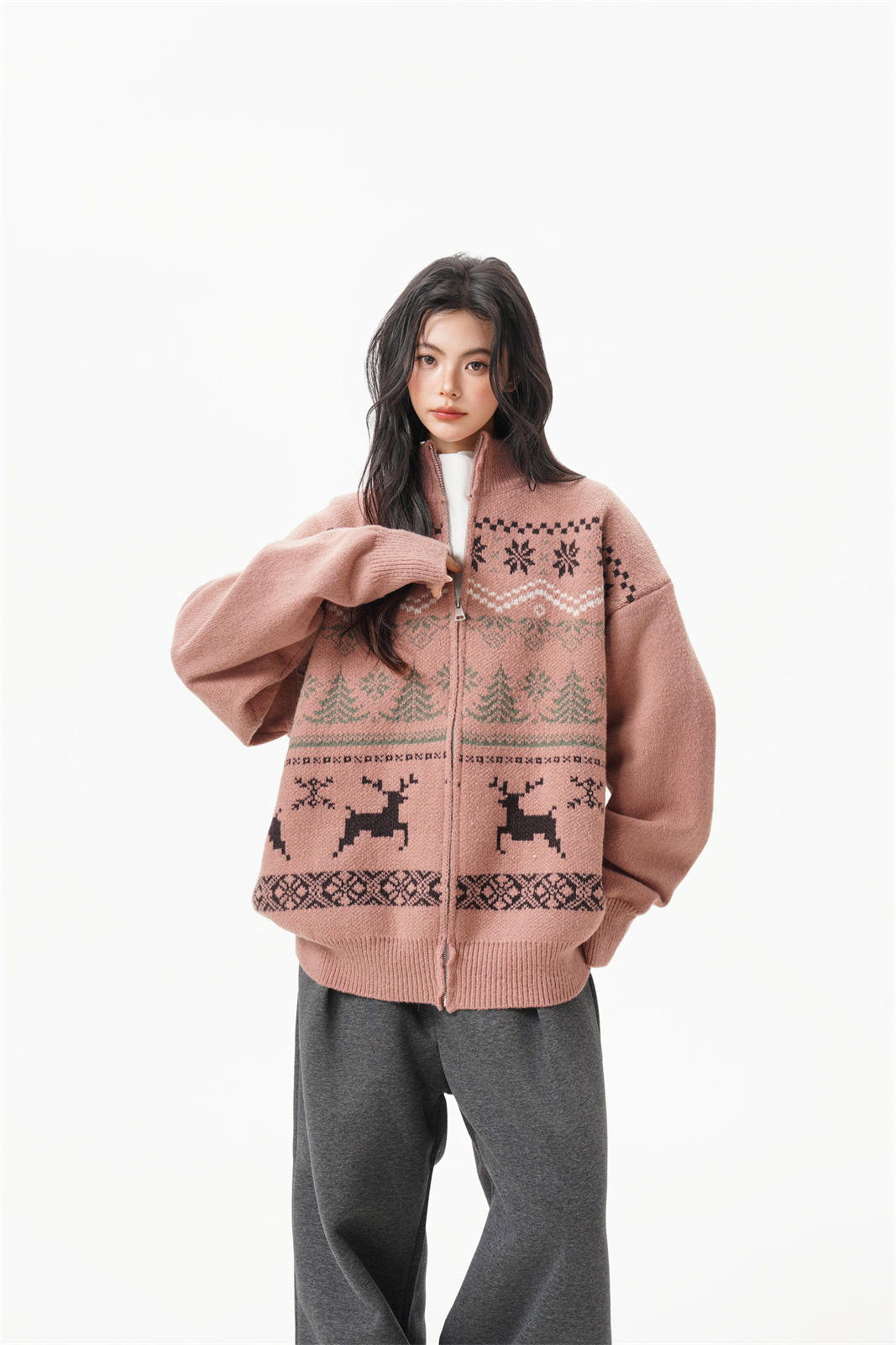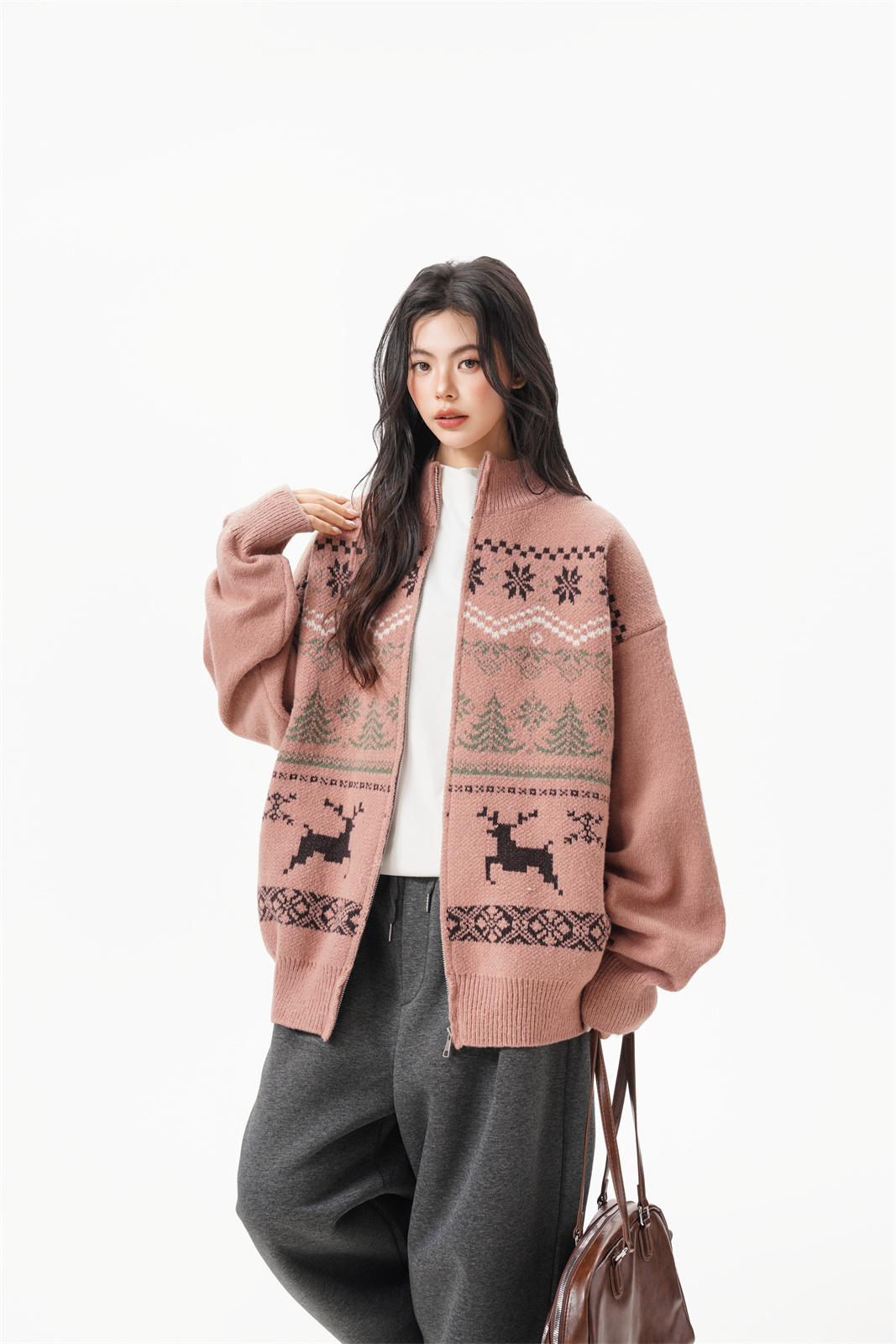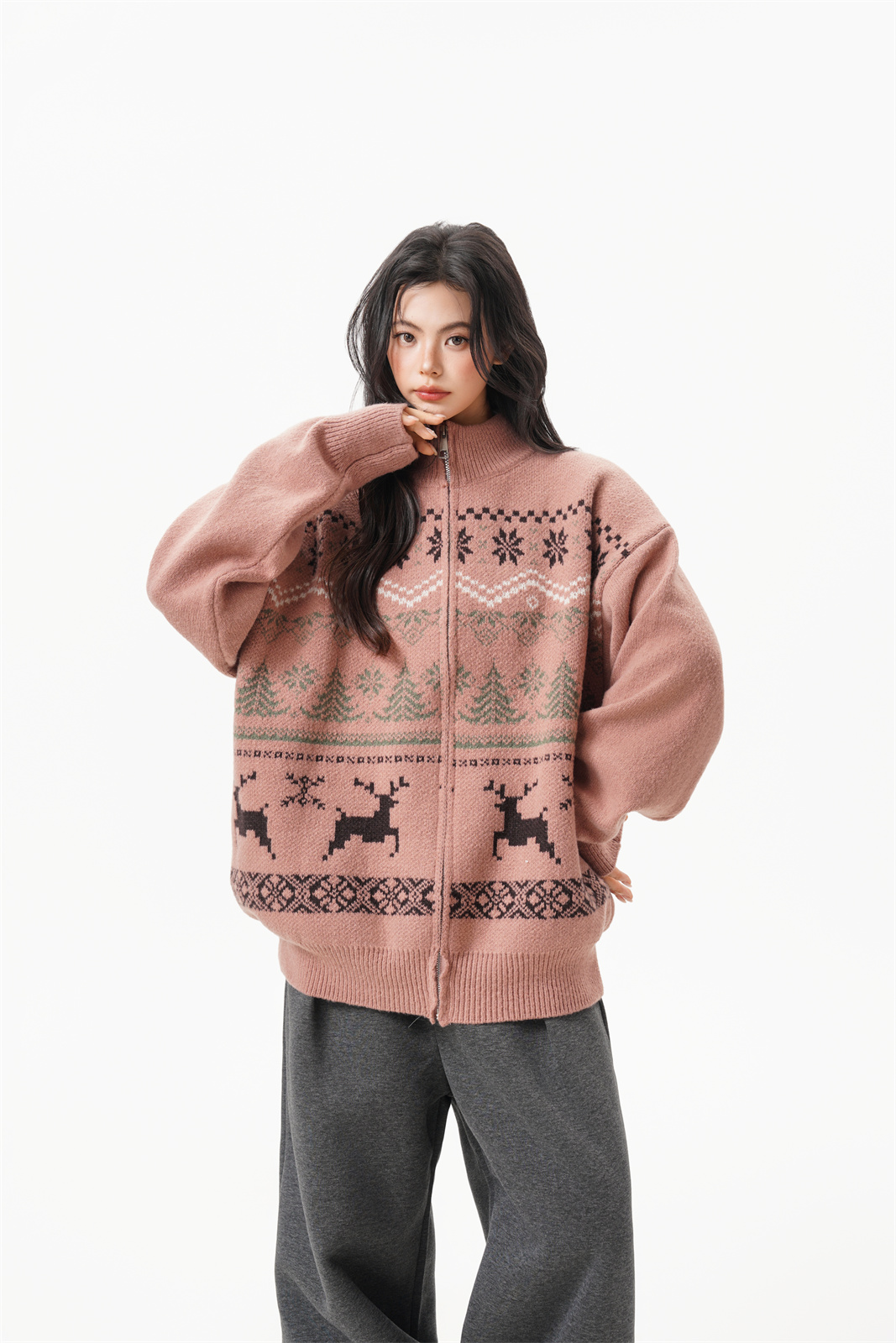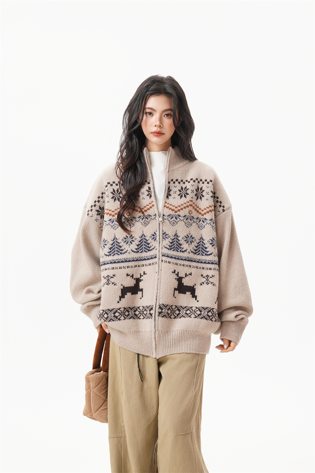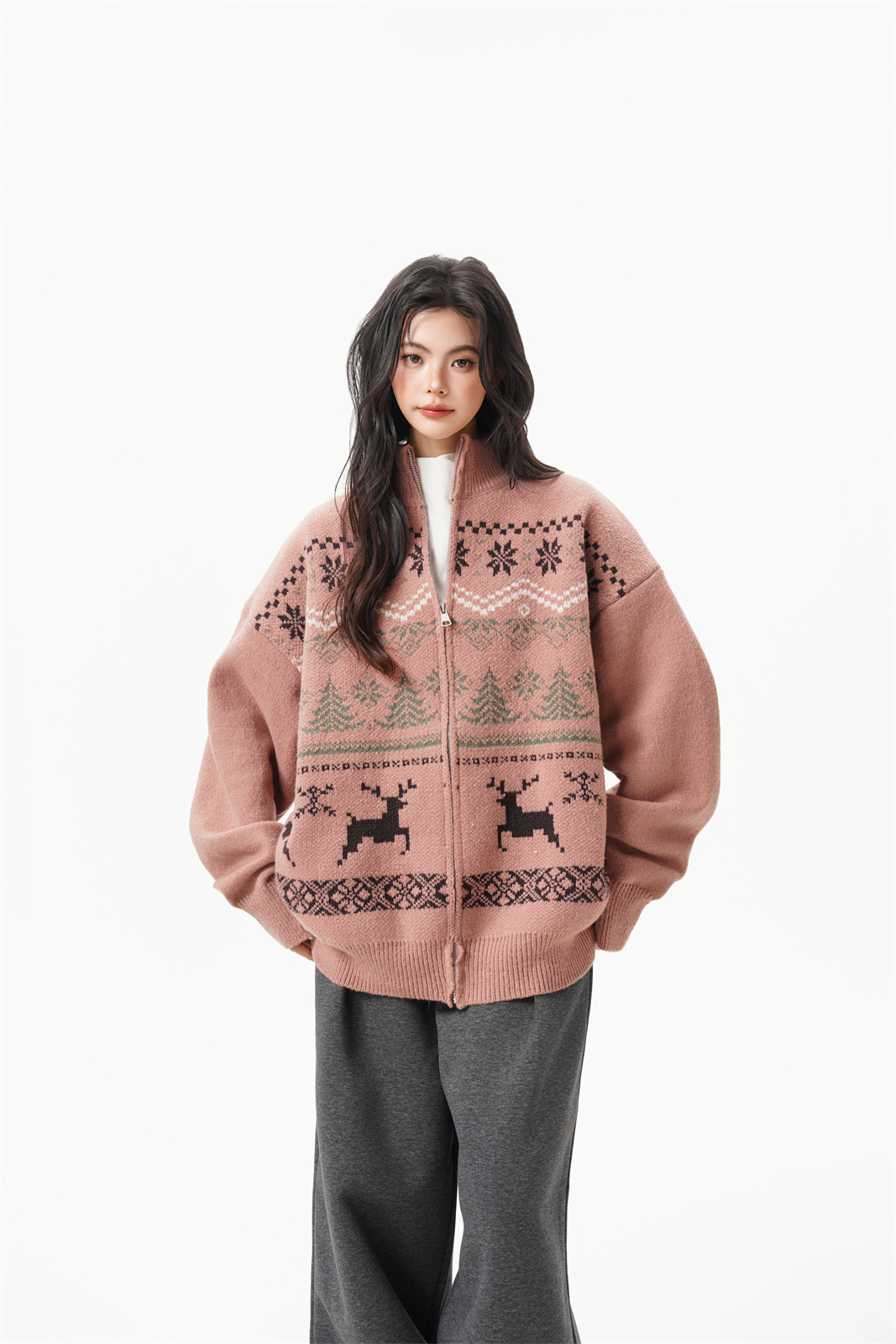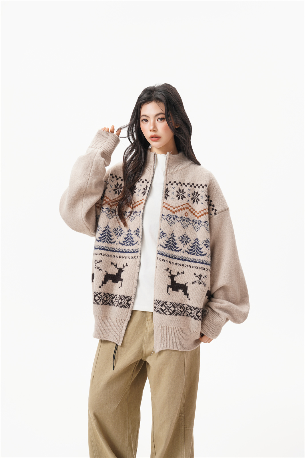 費爾島提花開衫毛衣女男秋冬季復古撞色拉鍊針織衫松弛感休閒外套