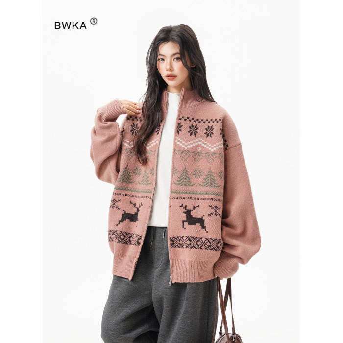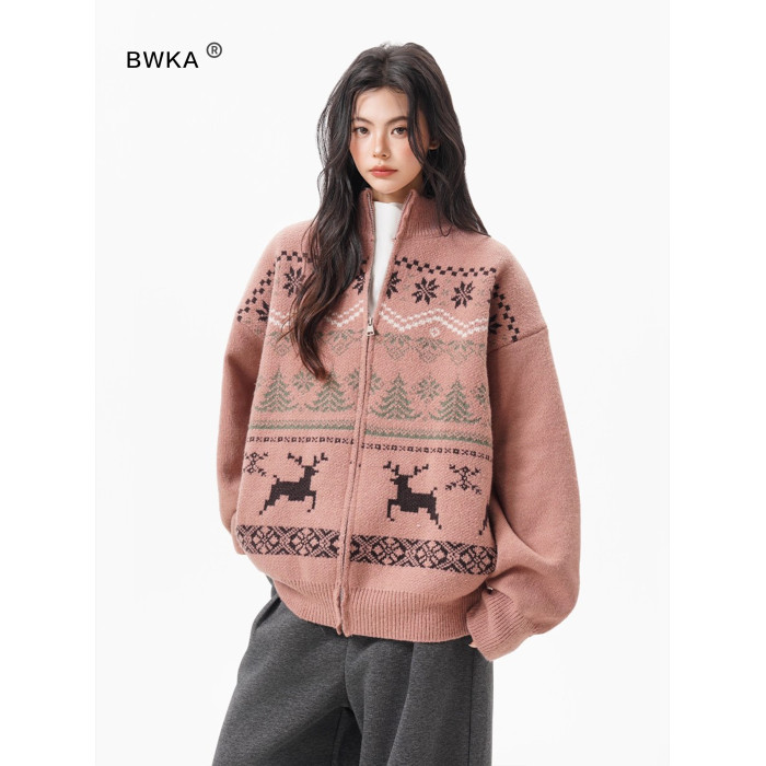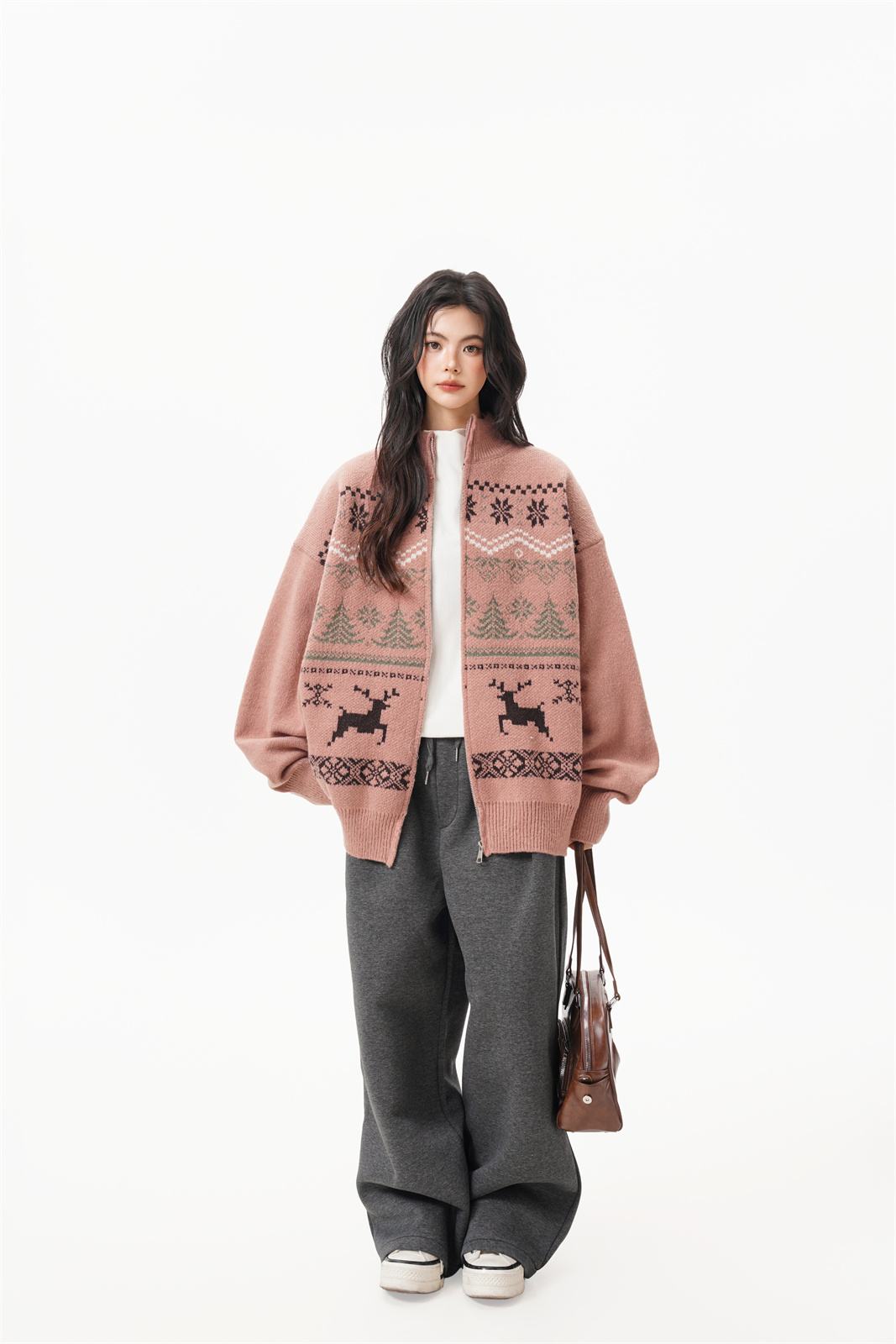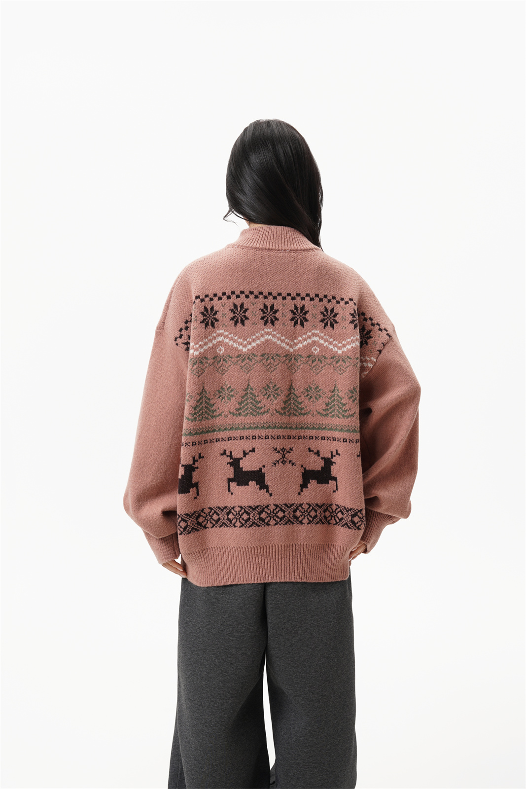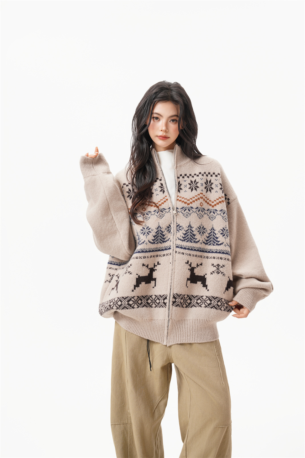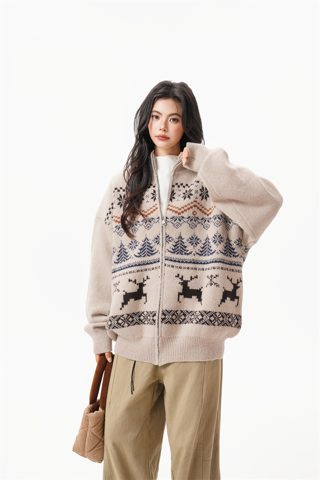 費爾島提花開衫毛衣女男秋冬季復古撞色拉鍊針織衫松弛感休閒外套