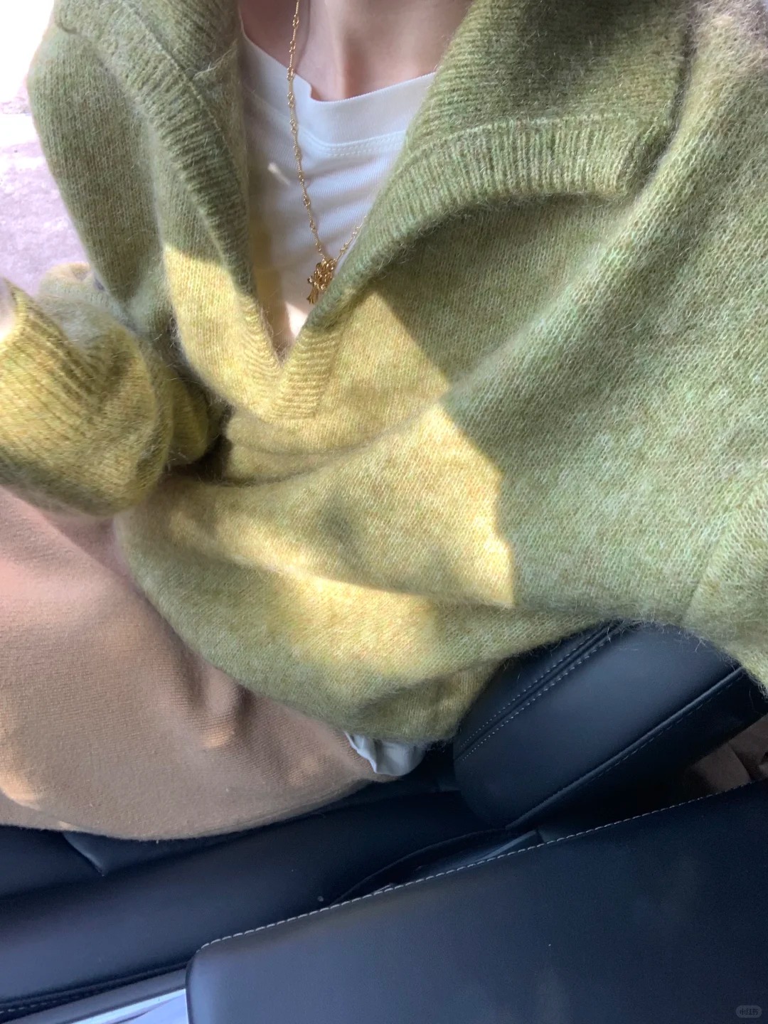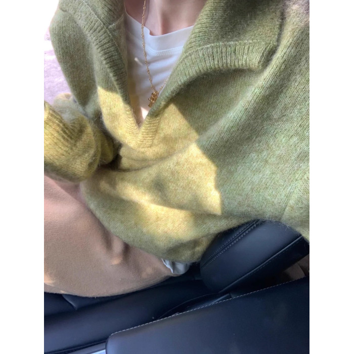 歐貨老錢風綠色v領馬海毛毛衣女秋冬慵懶高級感加厚翻領針織上衣