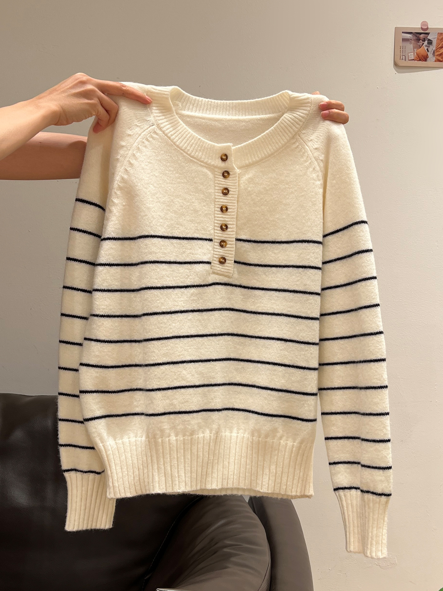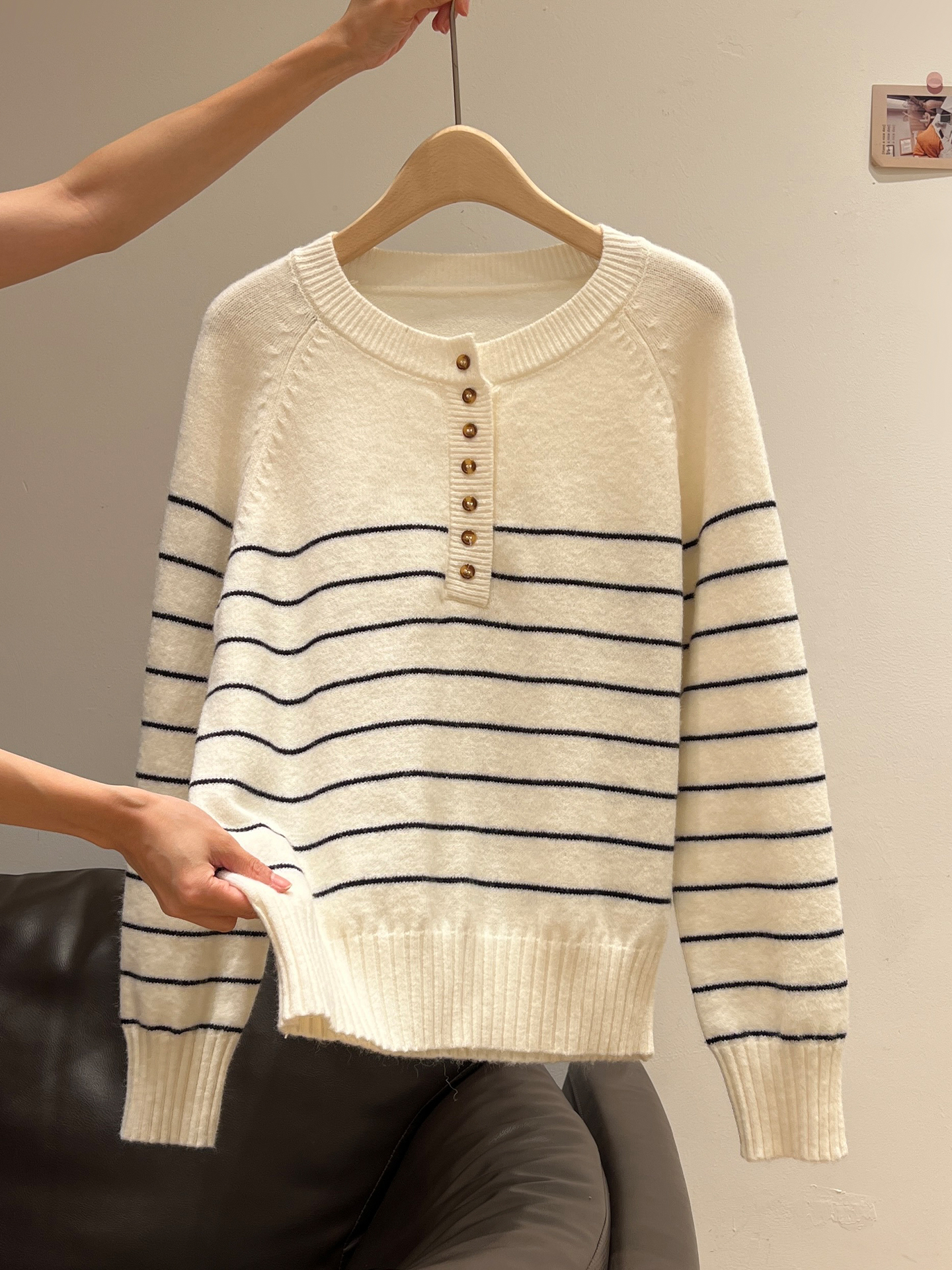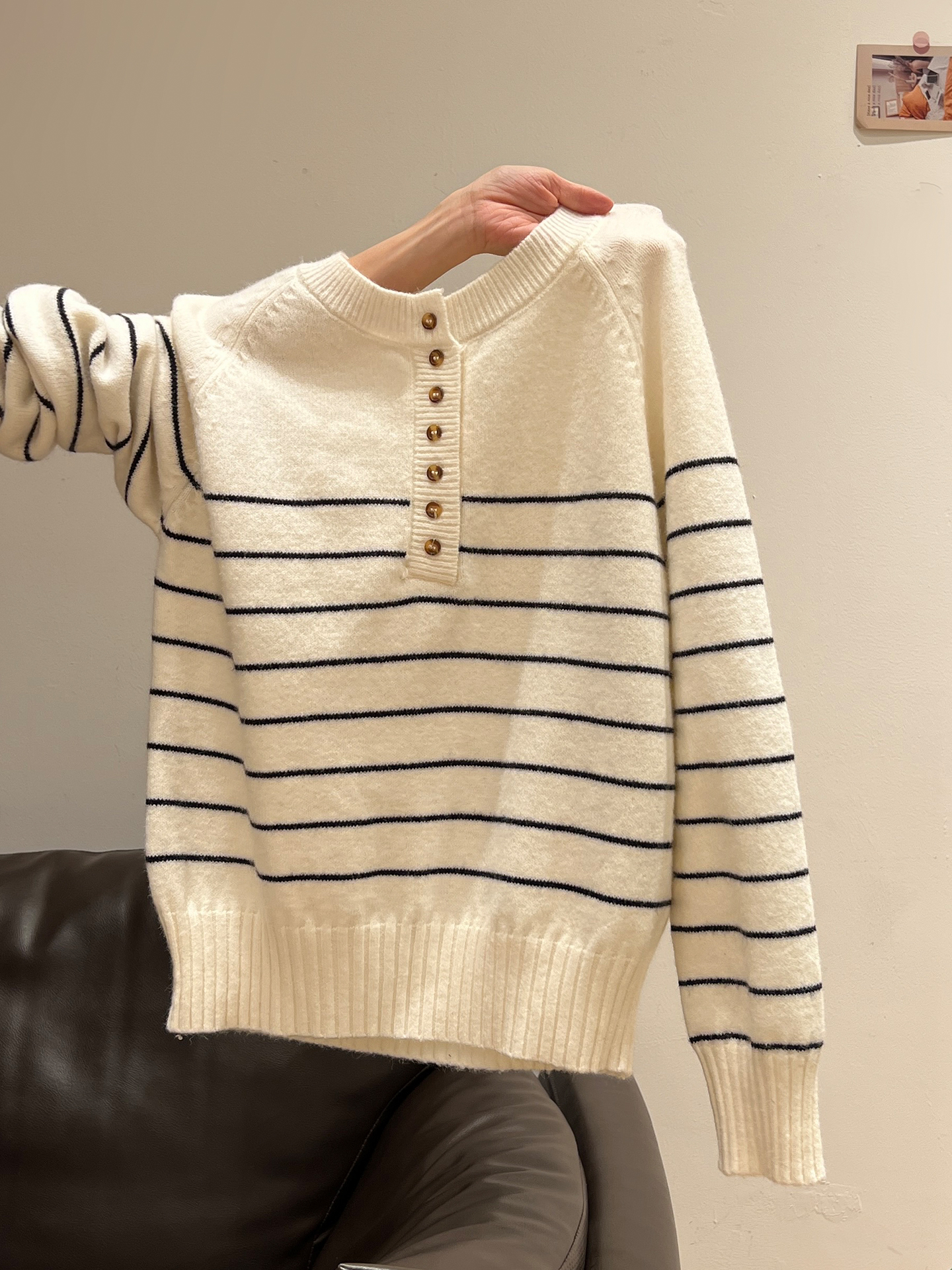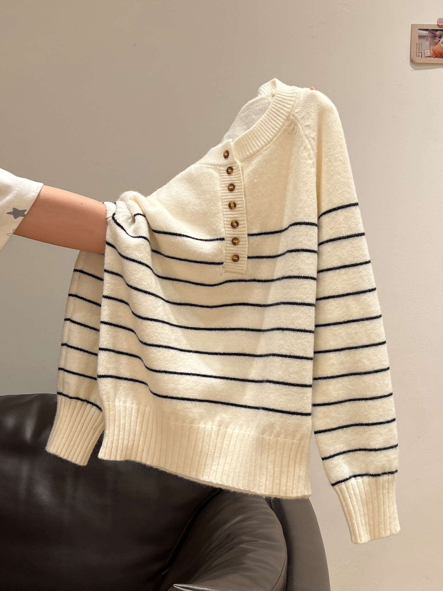 條紋半開領針織衫加厚套頭毛衣外套2025秋冬季寬松設計感長袖上衣