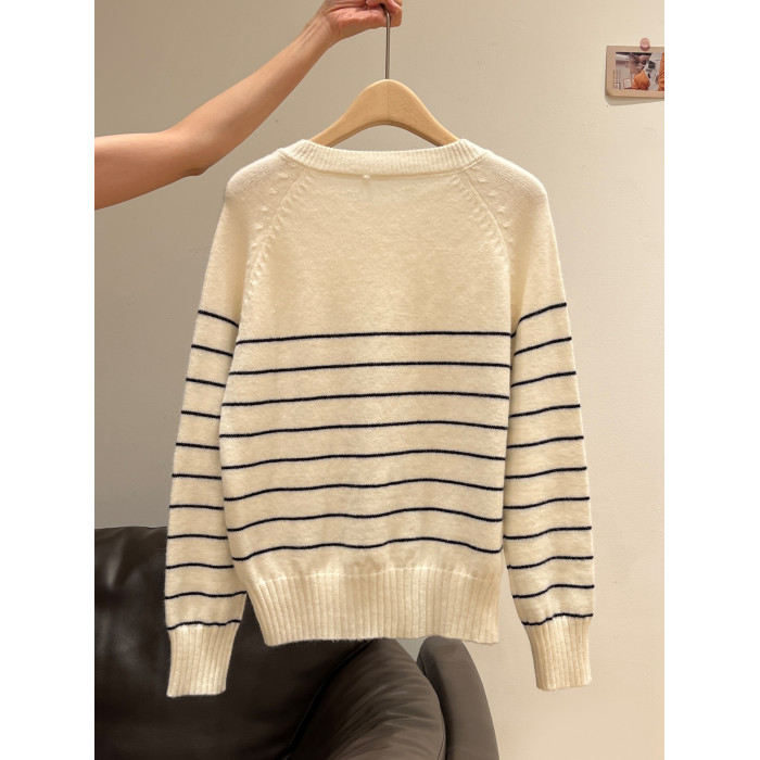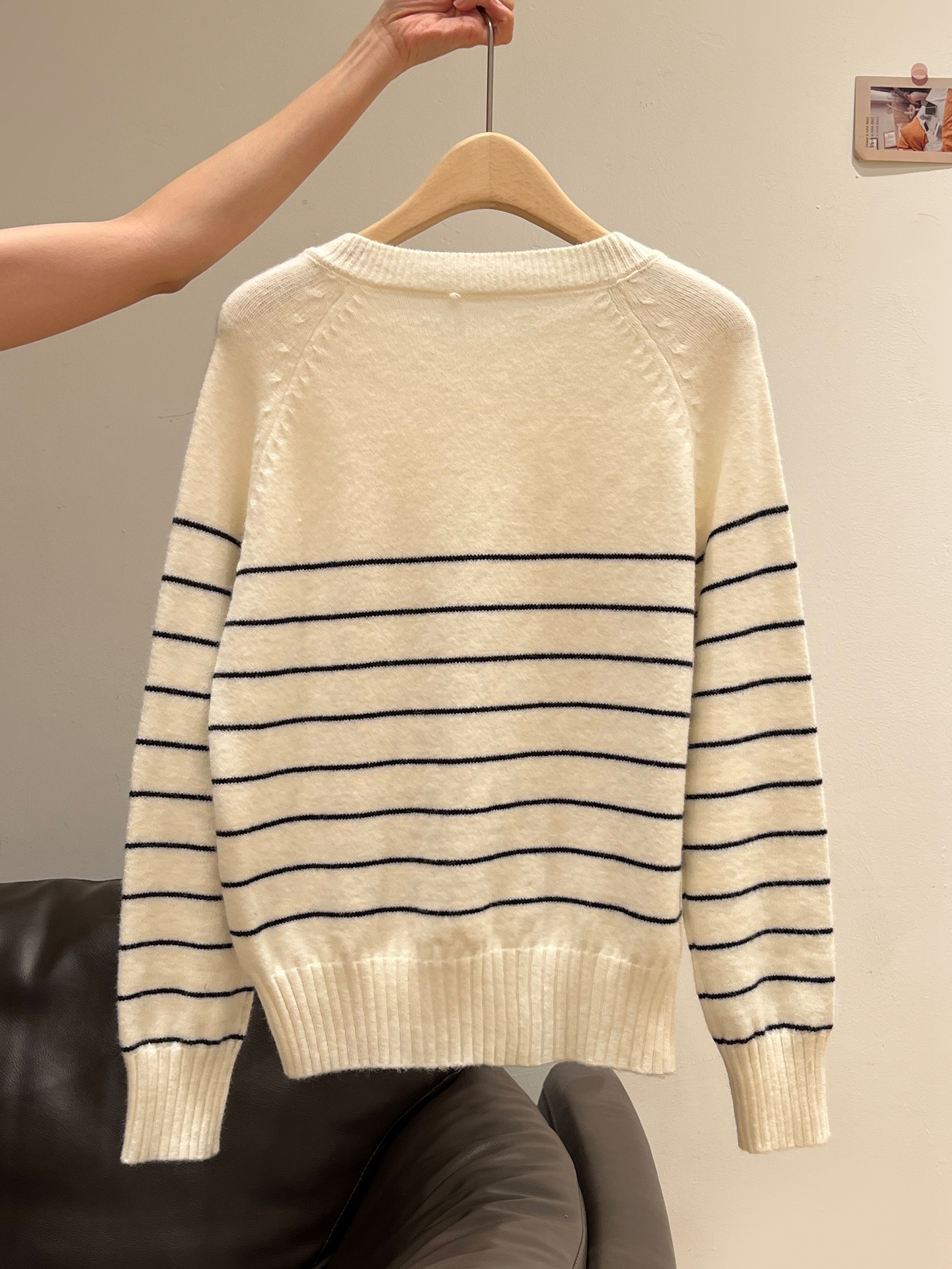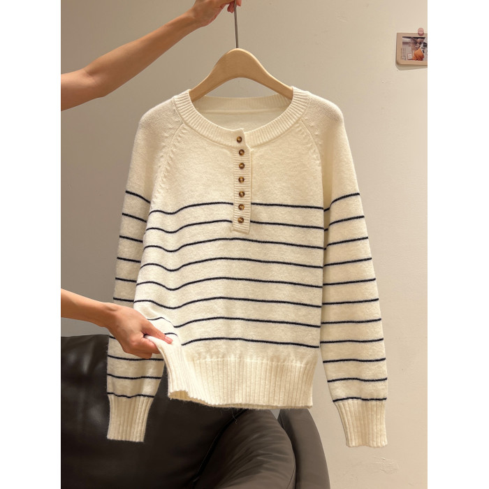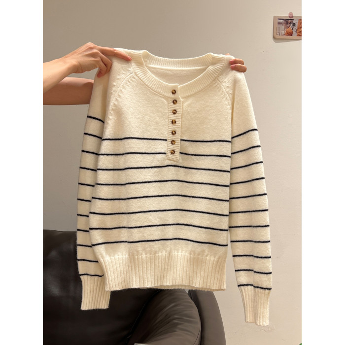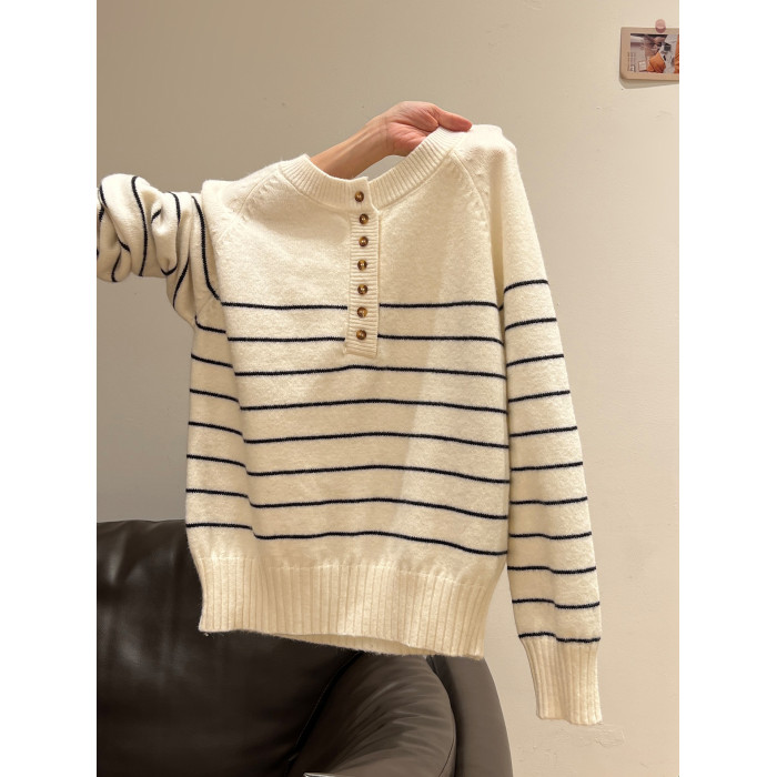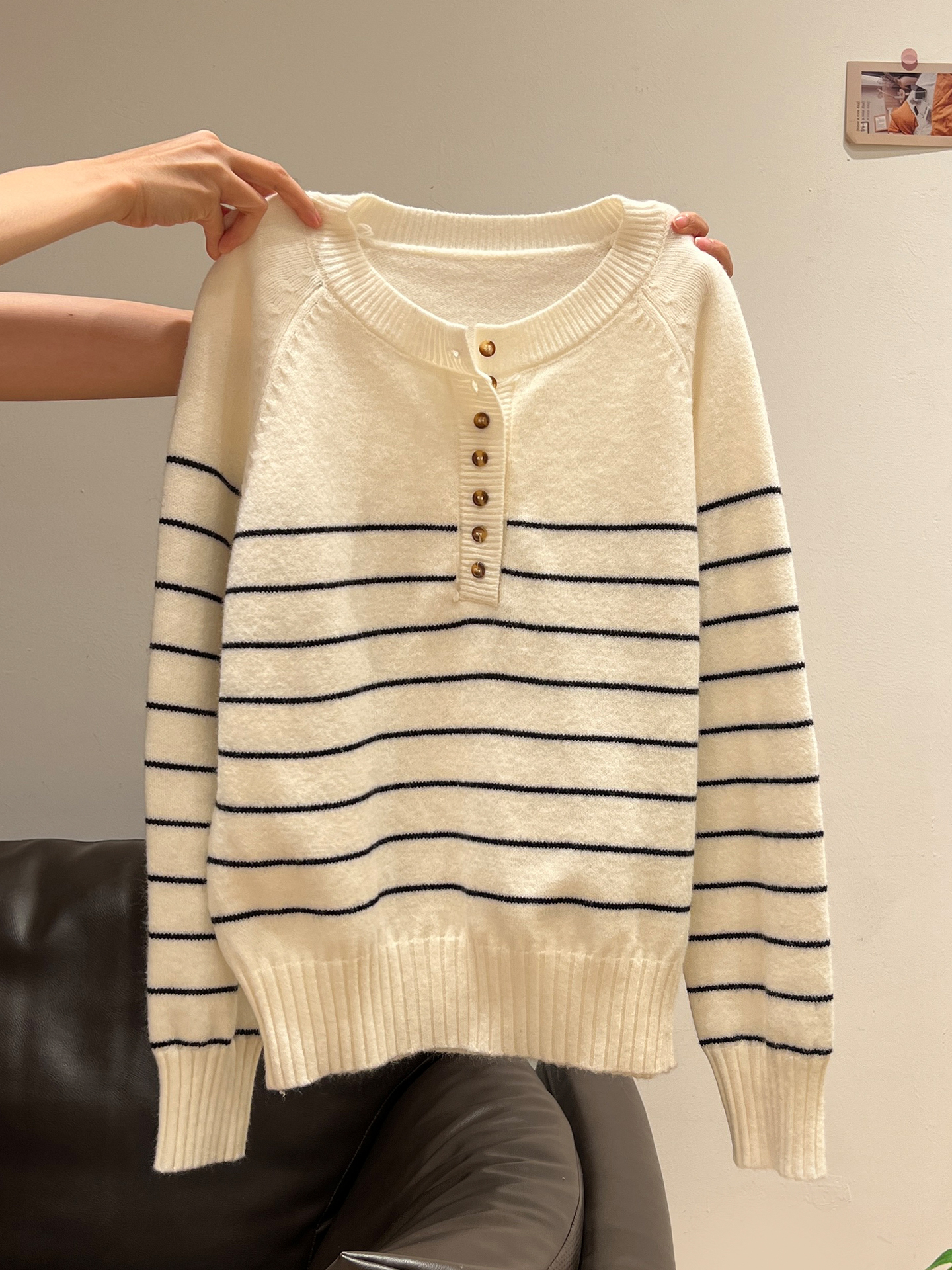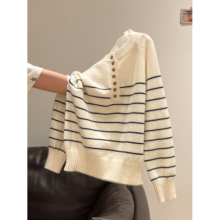 條紋半開領針織衫加厚套頭毛衣外套2025秋冬季寬松設計感長袖上衣