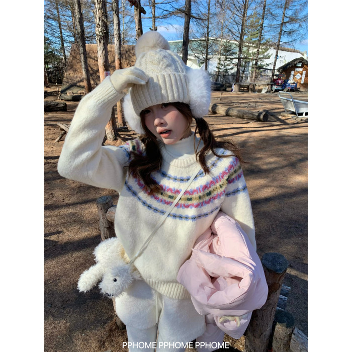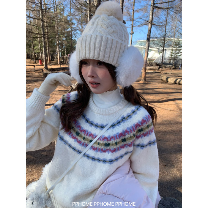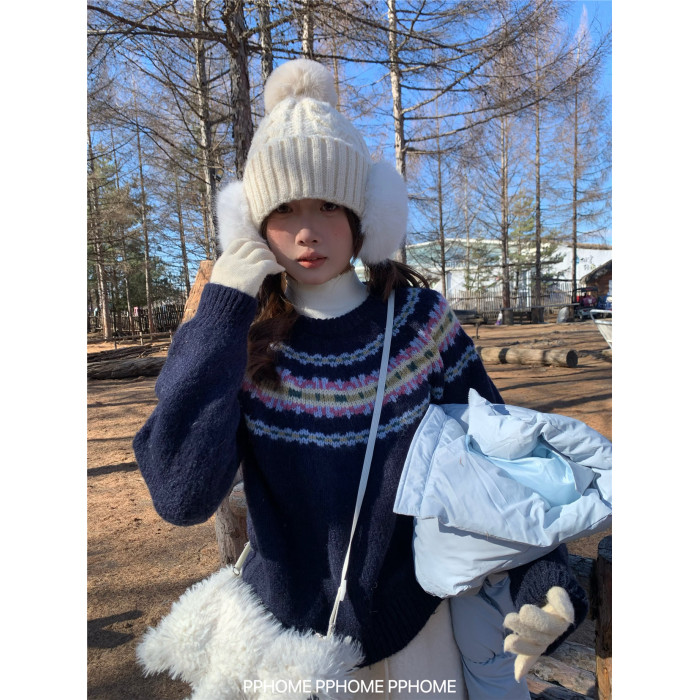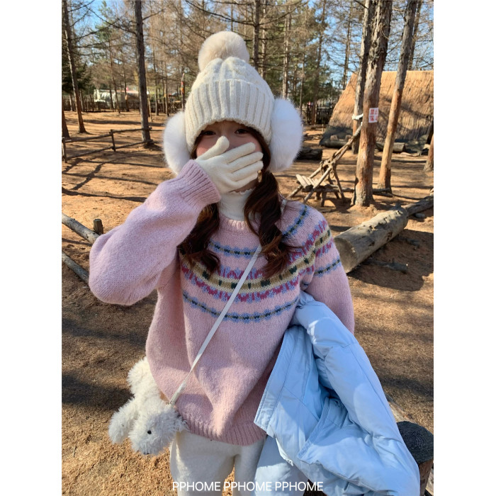 PPHOME自製~超美配色 復古費爾島撞色提花針織衫毛衣軟糯長袖上衣