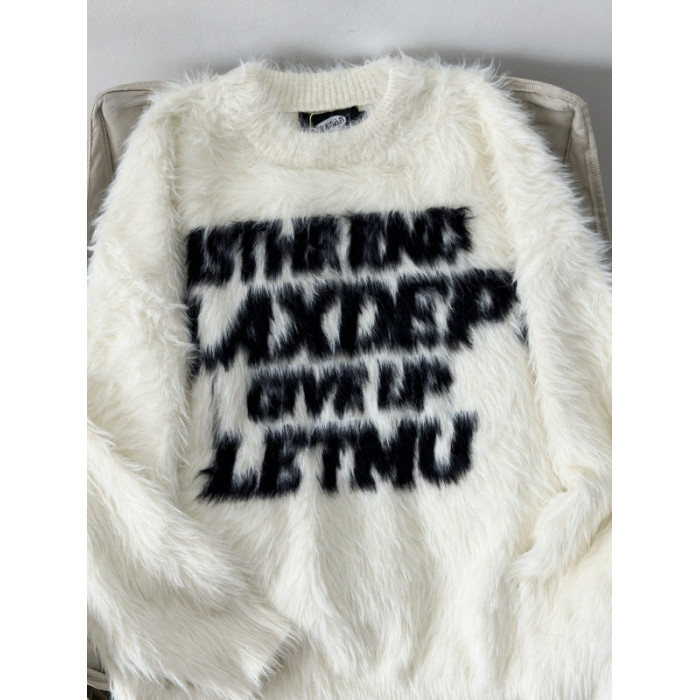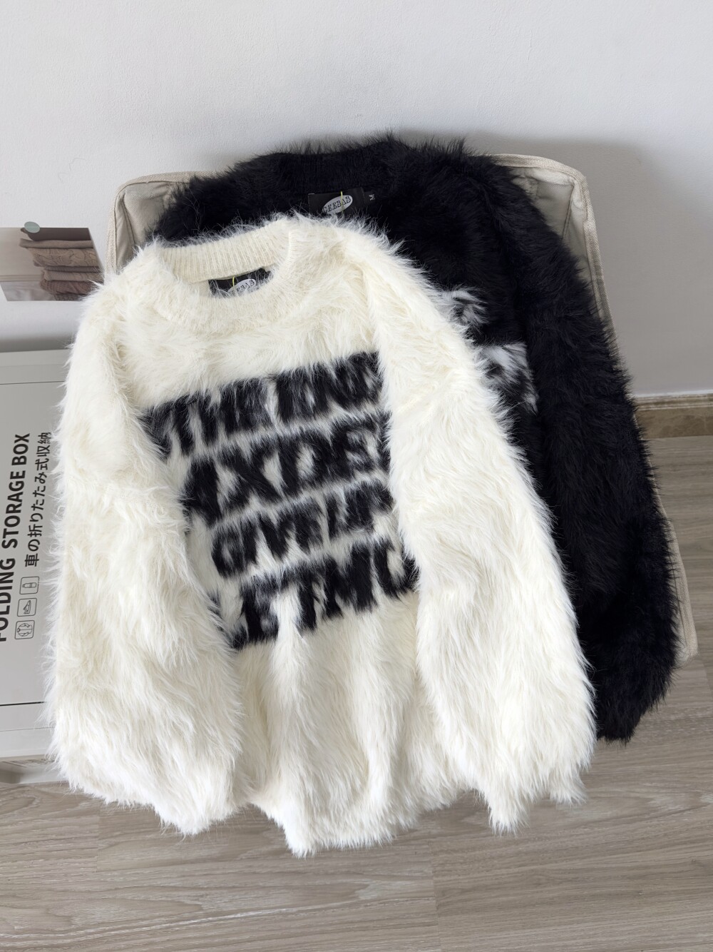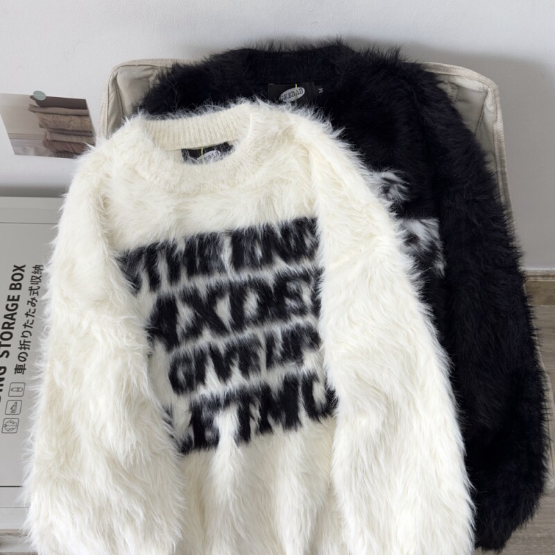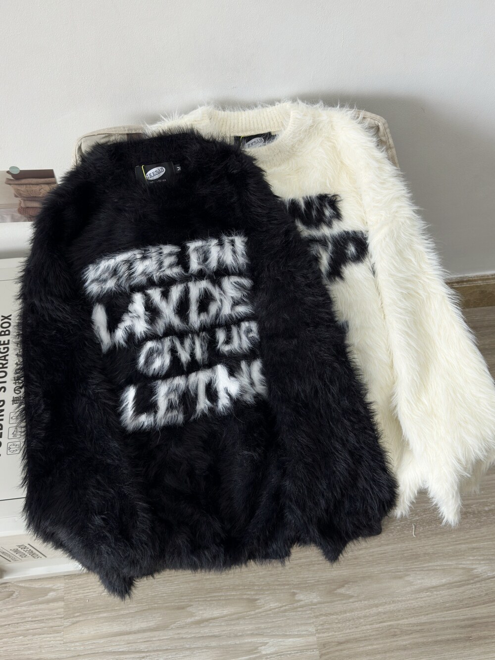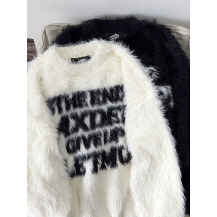 美式高街情侶毛絨軟糯毛衣男女秋冬仿貂毛慵懶寬松字母針織衫外穿