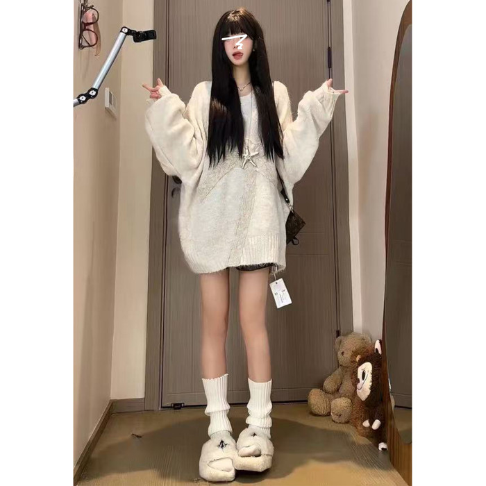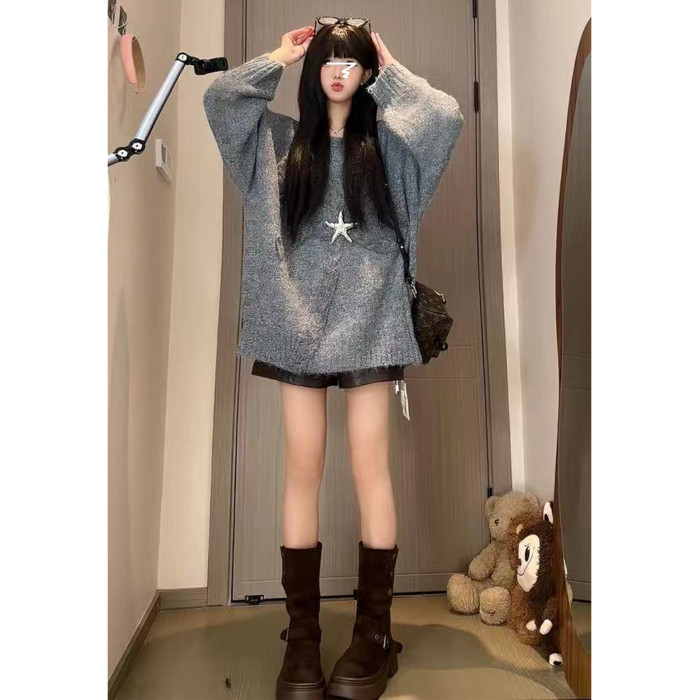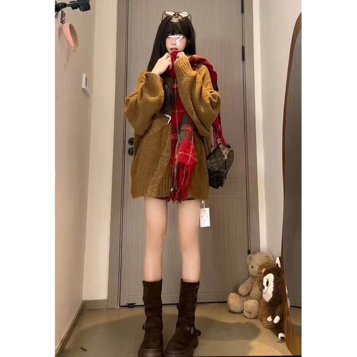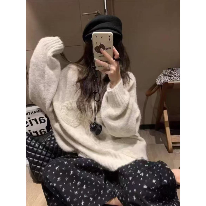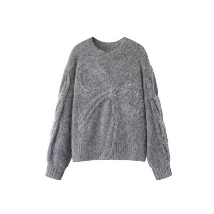蝴蝶結麻花毛衣女針織衫秋冬中長款寬松慵懶風圓領套頭加厚上衣