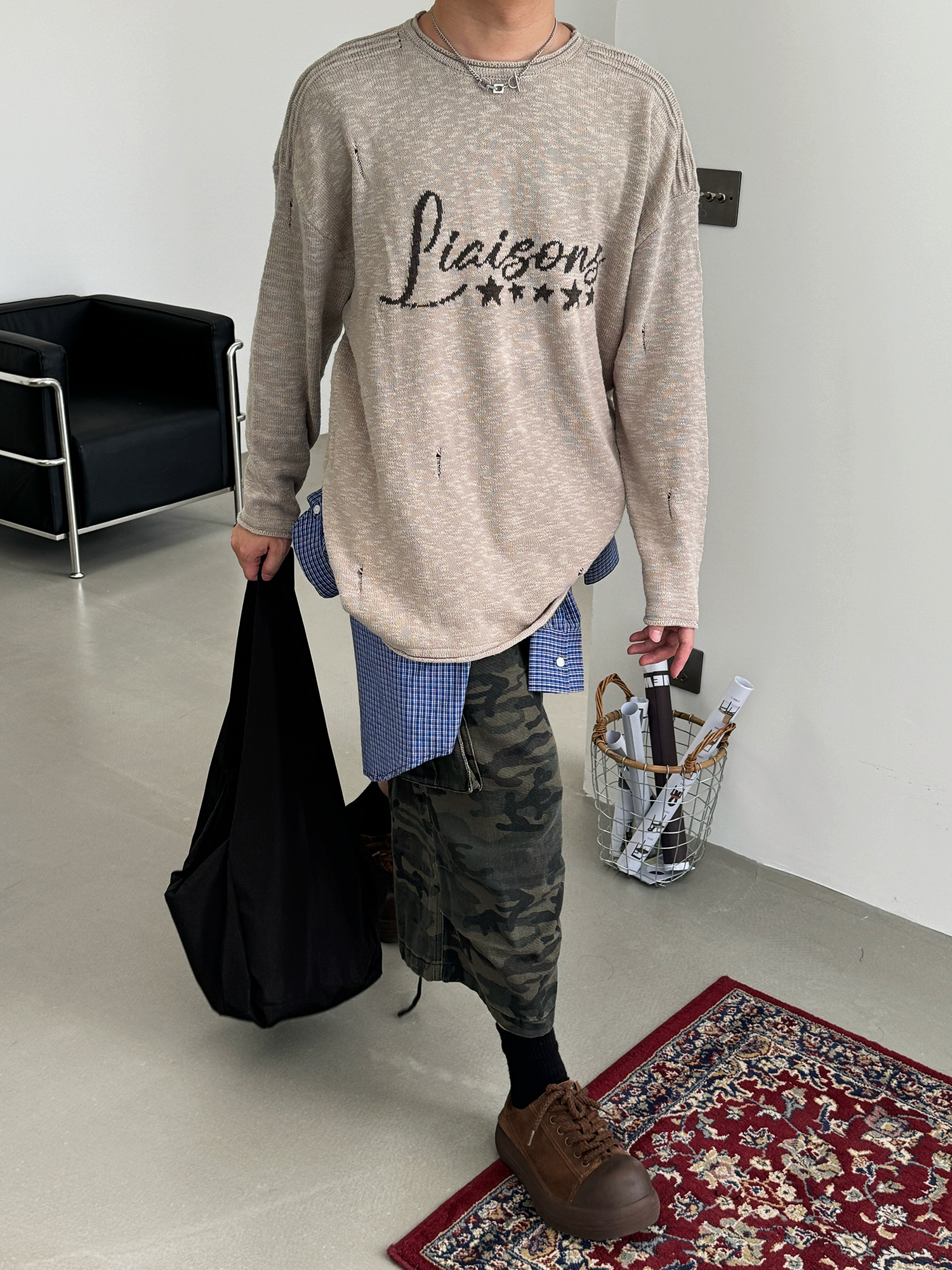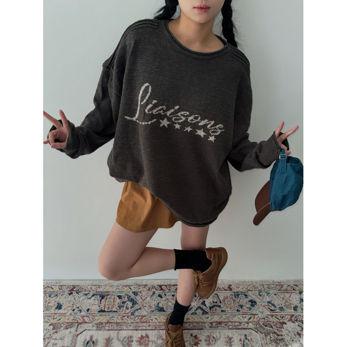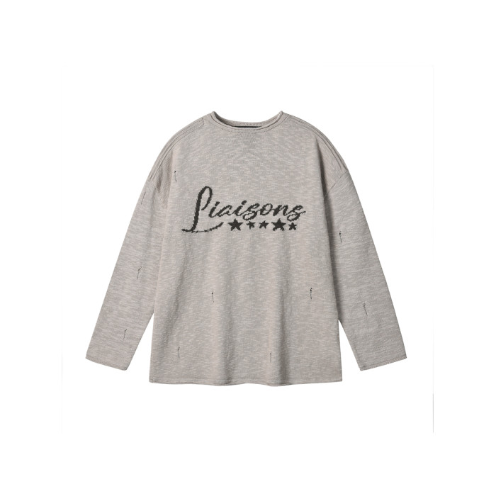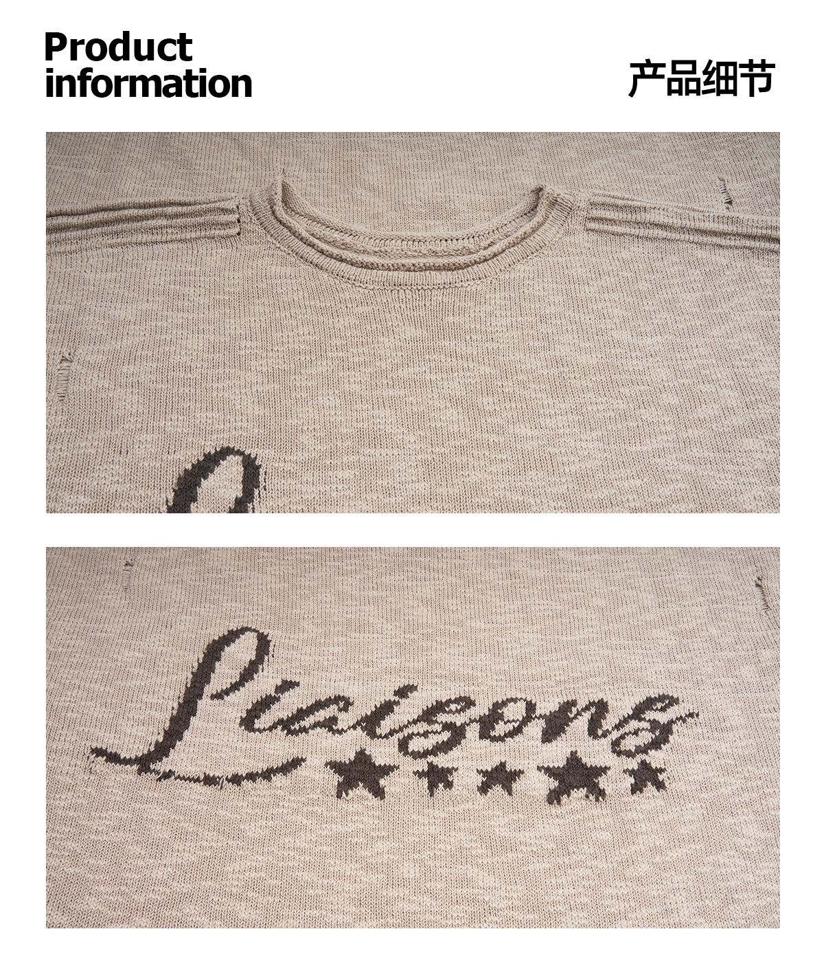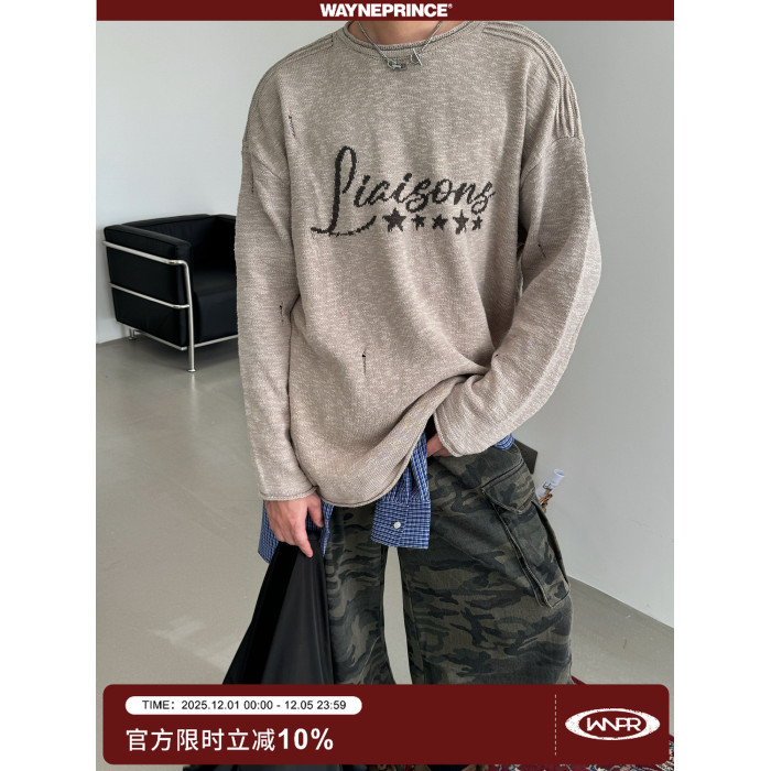 19studio WAYNEPRINCE 美式復古圓領針織衫寬松字母印花破洞毛衣