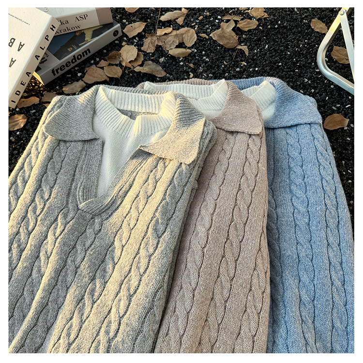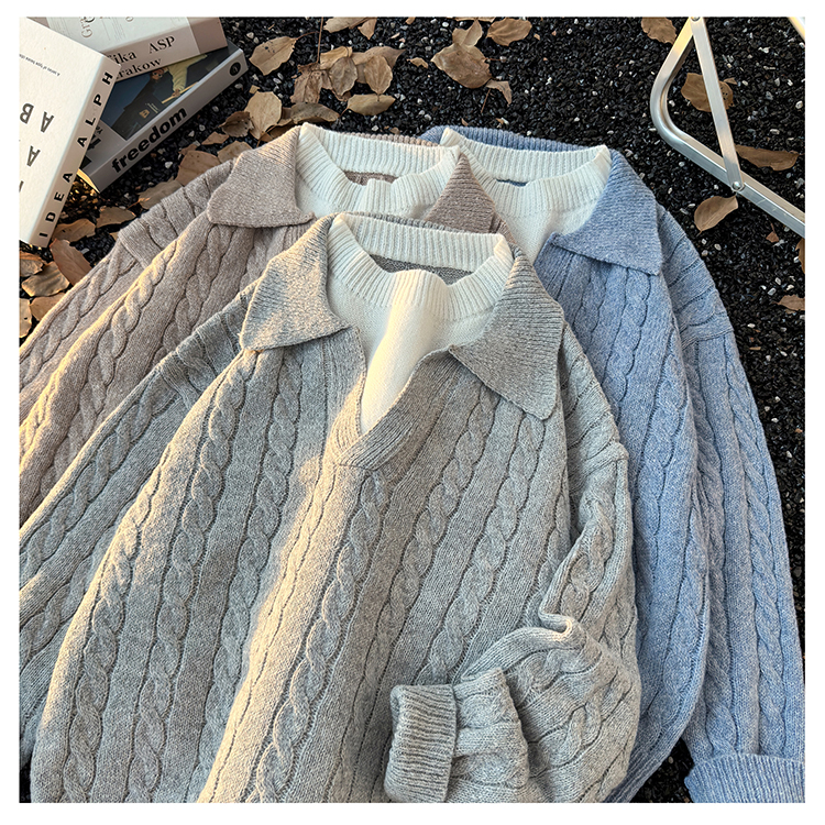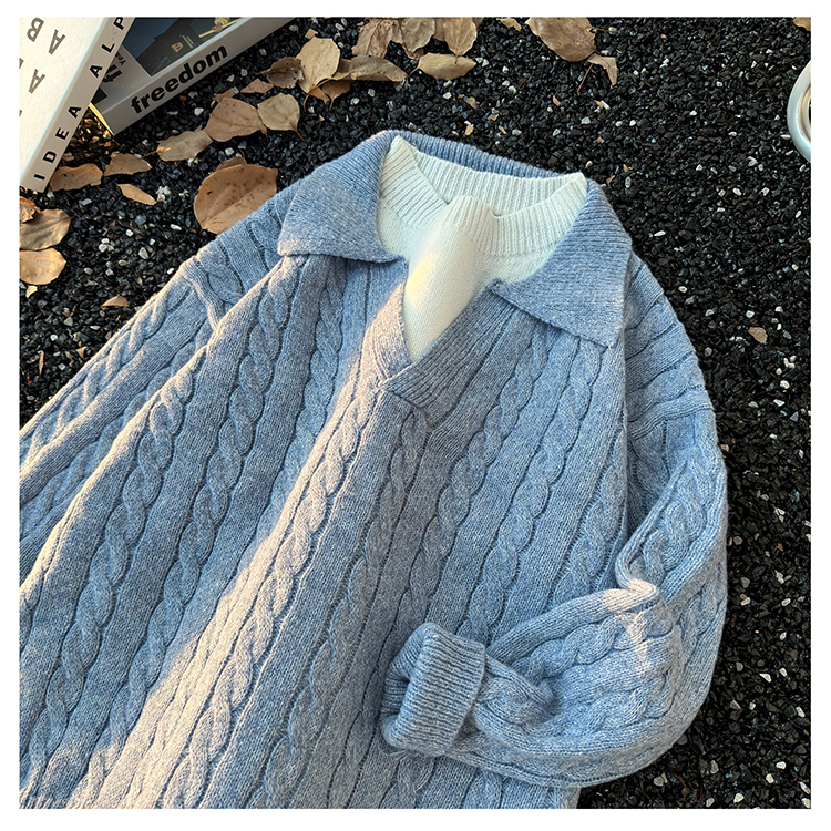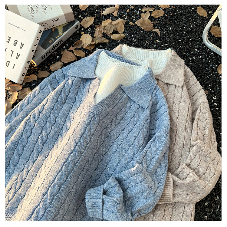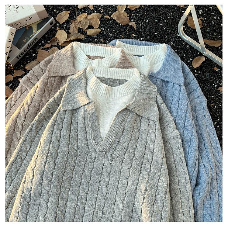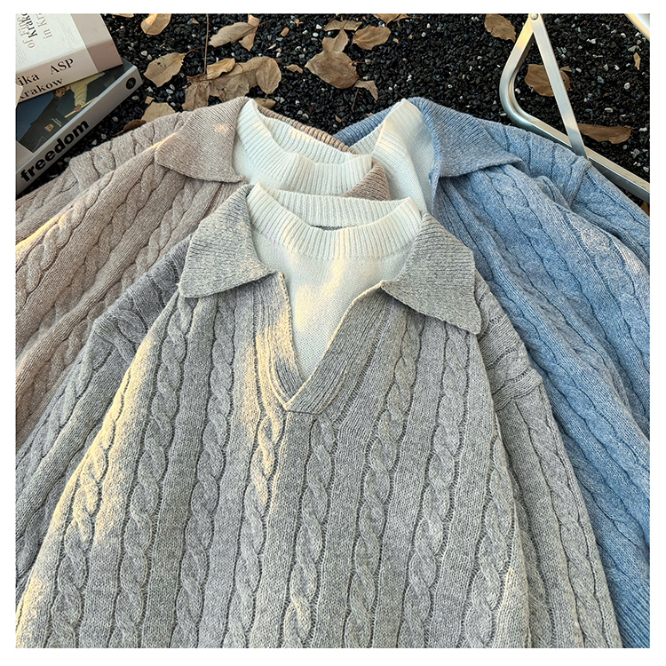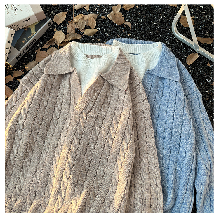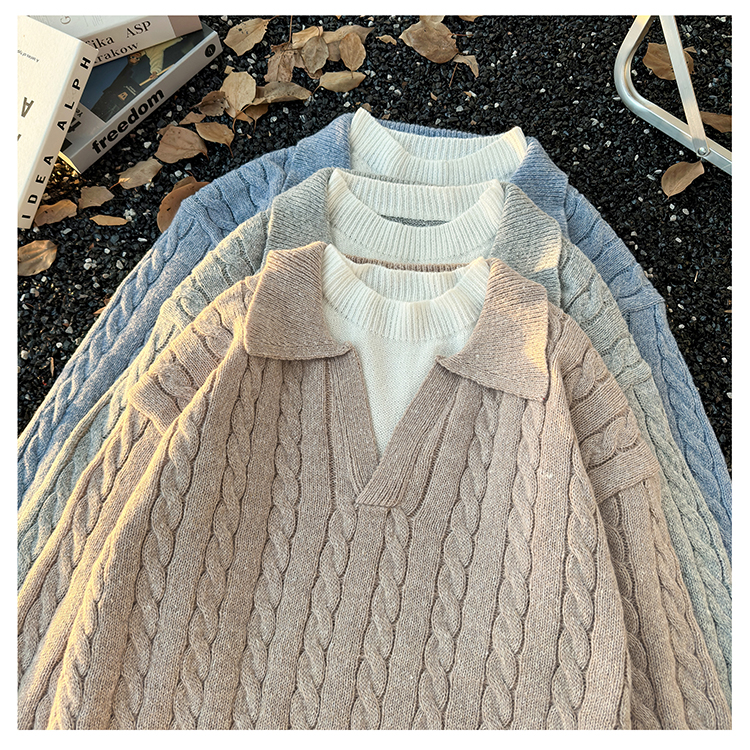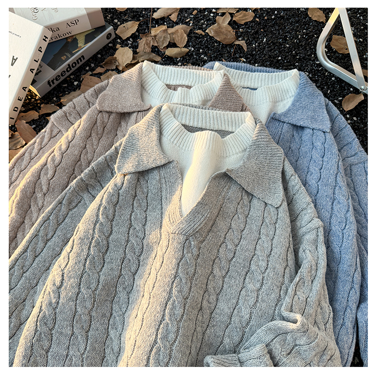 假兩件麻花長袖毛衣男款冬季韓系穿搭翻領套頭polo衫保暖針織線衣