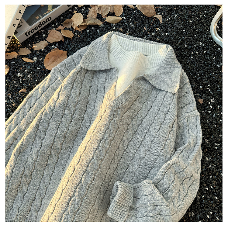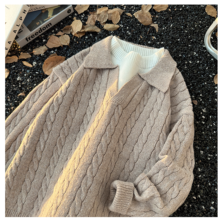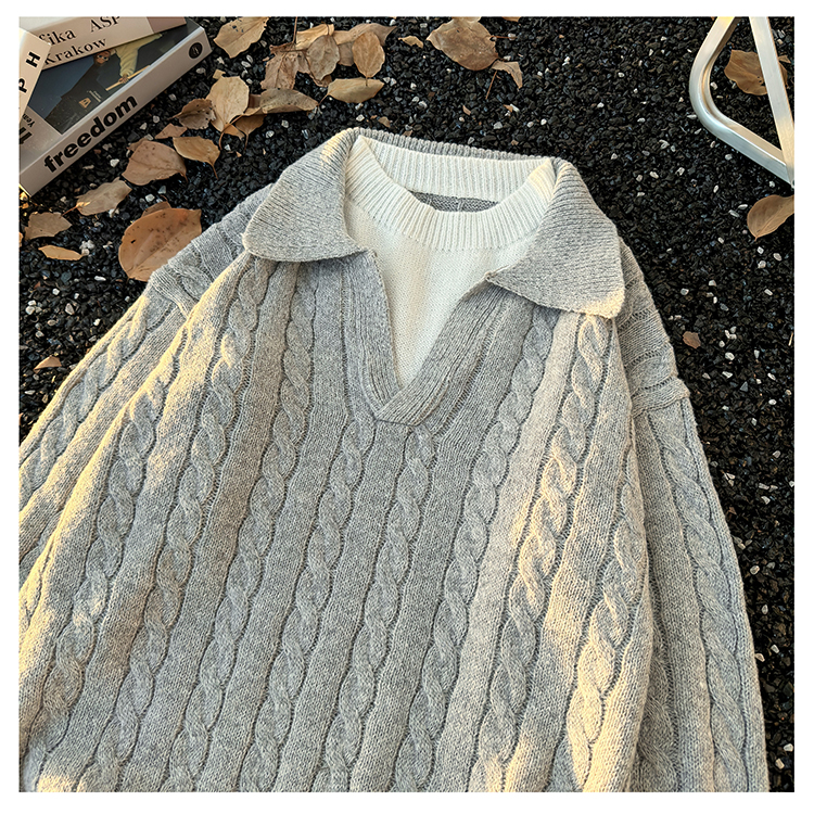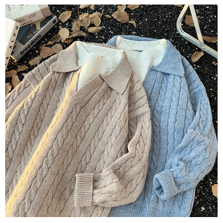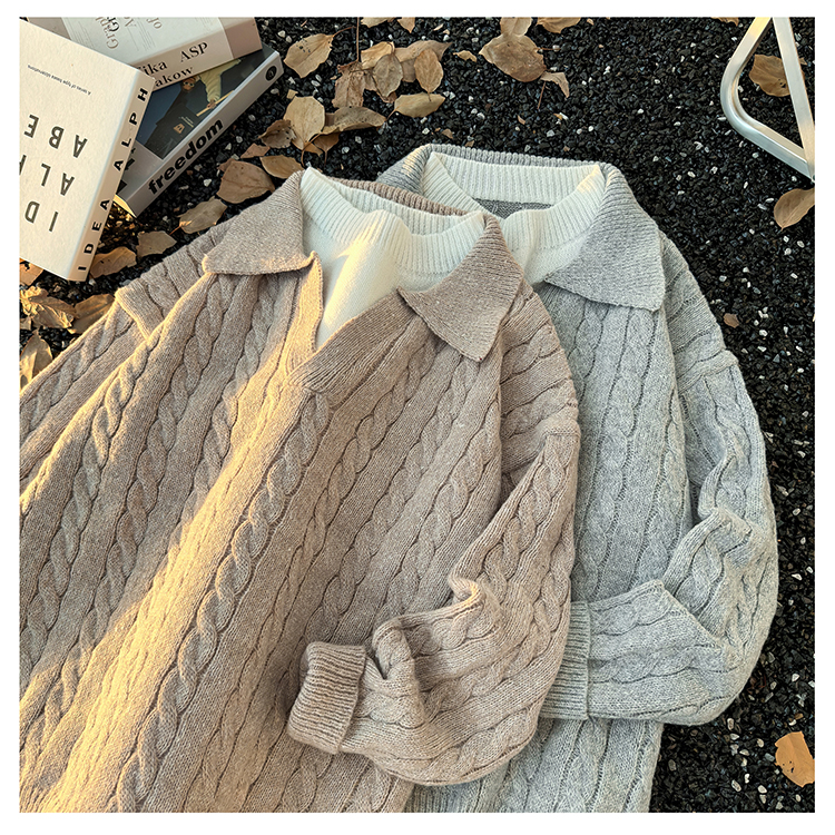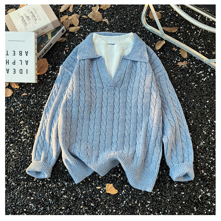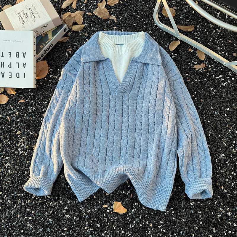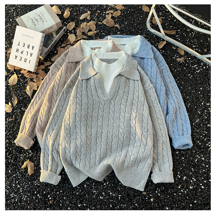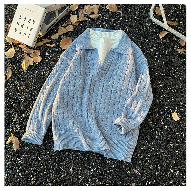 假兩件麻花長袖毛衣男款冬季韓系穿搭翻領套頭polo衫保暖針織線衣