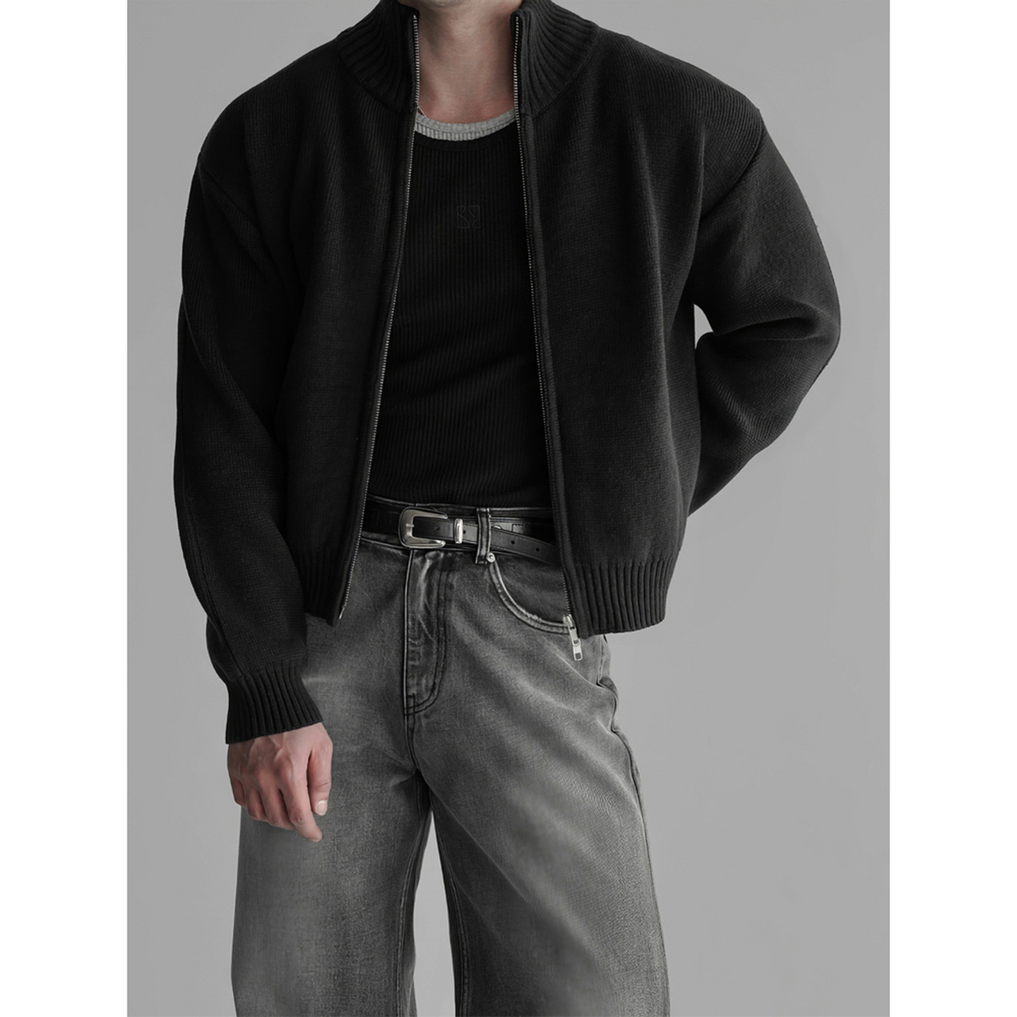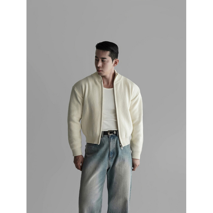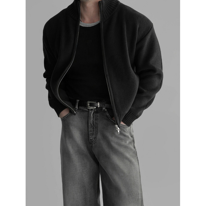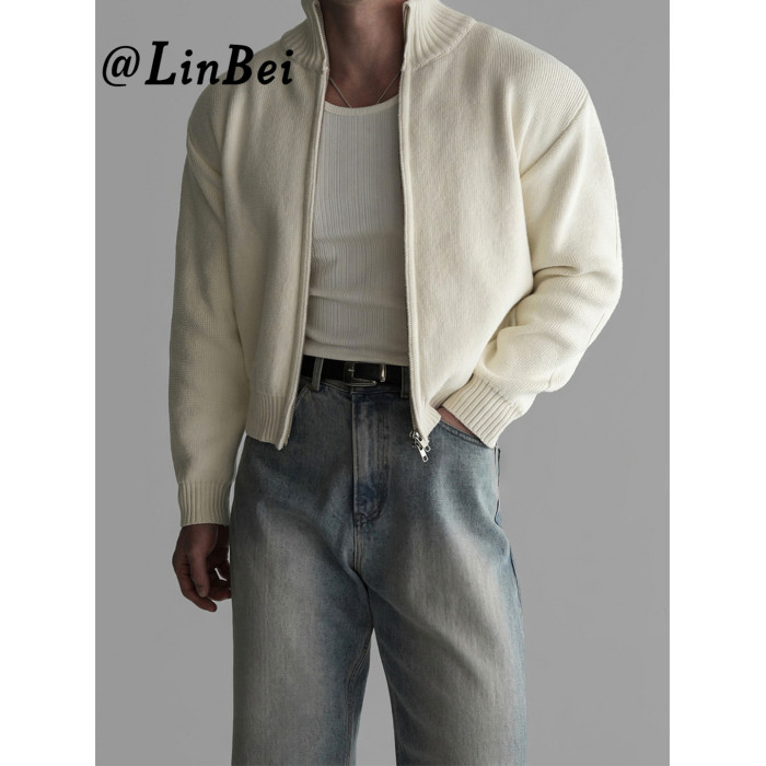 杏色短款立領拉鍊開衫毛衣男2025潮流百搭寬松休閒長袖針織衫外套