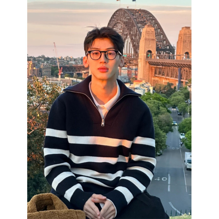黑白撞色條紋毛衣男秋冬日系復古半拉鍊立領毛線衣高級感針織外套