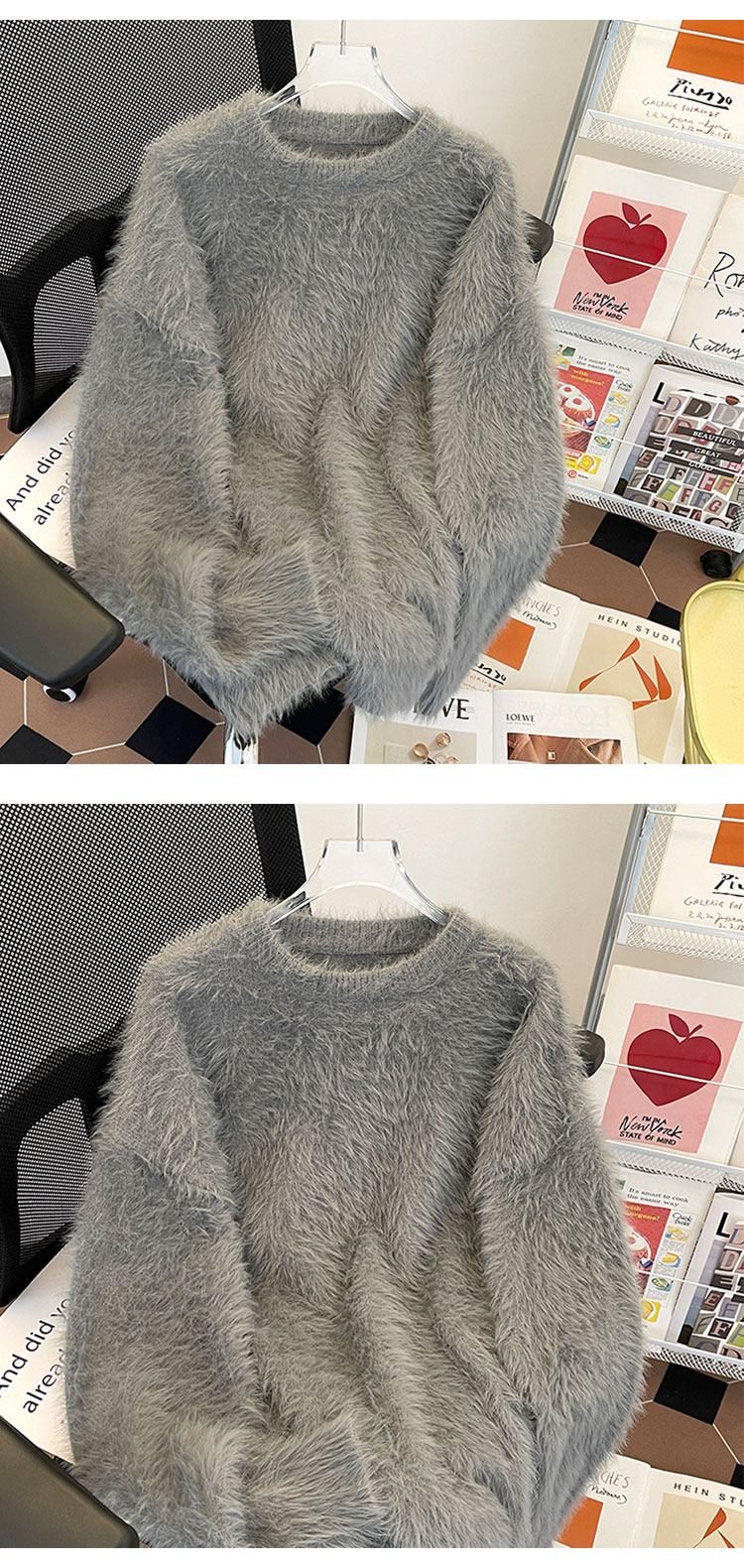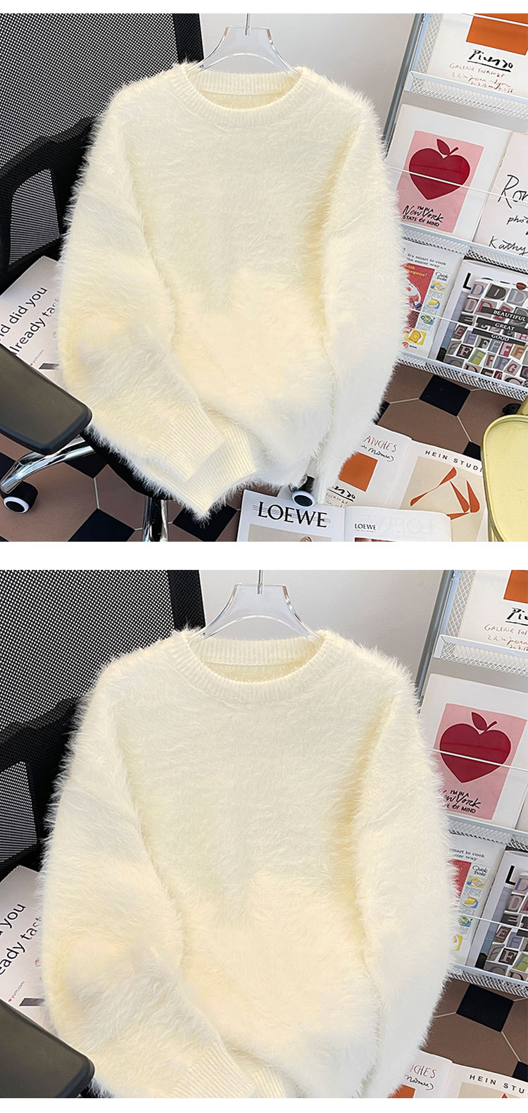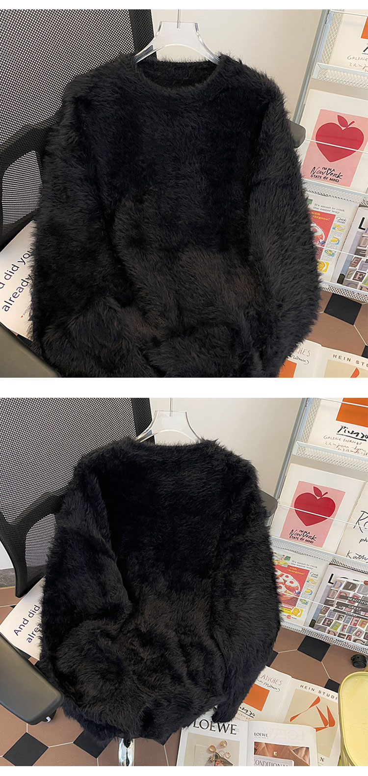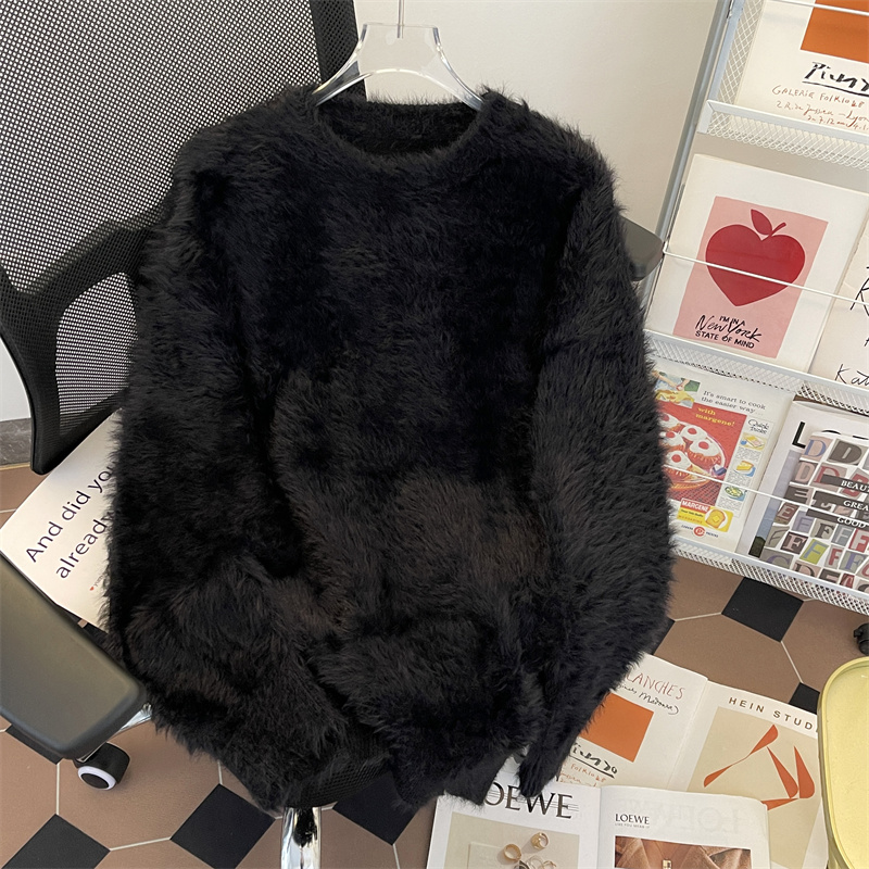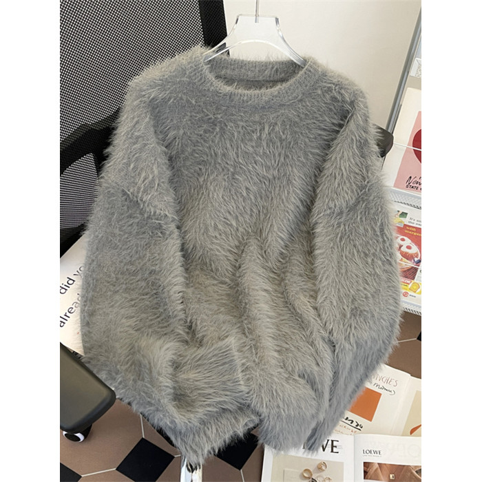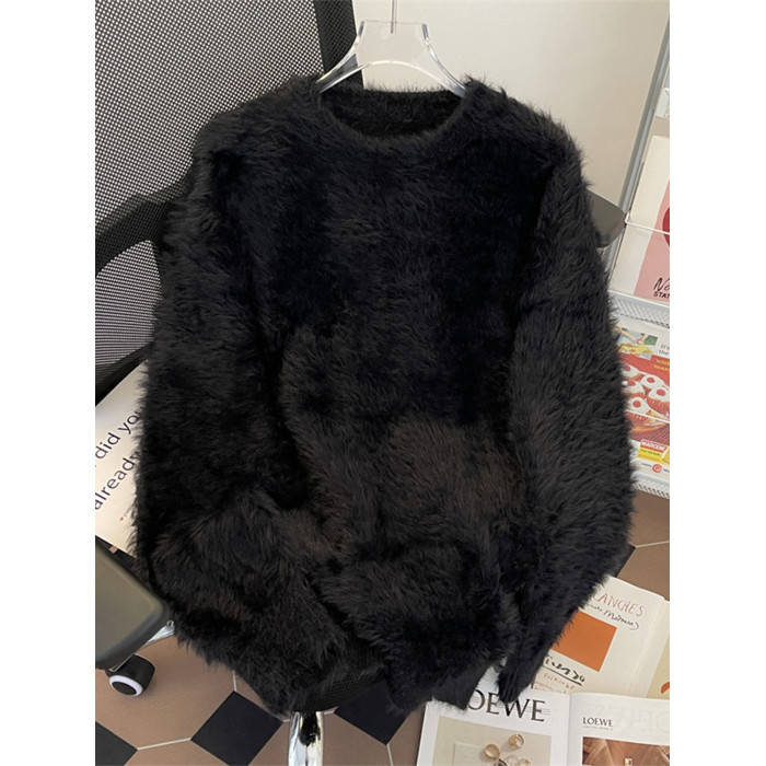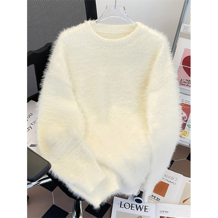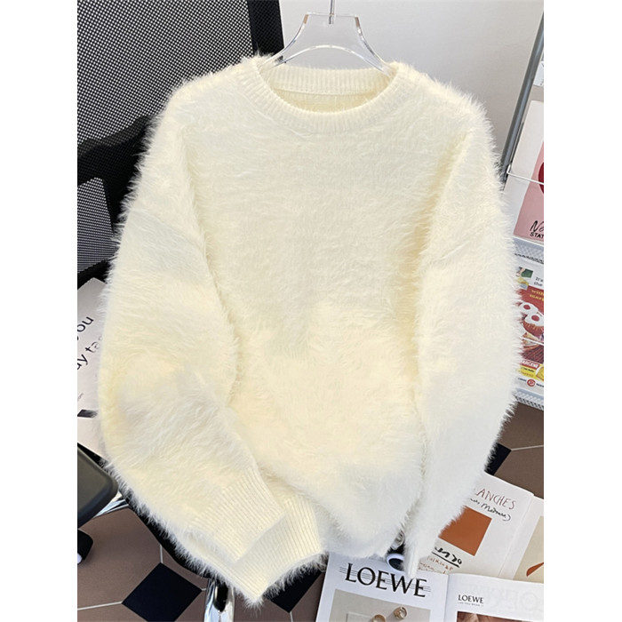 2025秋冬純色水貂絨長袖毛衣男女圓領套頭加厚保暖針織衫日系bf風