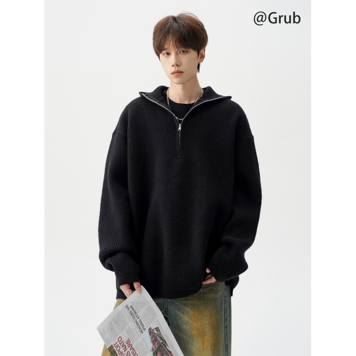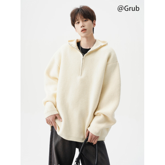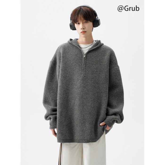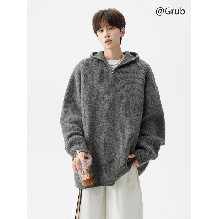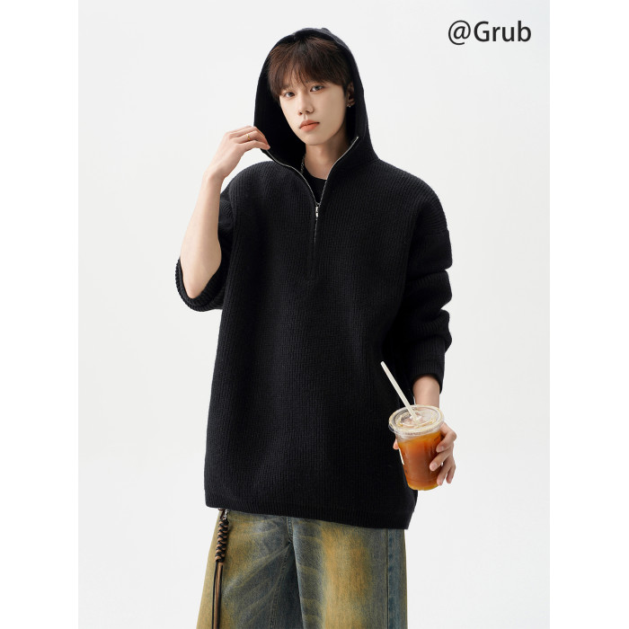半拉鍊連帽針織衫男冬季潮牌寬松cleanfit毛衣慵懶高級感情侶外套