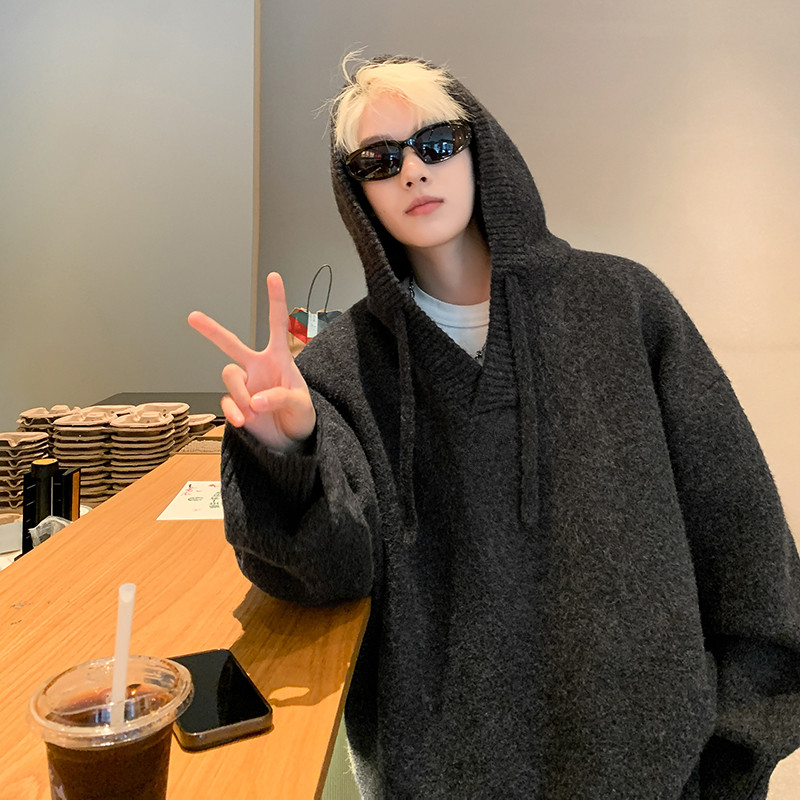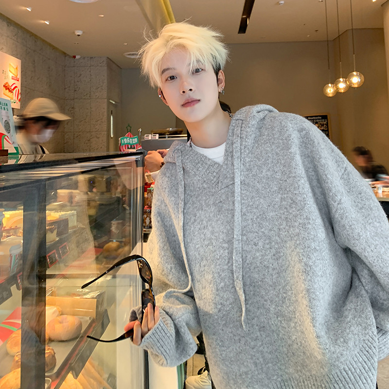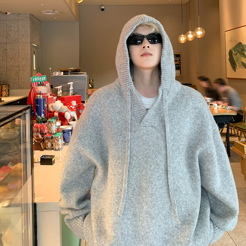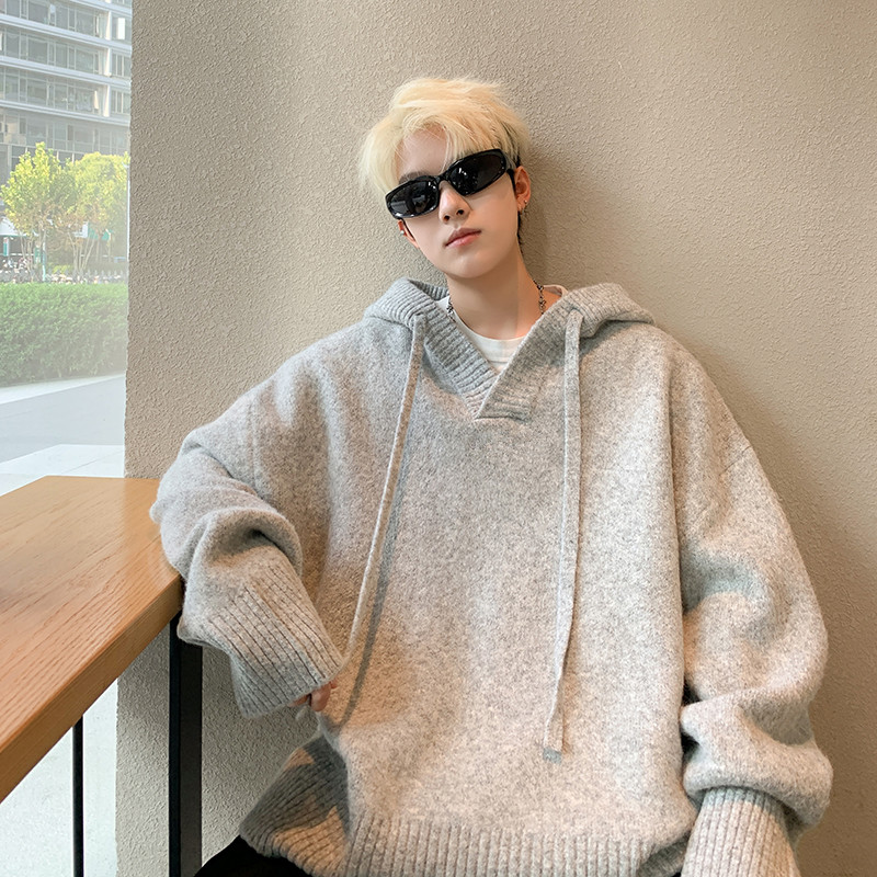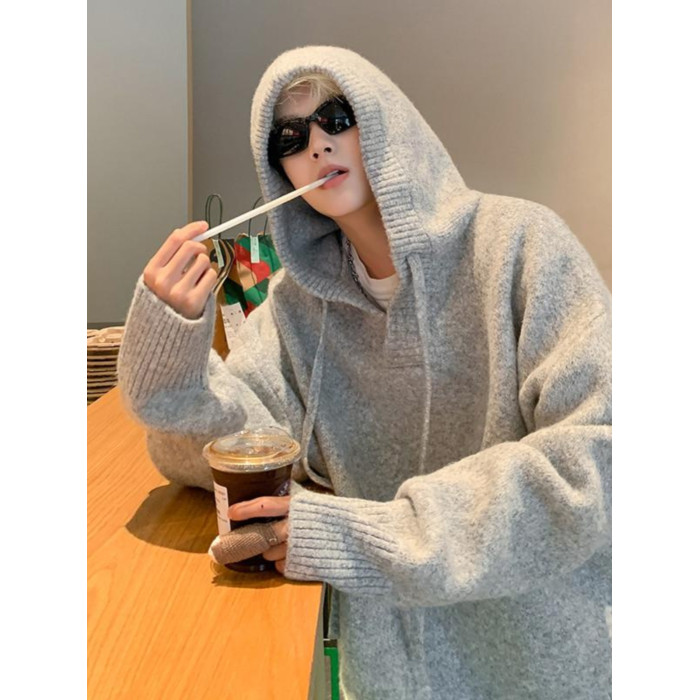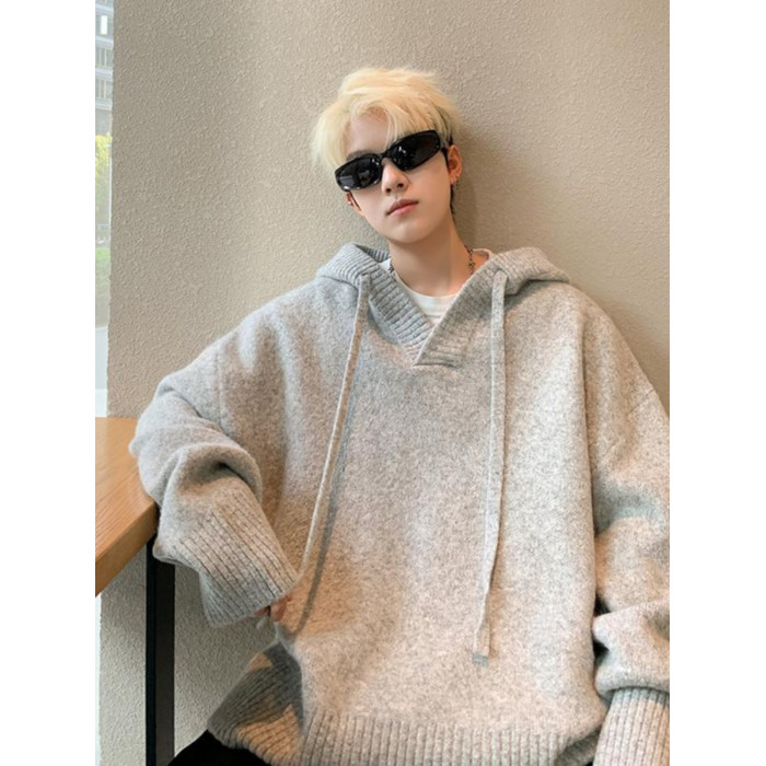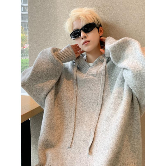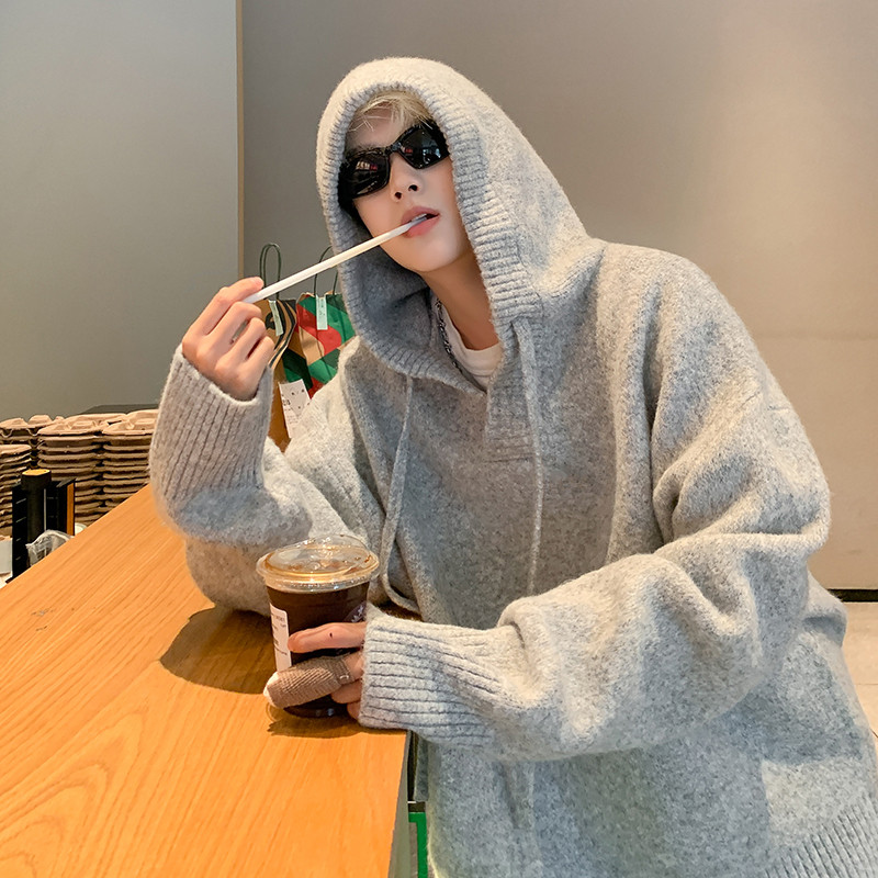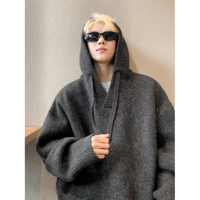 灰色連帽毛衣男秋冬季新款痞帥慵懶風寬松加厚套頭情侶針織衫外套