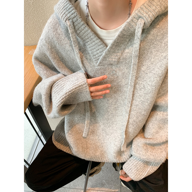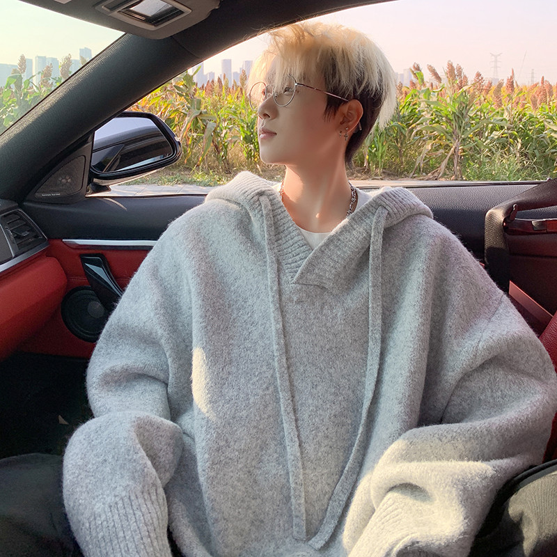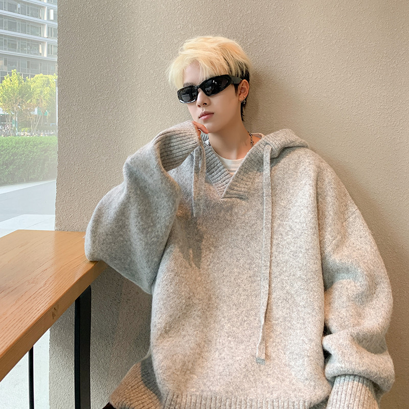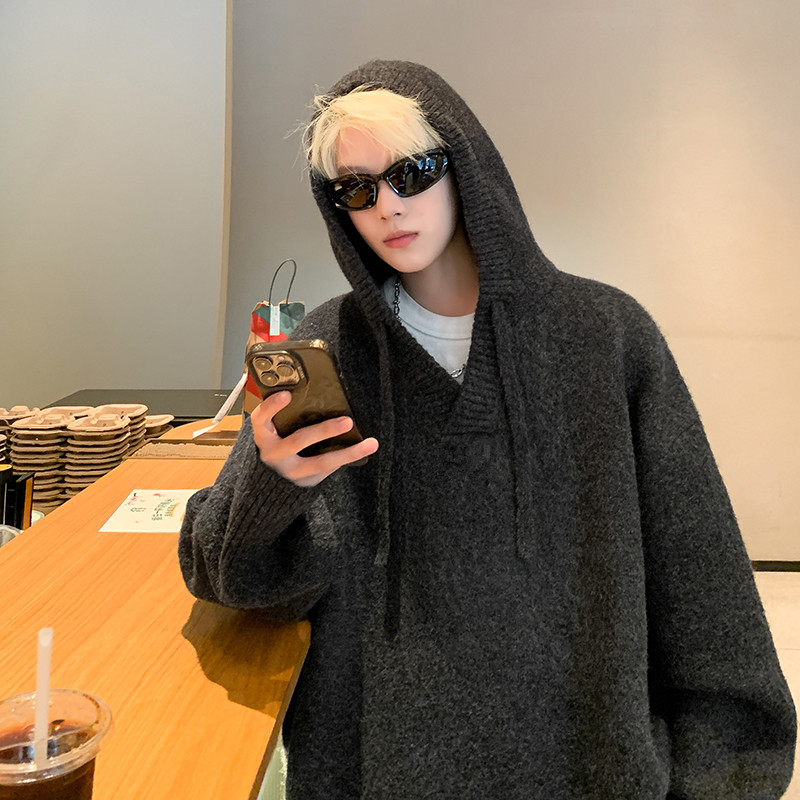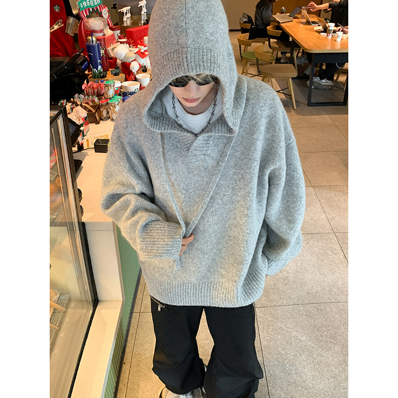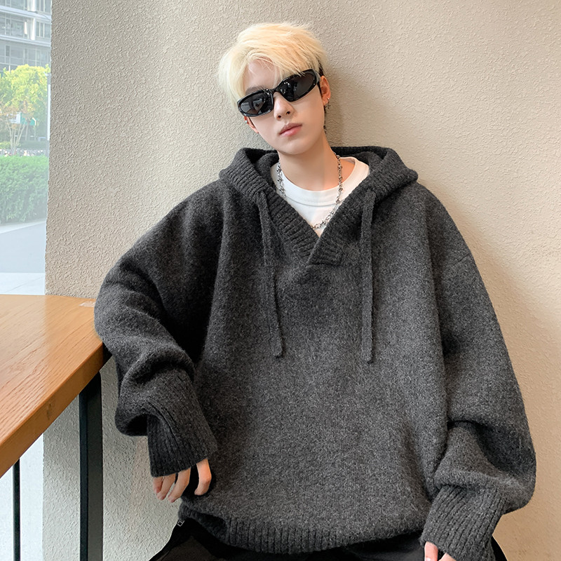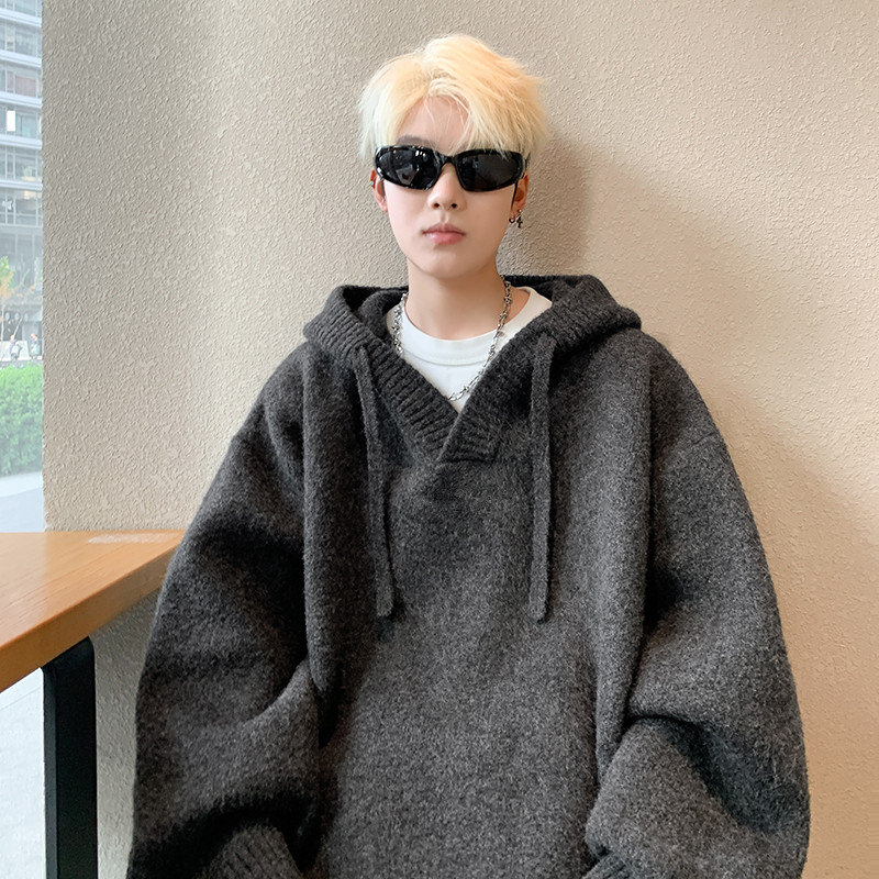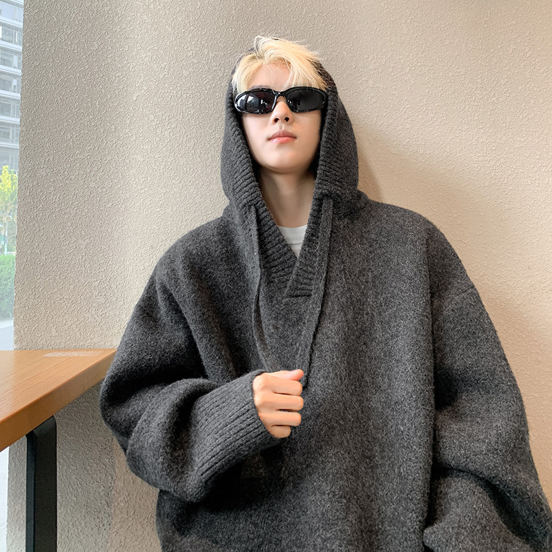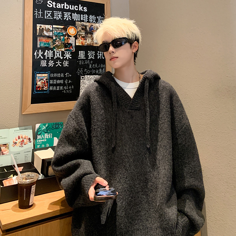 灰色連帽毛衣男秋冬季新款痞帥慵懶風寬松加厚套頭情侶針織衫外套