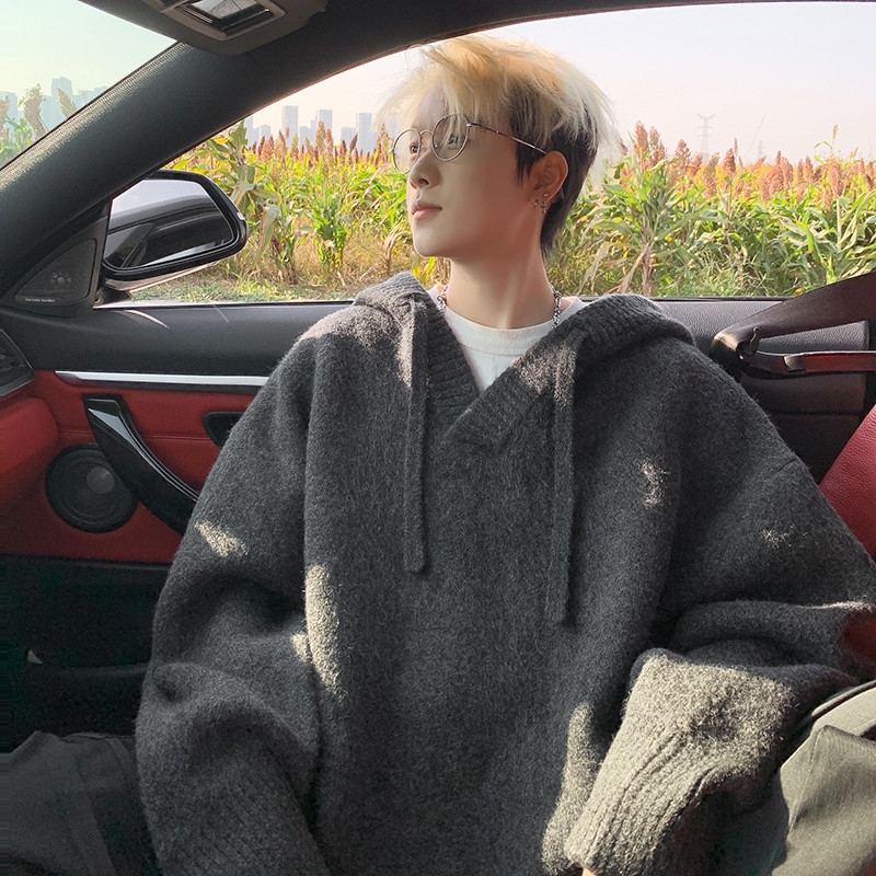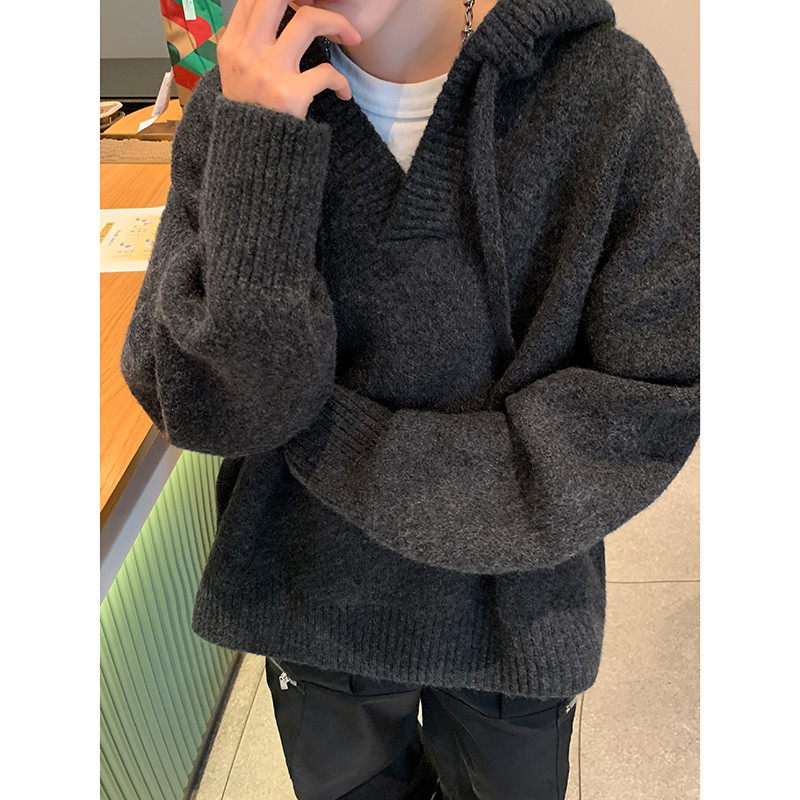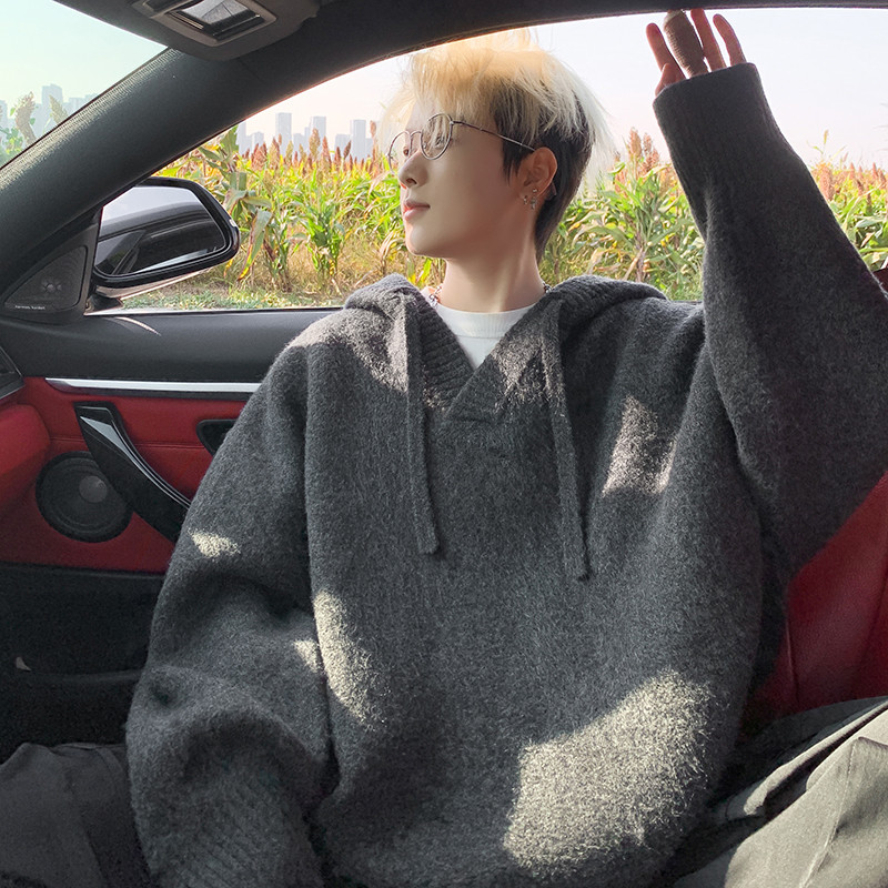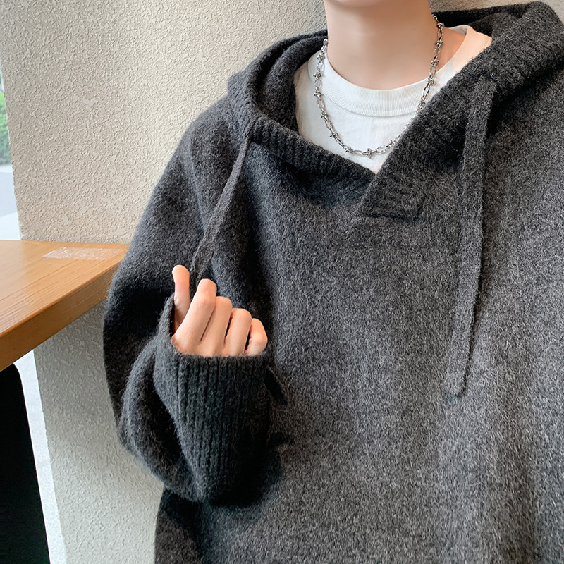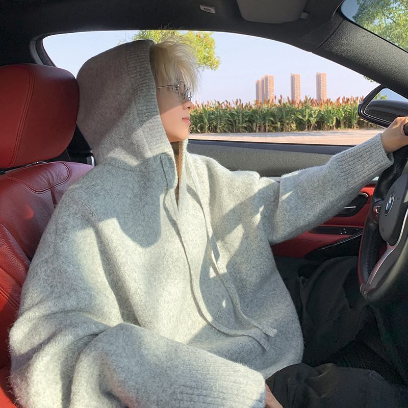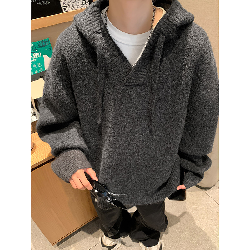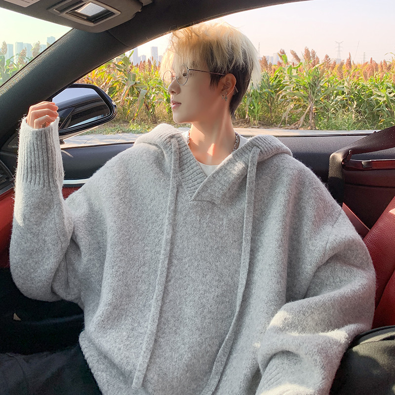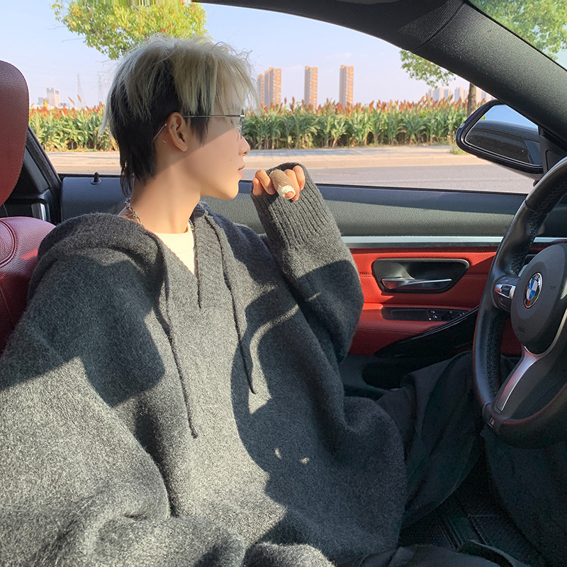 灰色連帽毛衣男秋冬季新款痞帥慵懶風寬松加厚套頭情侶針織衫外套