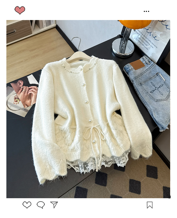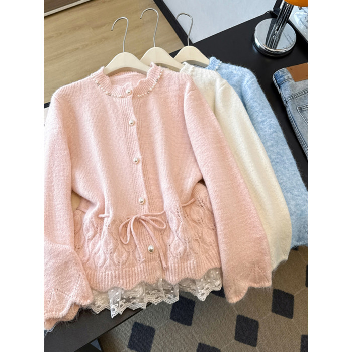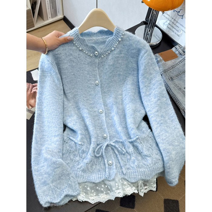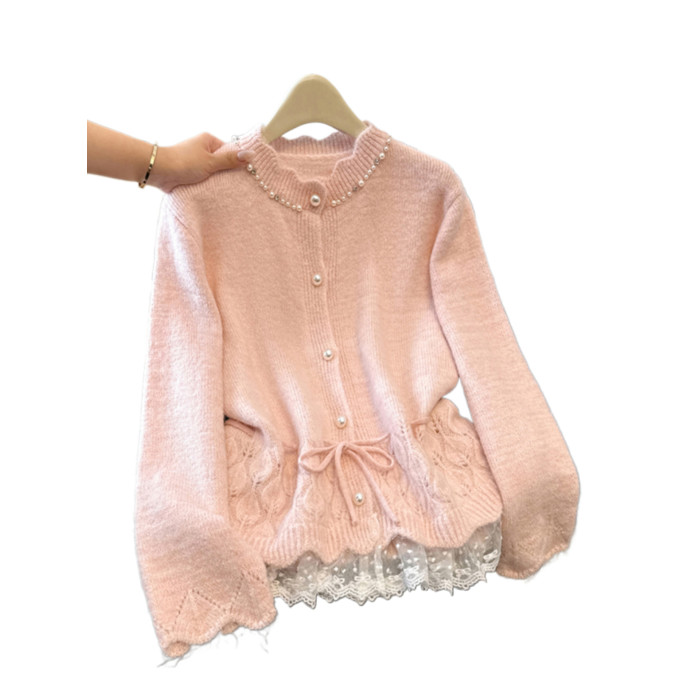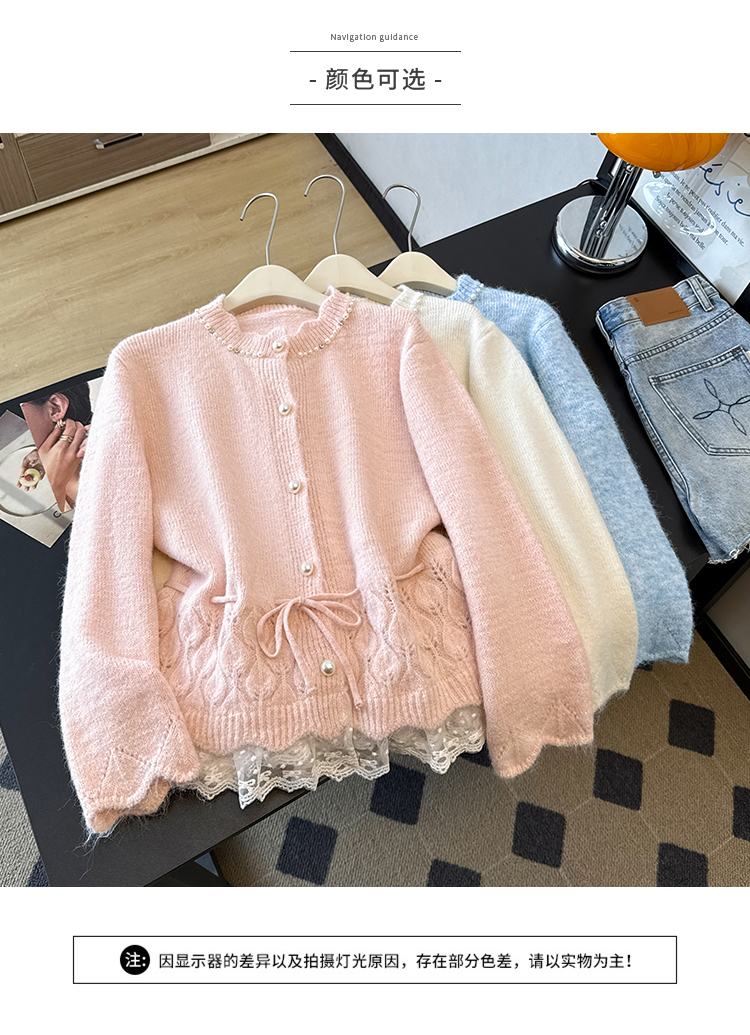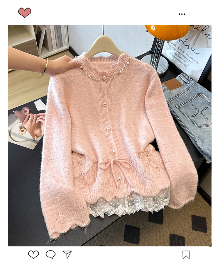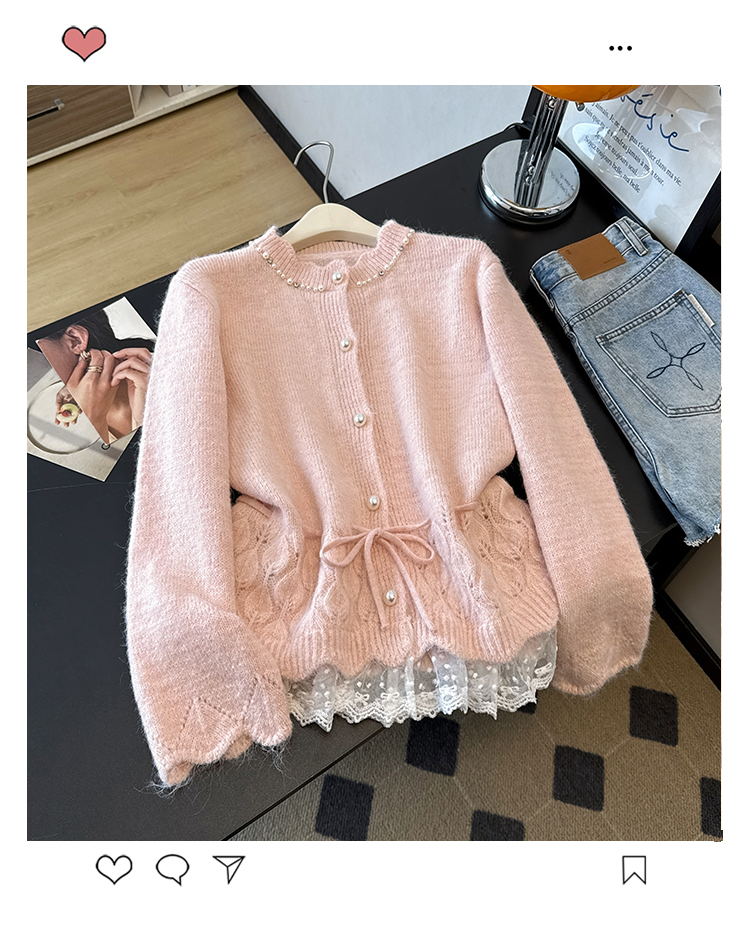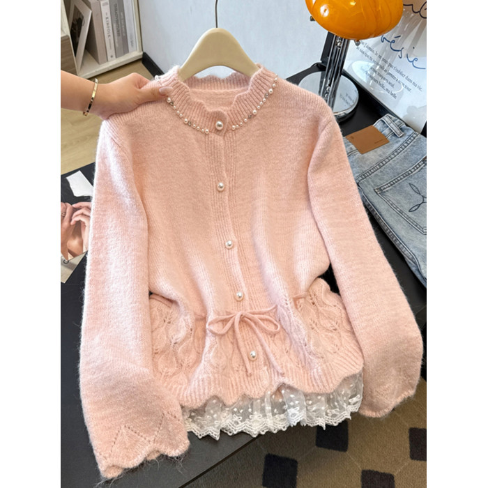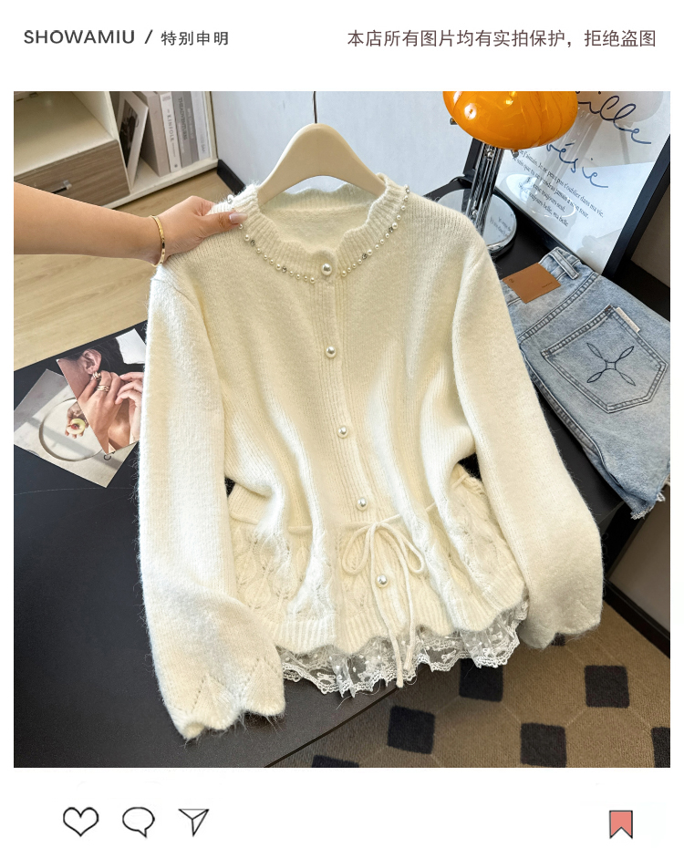 法式釘珠巨好看針織開衫毛衣女秋冬大碼胖mm系帶收腰蕾絲拼接上衣