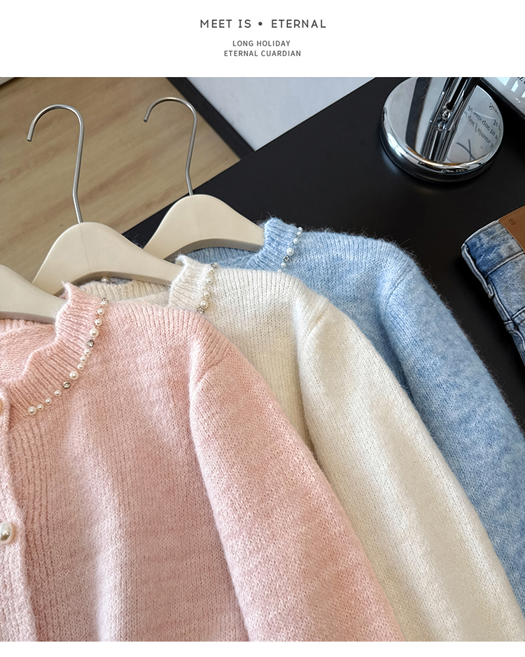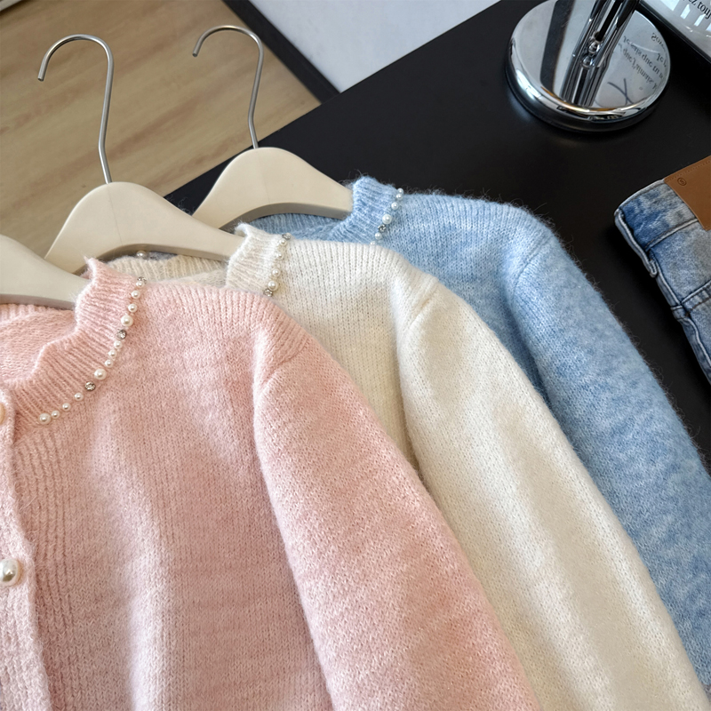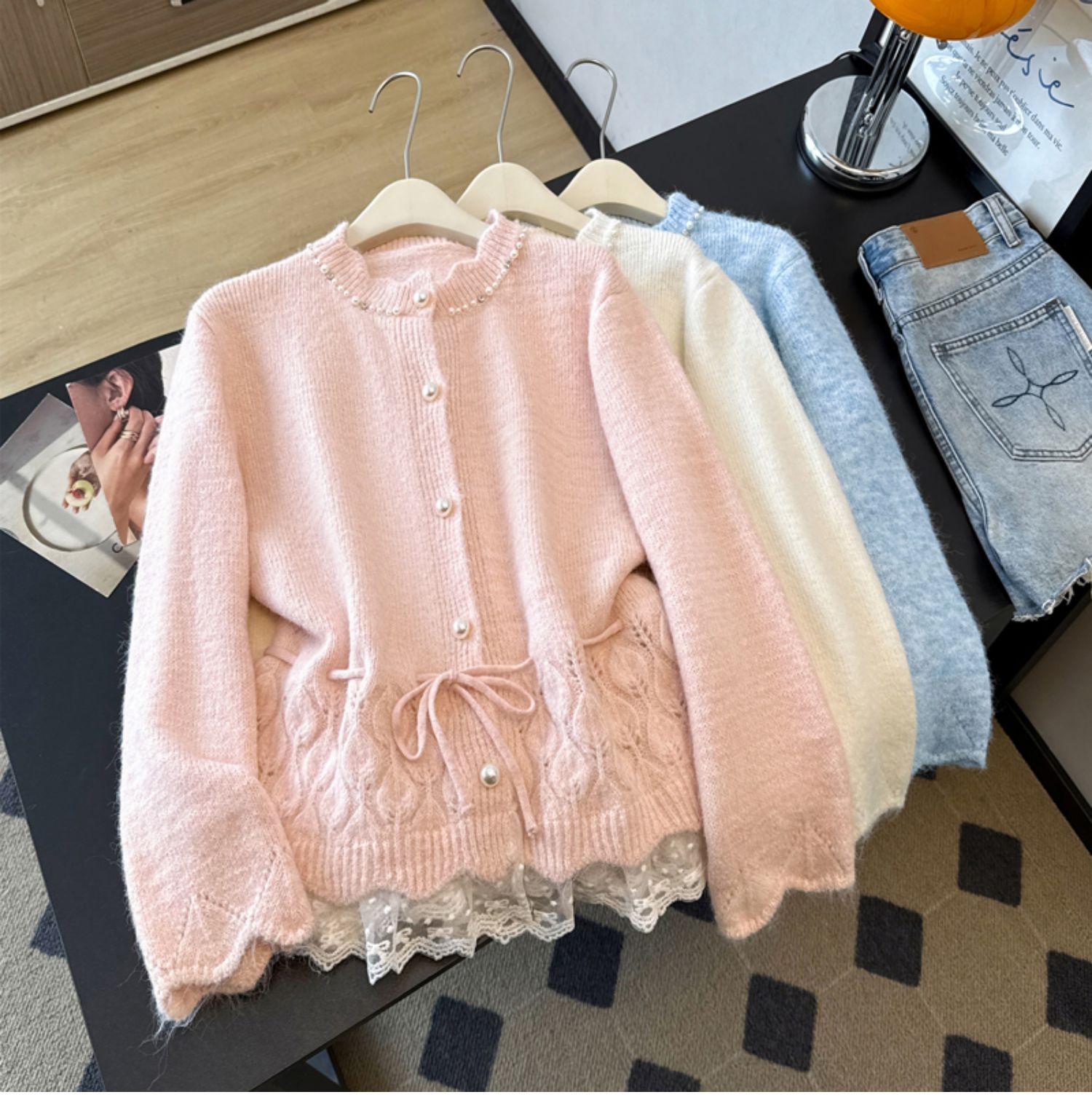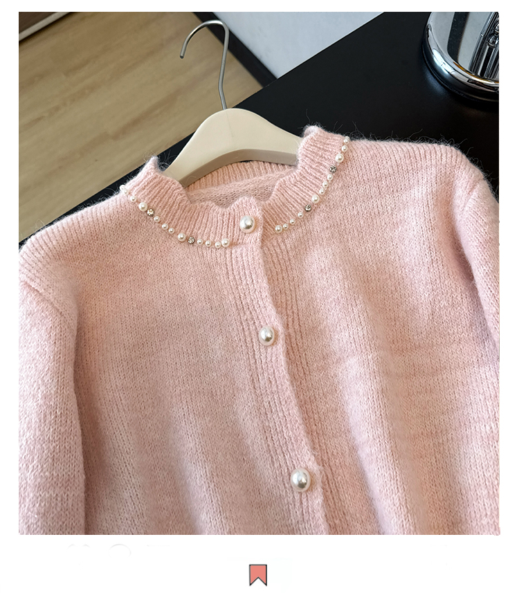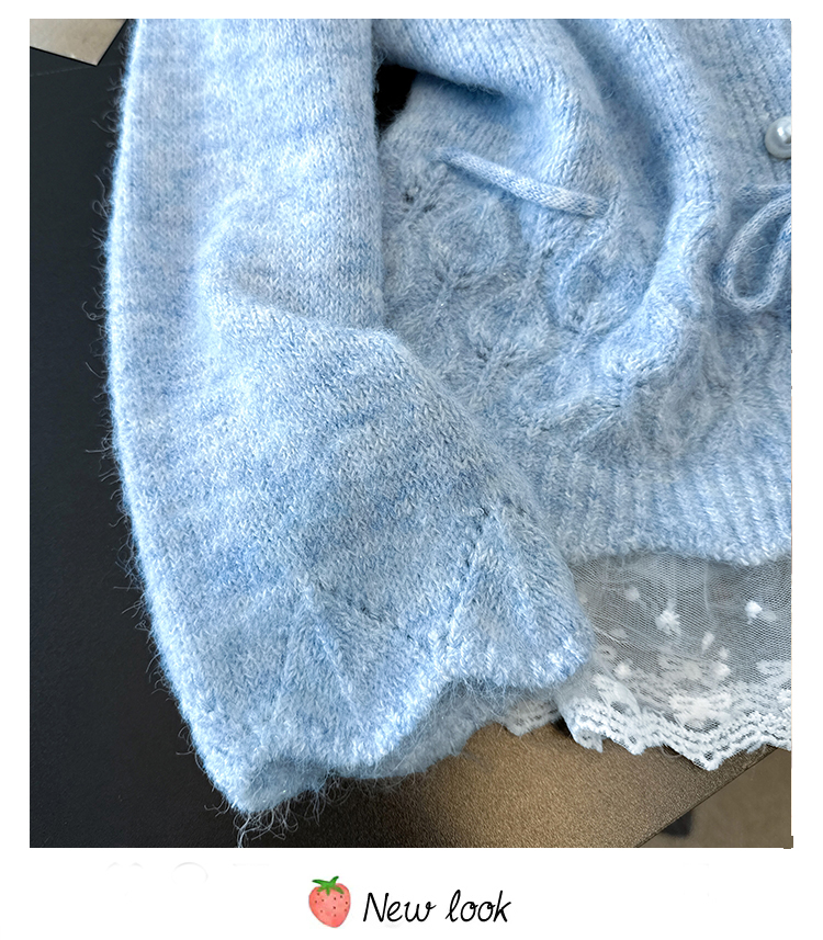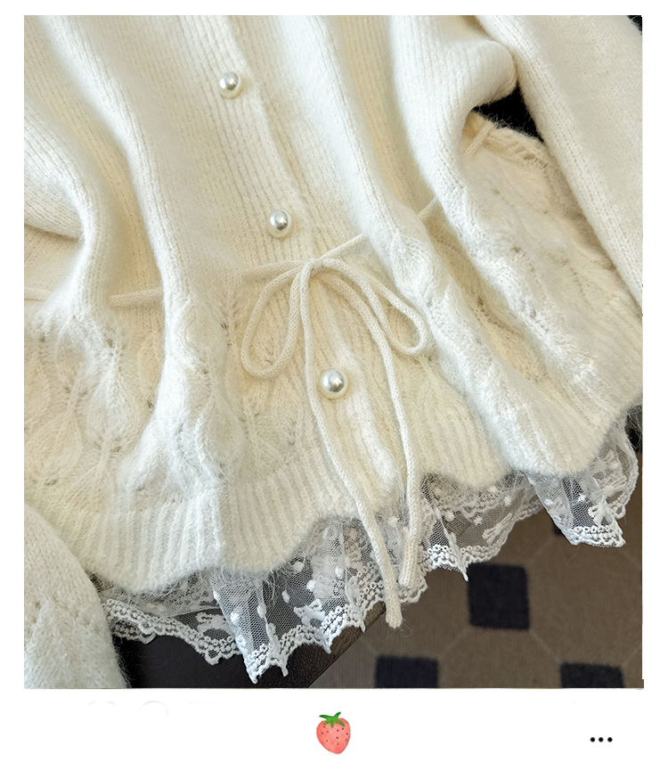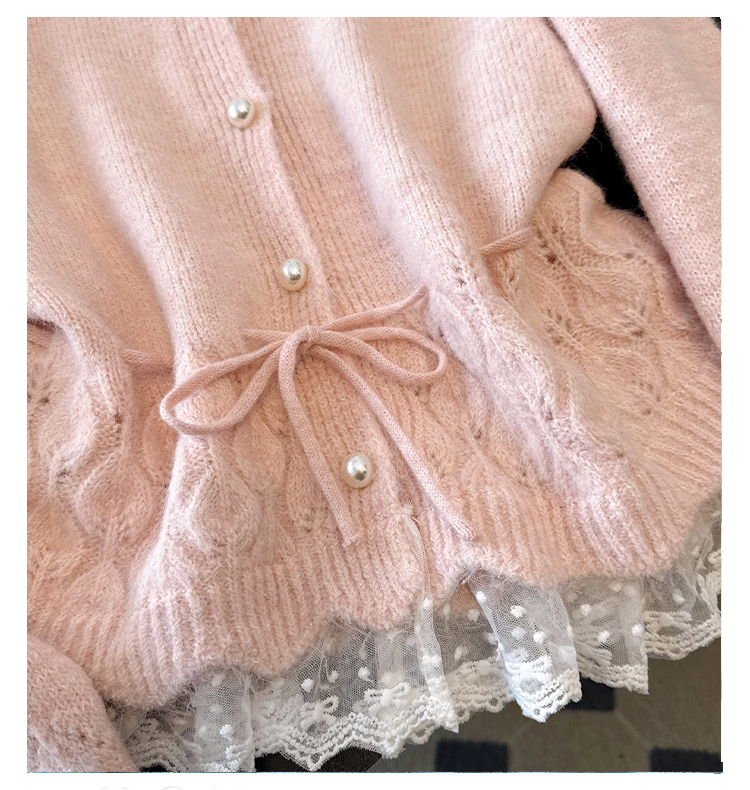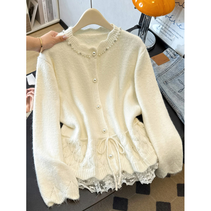 法式釘珠巨好看針織開衫毛衣女秋冬大碼胖mm系帶收腰蕾絲拼接上衣